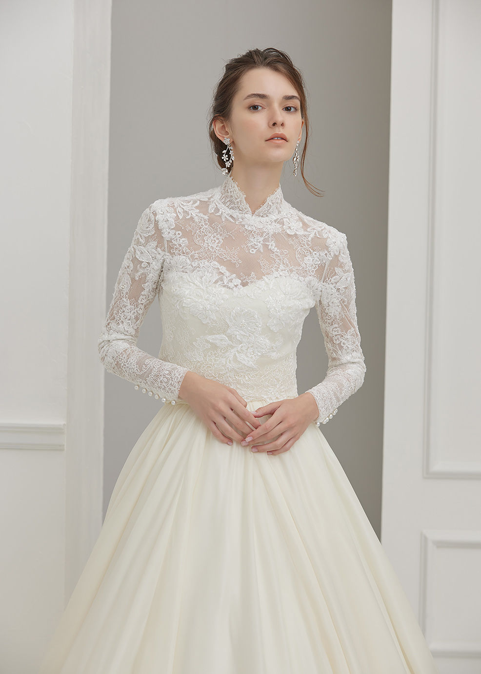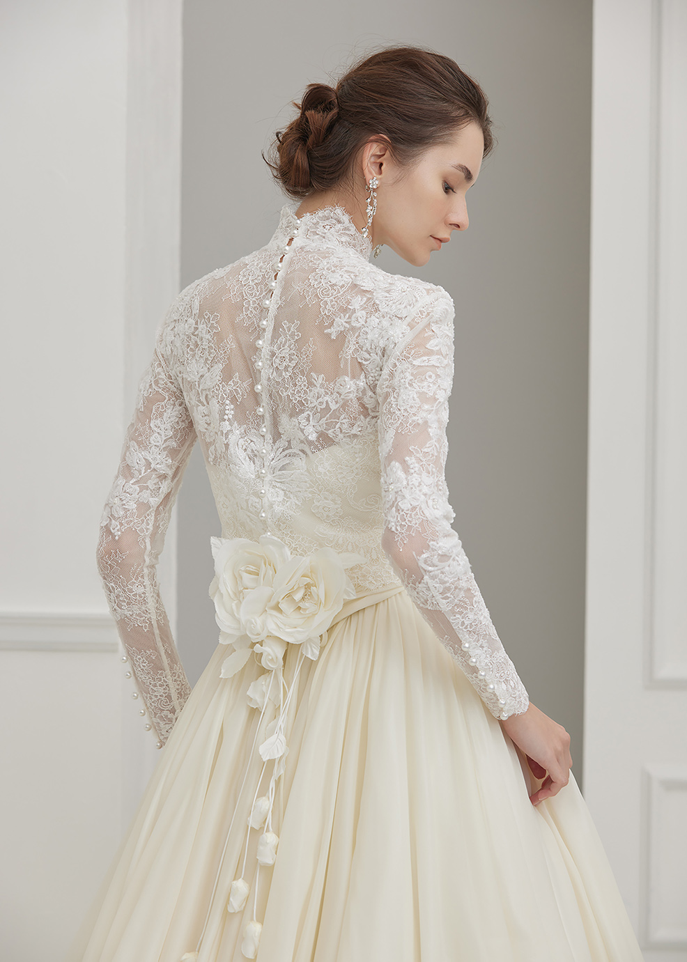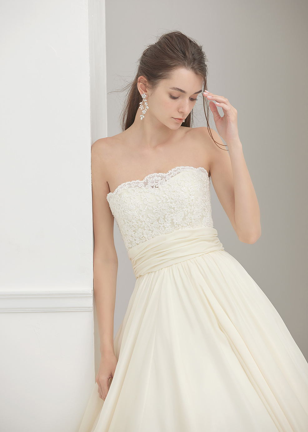 艶やかなカクテルサテンが揺れ動くソフトAライン。花嫁が動くたびにサラサラと流れる素材感が優しく優雅な表情を作ります。