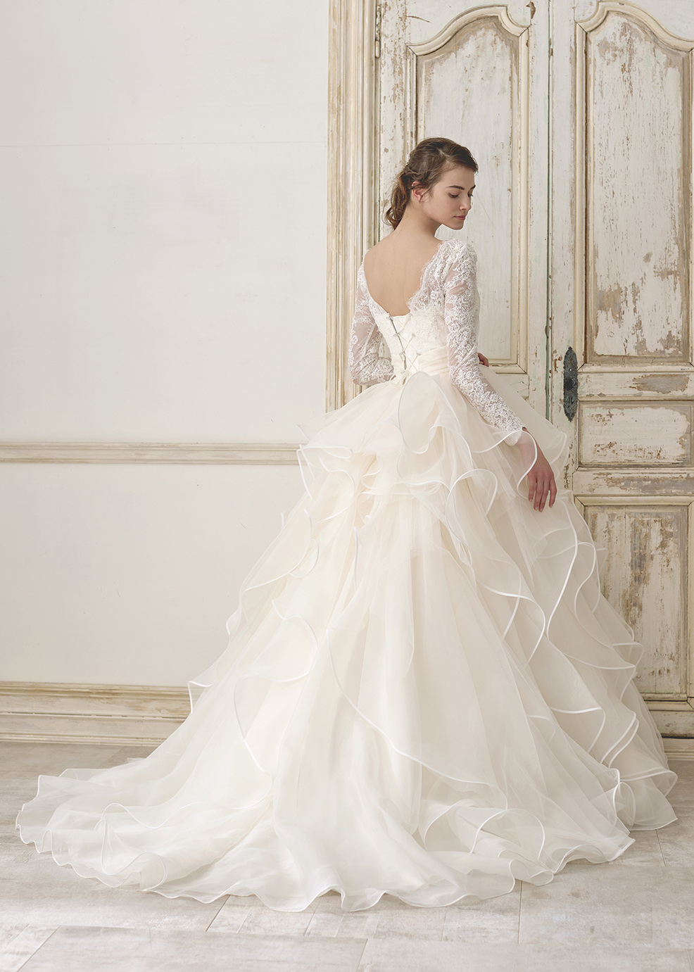 スカートひと周りをオーガンジーのフリルであしらい、パーソナルオーダーの袖をあわせることで、インポートドレスのようなトレンド感あふれるスタイルに。たっぷりあしらったフリルの見た印象のボリューム感に対し、とても軽く、動きやすい着用感に仕上がっています。会場映えする華やかさと、アレンジの楽しみや機能性を合わせ持ったドレスです。
