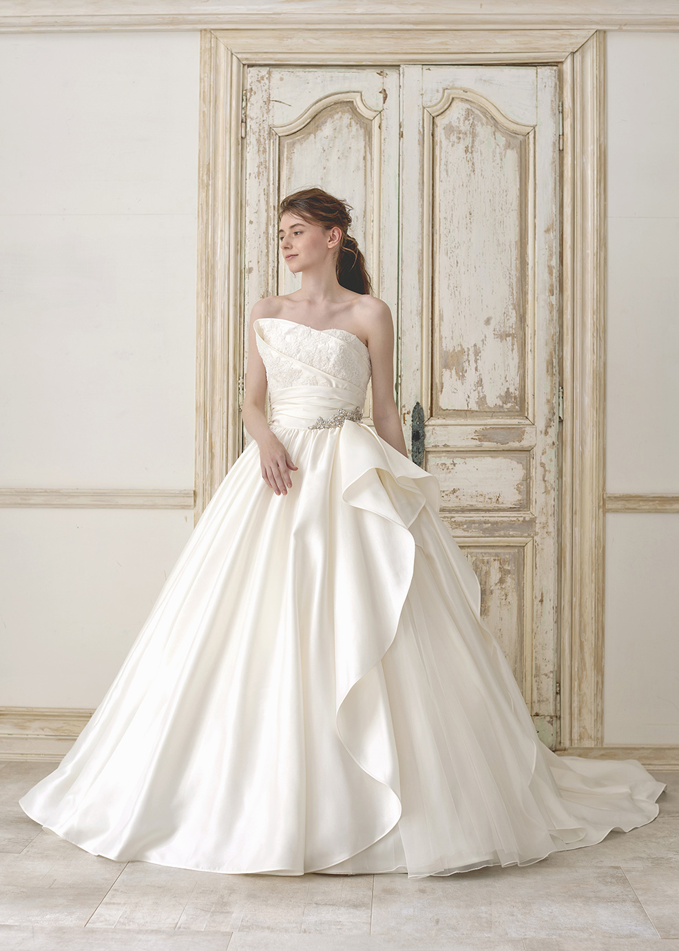 ビックサイズの花嫁様にも着やすい、アシンメトリータイプのドレス。通常のパーソナルオーダードレスよりもウエストラインを下げ、くびれを強調したデザインを採用しています。スカートの大きなラッフルもスタイルにメリハリをつけ細見え効果抜群のラインに。