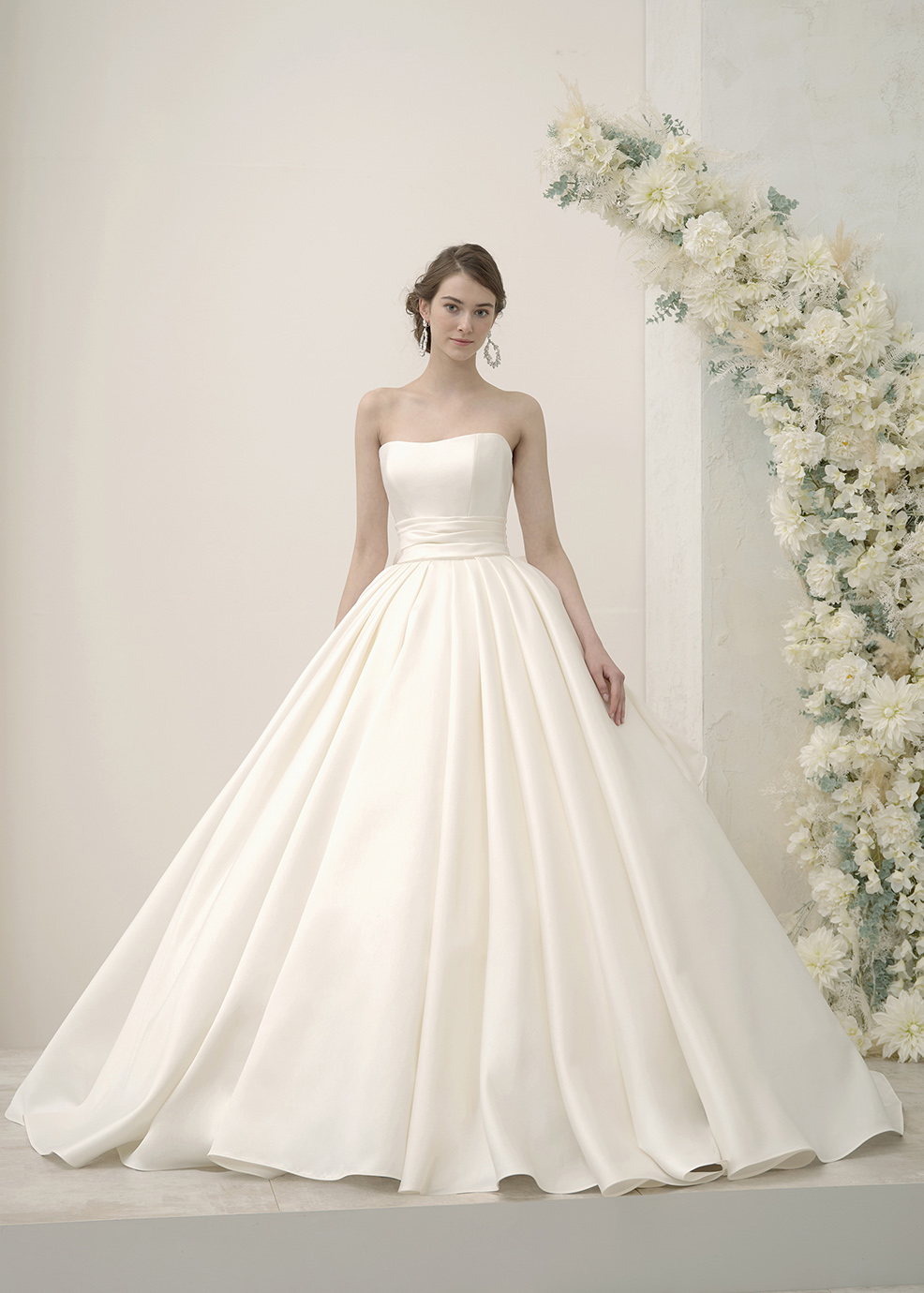 すっきりしたシンプルなフロントスタイルは、トップをコンパクトにみせるようにベルトや身頃の高さにこだわりました。バックスタイルはミカドドレスの張り感をいかした立体的なフリルをデザインし印象的な後ろ姿に仕上げました。後ろスカートはソフトチュールで仕上げ、柔らかい透明感ある印象です。