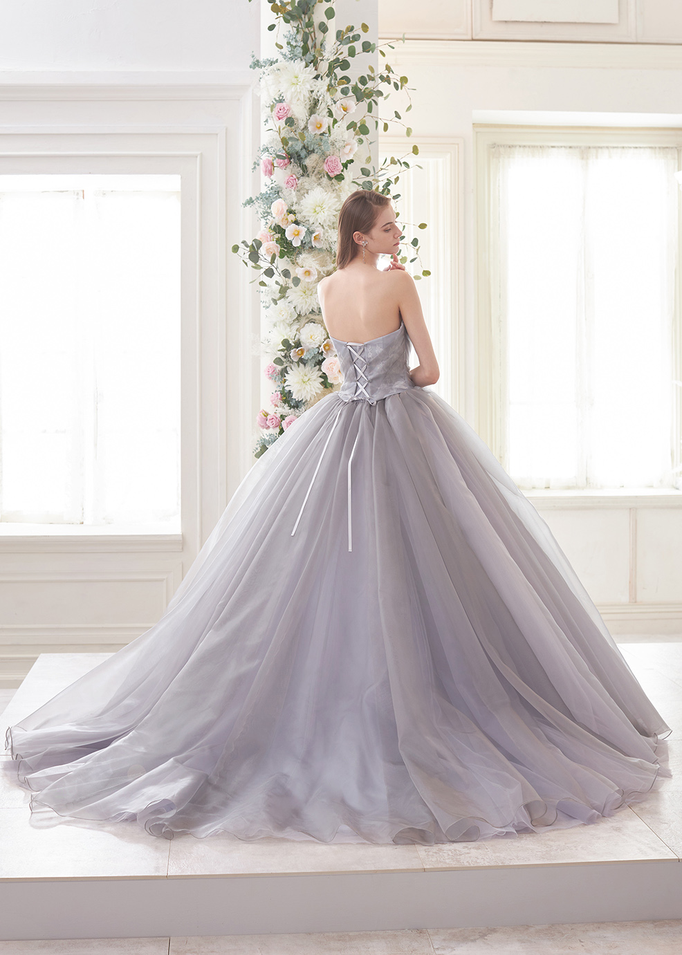 チュールとオーガンジーのようでハリがある特徴的な新素材をたっぷりと使用したビックプリンセス。リバーレースを下に忍ばせた透明感とウエストの深いタックと空気を含んだようなブラウジングスカートが軽やかな印象に。奥行きのあるカラーグラデーションに見えるドレスです。
