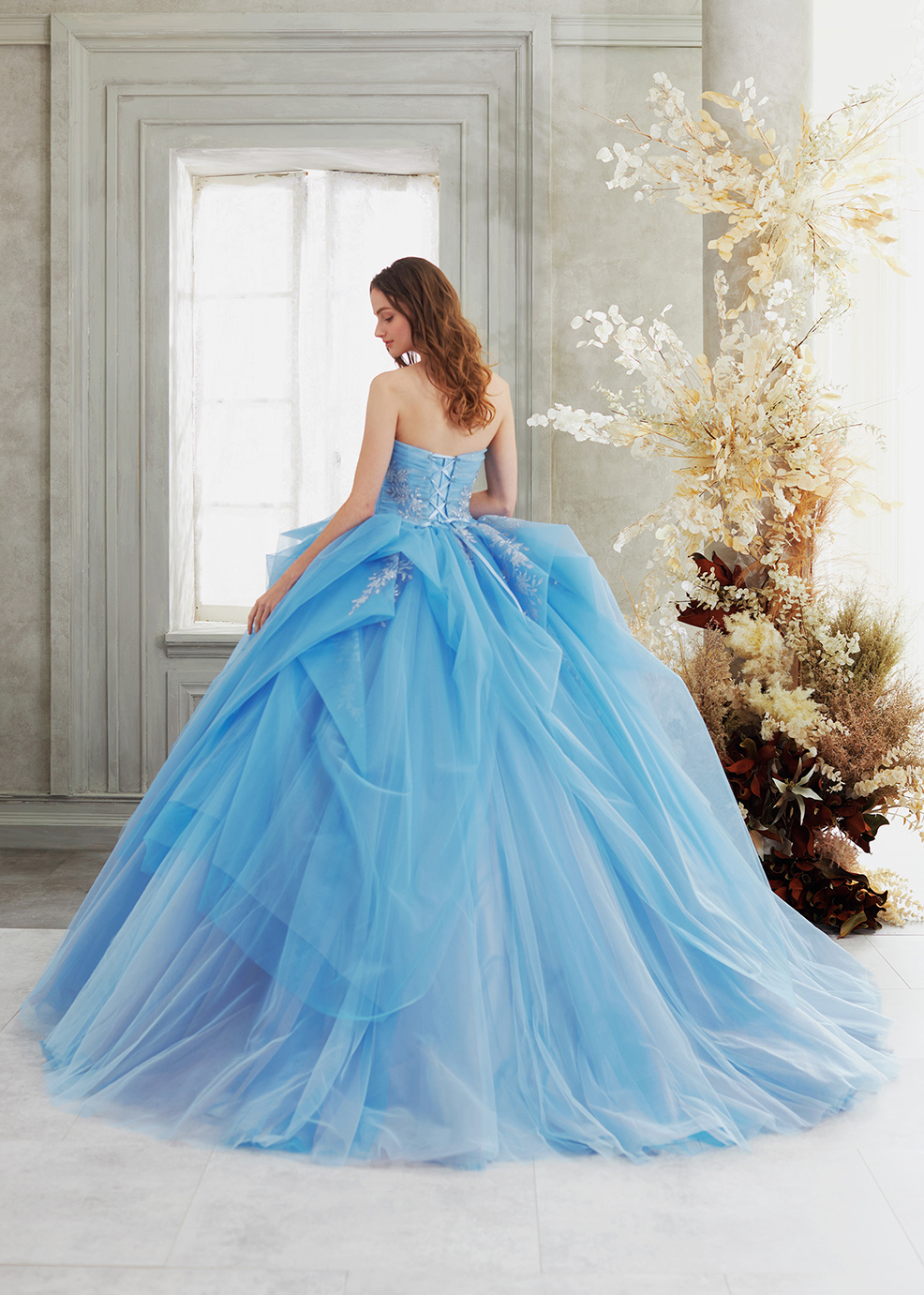 ボリューミーなチュールのブラウジングスカートが空気を含んで動きを感じさせるドレス。グリッターの輝きがドレープ身頃からスカートにかけて流れを作り、表情豊かに演出します。鮮やかなブルーの発色が爽やかで新鮮な印象に。