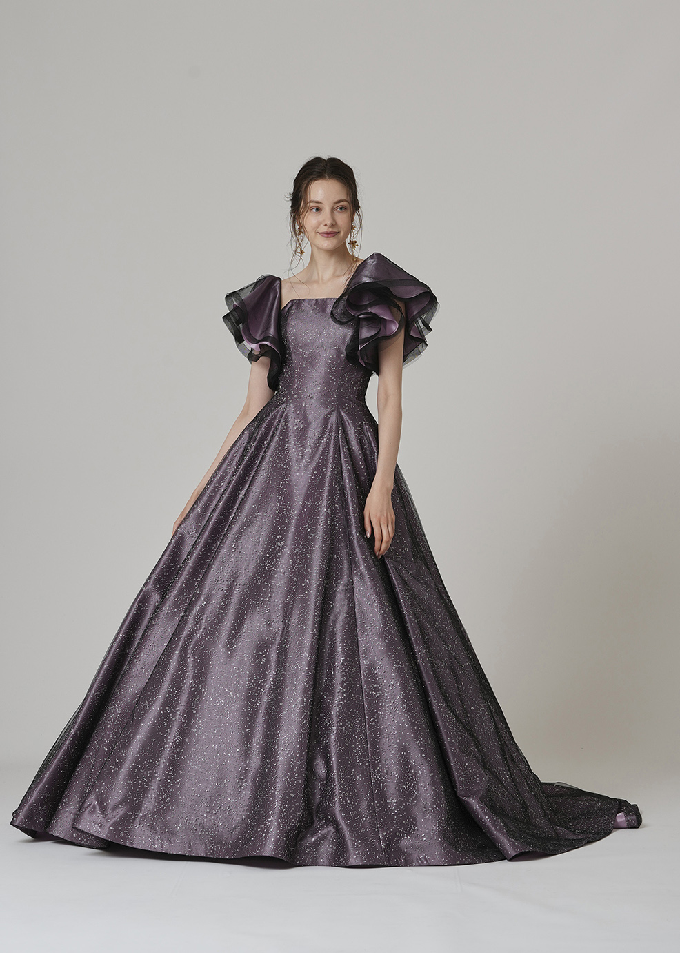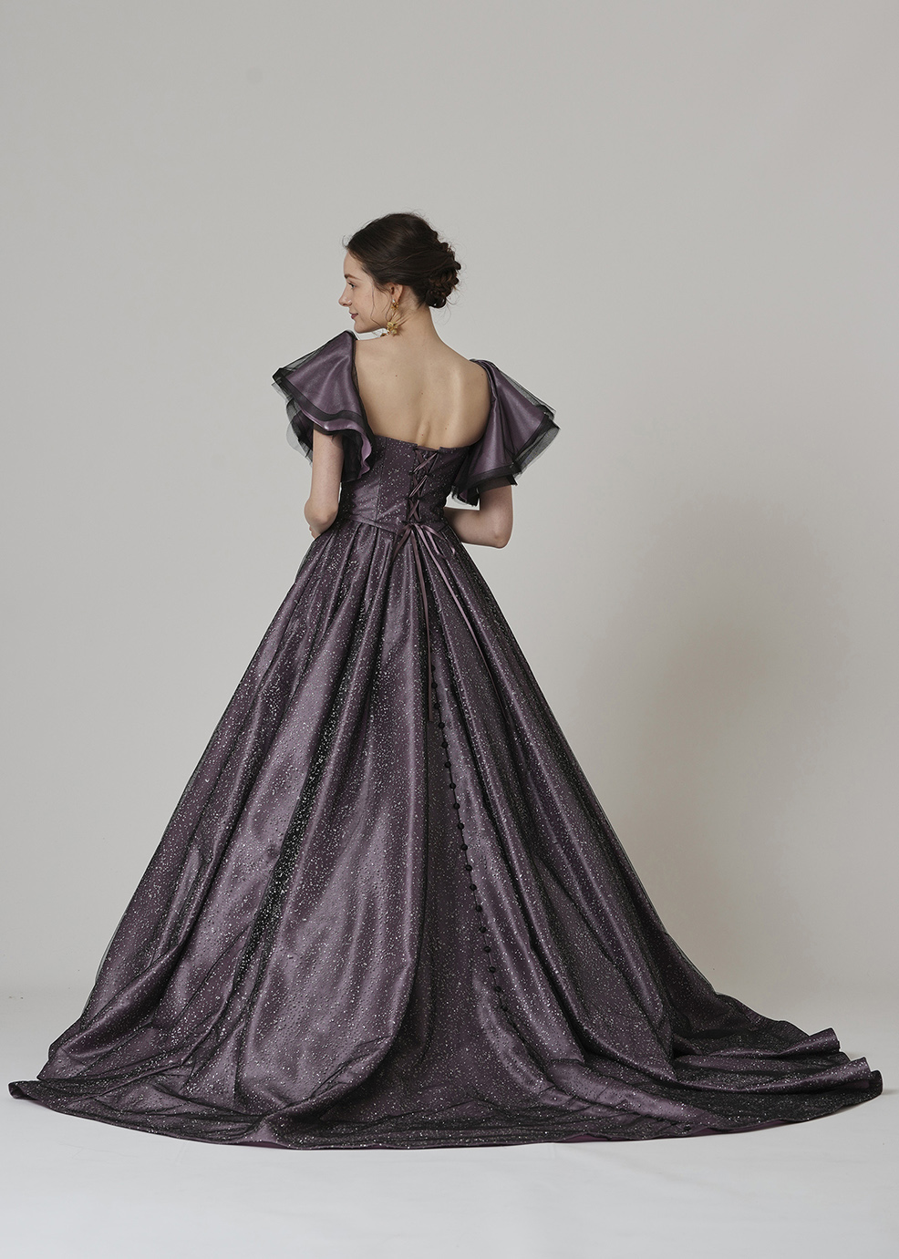 グリッターを全身に使用し、色合いやシルエットでモード感を表現したカラードレスです。胸元のラインはスクエアに作りシャープな印象を強調しています。黒で作られた後ろスカートにつけられたくるみボタンがこのドレスのデザインポイントです。立体的なフレア感が特徴の取り外し式のお袖を付けていただくと、華やかなかわいらしさがプラスされます。