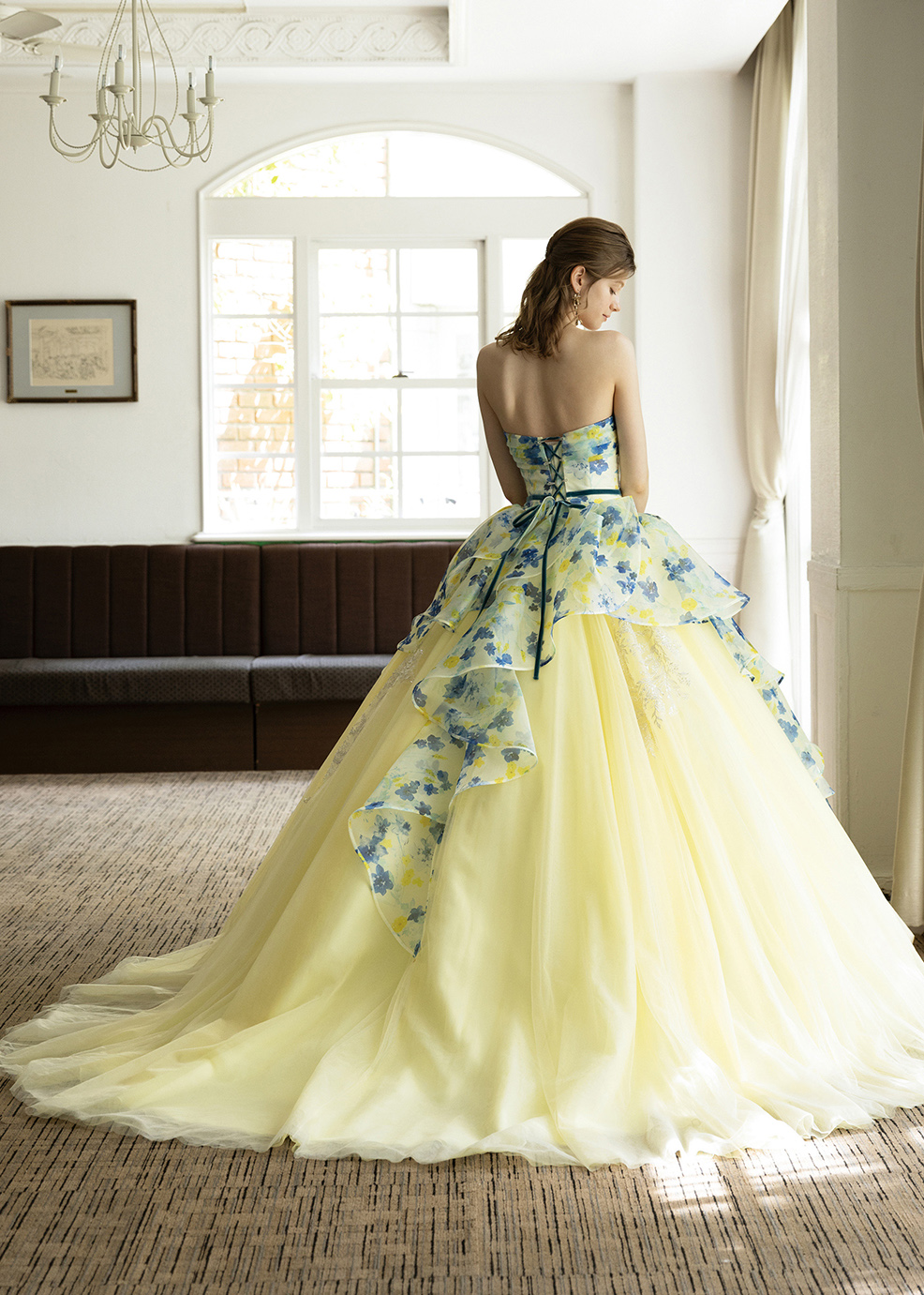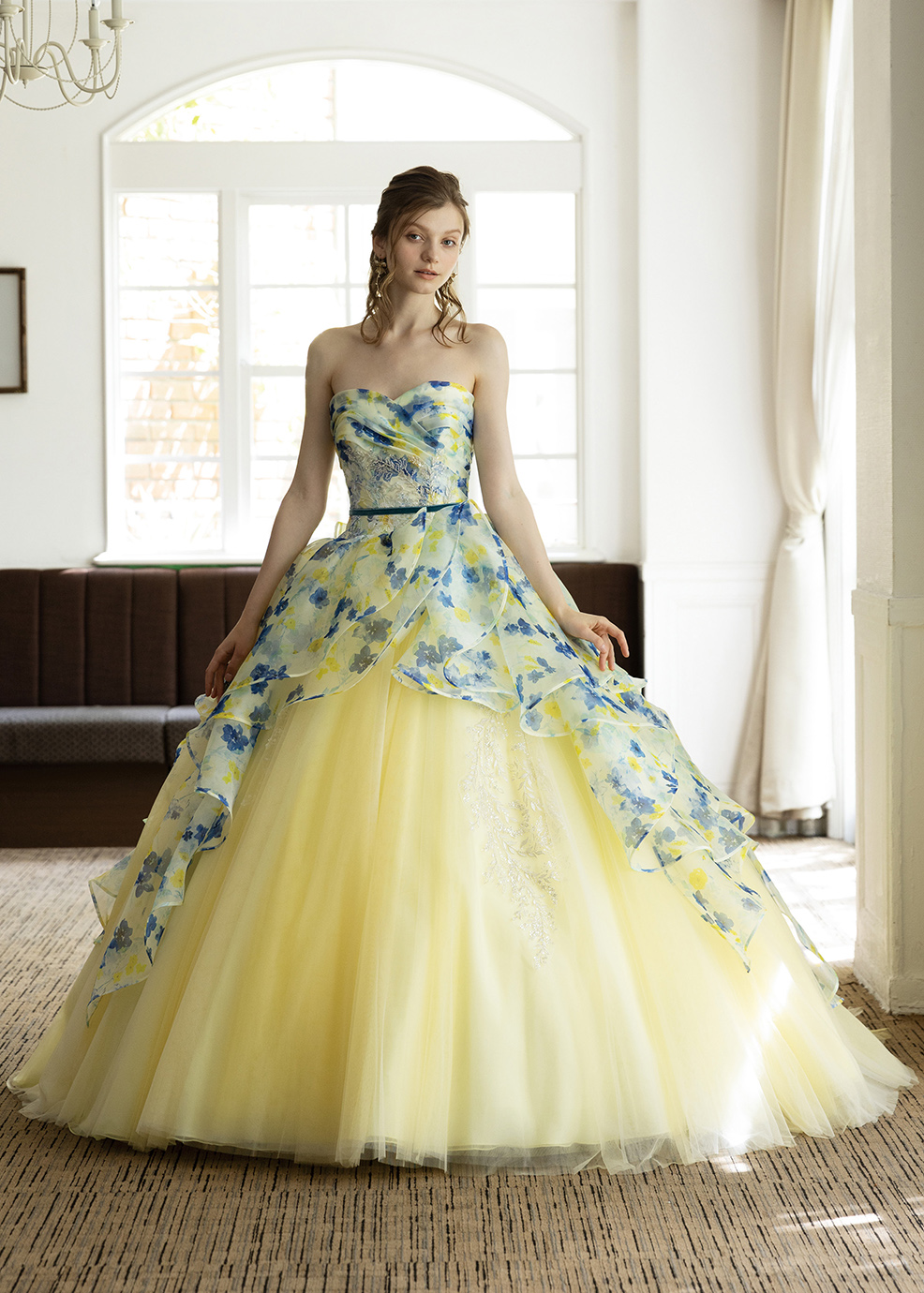 小柄組織による表情感と、ブライト糸使いによる華やかな光沢が特徴のマイクロハニカムオーガンジーにオリジナルのフラワープリントを加工しました。スカートのフリルは蝶の可憐なイメージを表現しています。トップスはドレープを施してウエストマークをスッキリと映るようにデザイン。ビーズレースをプラスして上品に仕上げています。イエローとブルーの対比色の組み合わせは印象に残る1着。