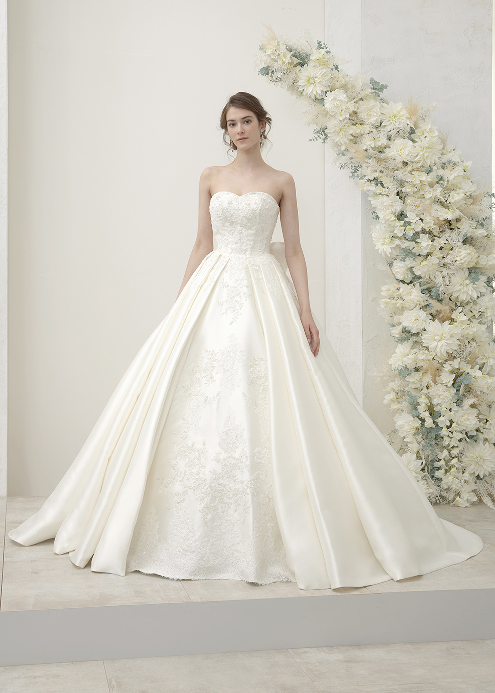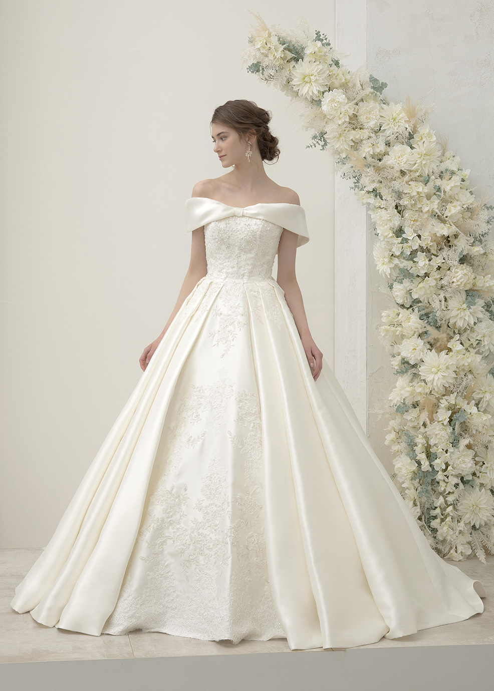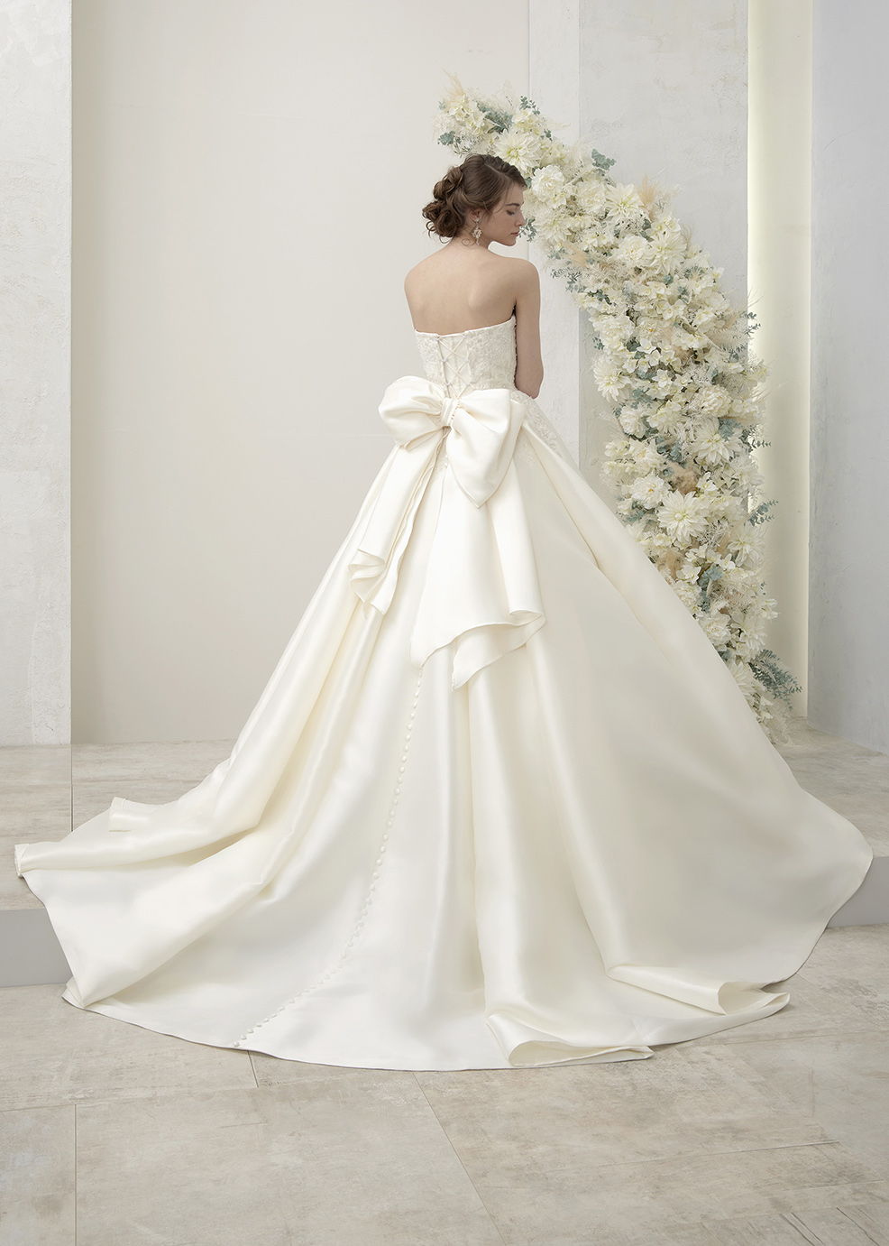 ミカドをたっぷりと使用した王道ビックプリンセスライン。リボン型のロールカラーは胸元を華奢に美しく魅せ、気になる二の腕ラインを綺麗に隠してくれます。フリルとお花を加工した2種類のレースをミックスしてクラシカルな中に可愛らしさをプラスしています。バックスタイルにはビックリボン+クルミ釦+ロングトレーンと花嫁様が大好きな要素をふんだんに取り入れた1着です。