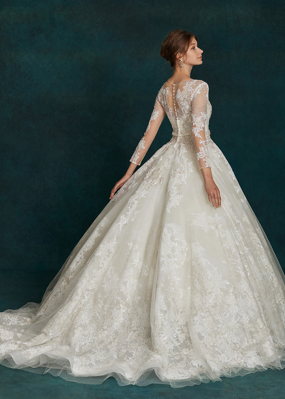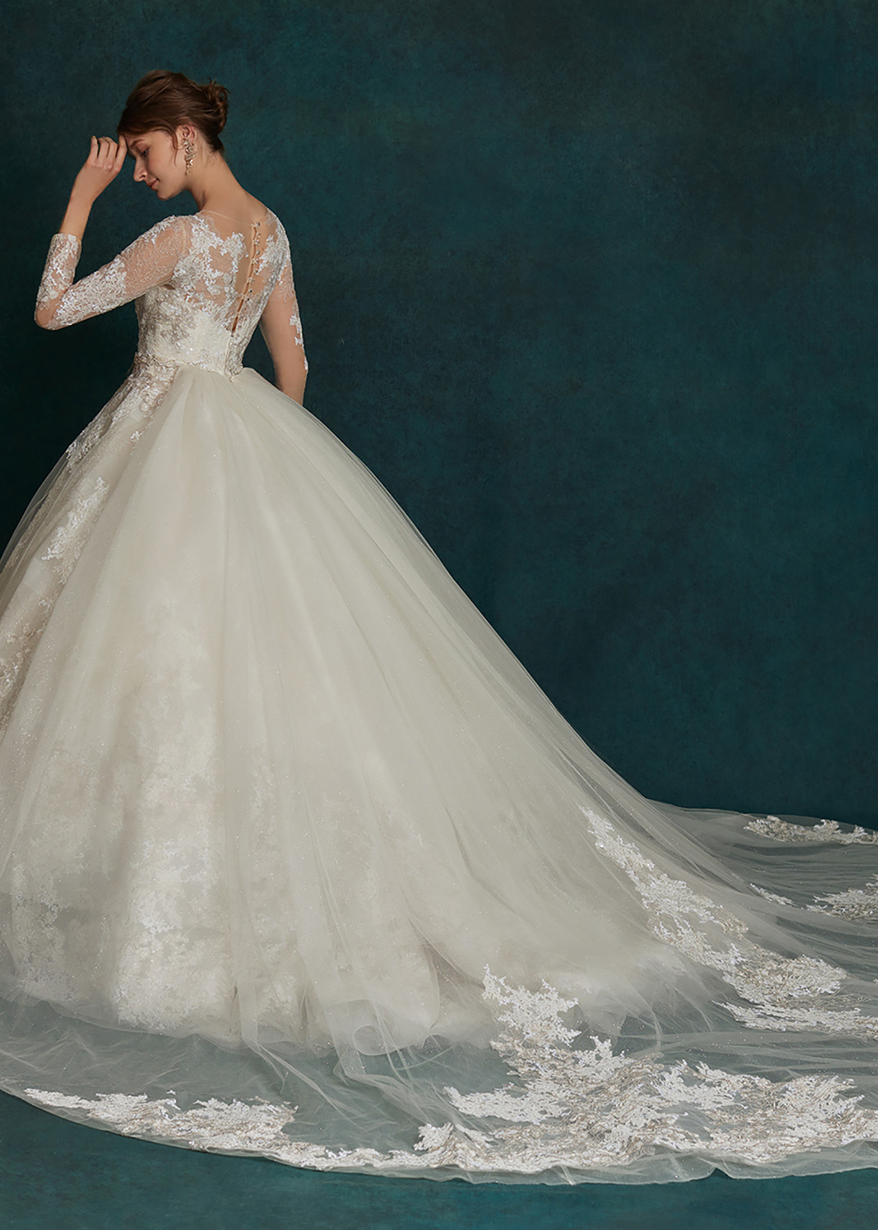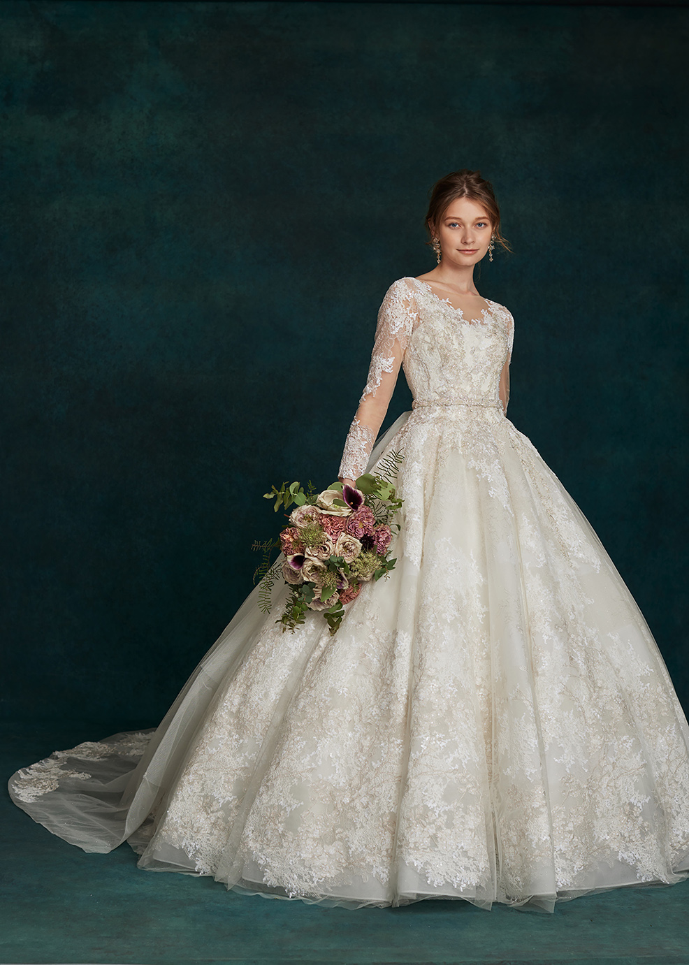シルバー糸とスパンコールが細かに入り組んだ柄のレースをたっぷりと使用した総レースウェディングドレス。レースの繊細さに対してウエストから広がるボリューミーなシルエットが大胆でドラマティックな印象に。レースが素肌の上を彩るシースルーの長袖デザインは上品に露出を抑え、クラシカルで気品溢れる印象になります。