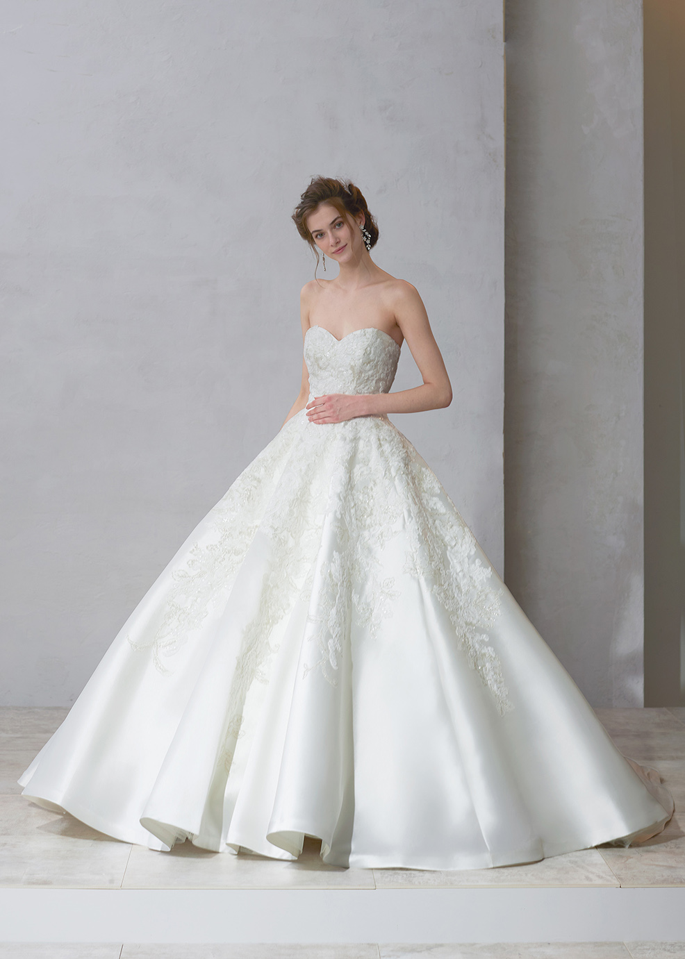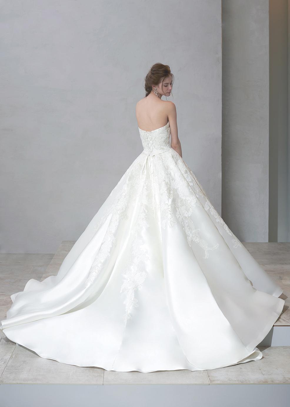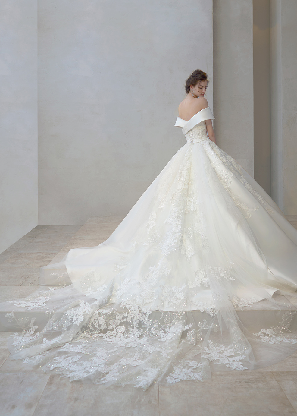 光沢とハリのあるミカド素材に、クラシカルなコードレースとグリッターを合わせて高級感のあるビックプリンセスウェディングに仕上げました。絶妙な幅のロールカラーはデコルテや交差する背中を綺麗なラインに見せてくれます。贅沢にちらしたレース&グリッターのロングトレーンでドラマティックなバックスタイルを演出します。