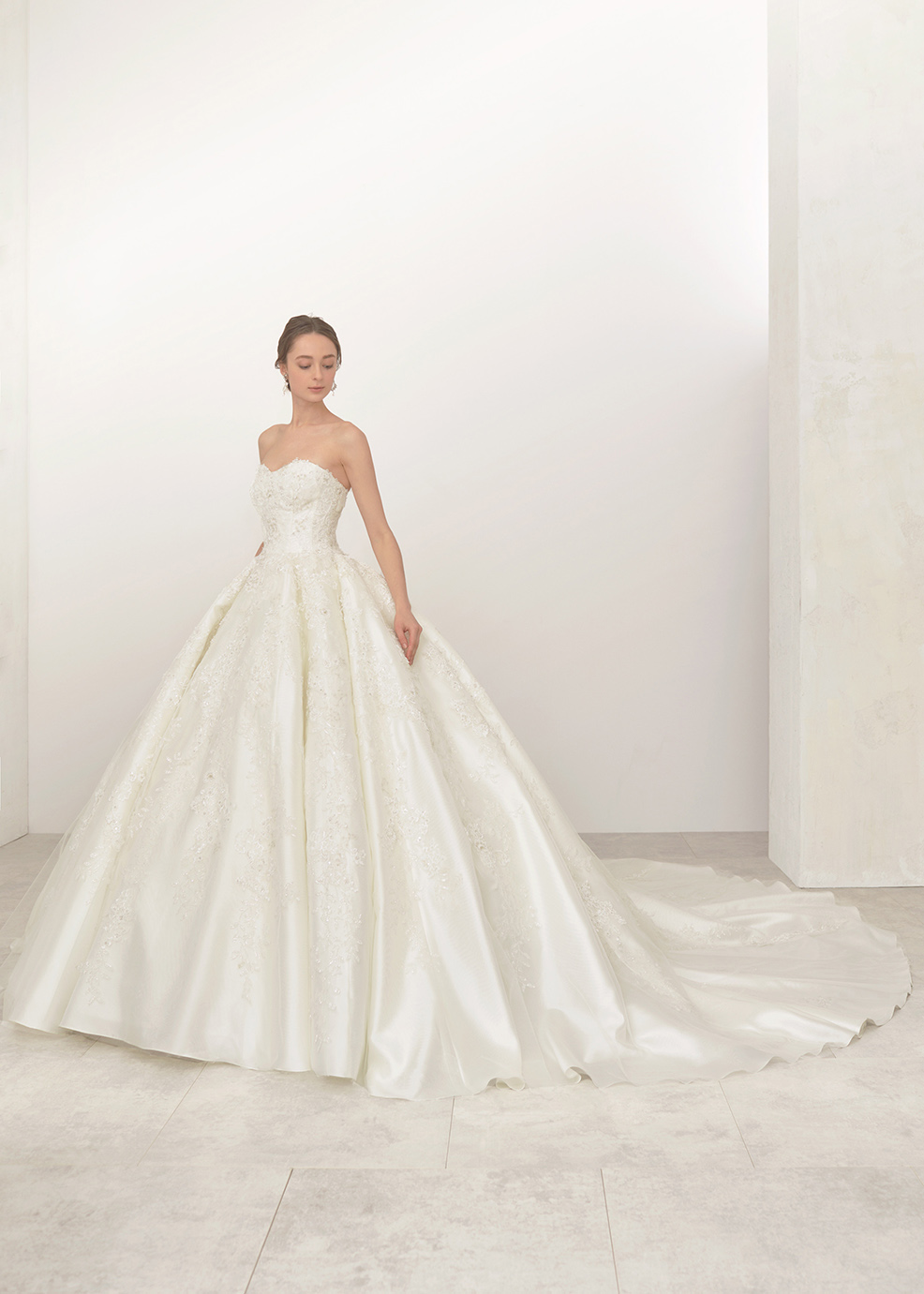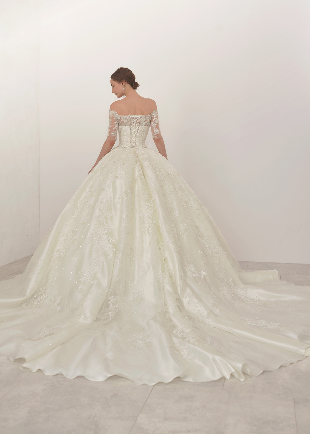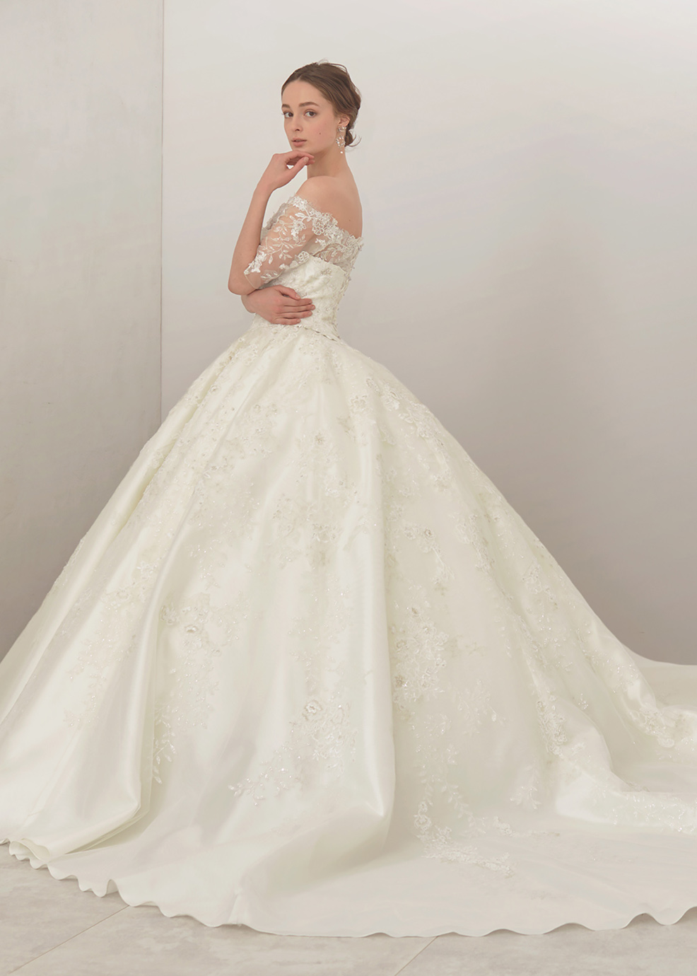 フィルム糸と立体フラワーが加工されたレースとグリッターを合わせた透明感とキラキラを全身に纏ったプリンセスドレス。デコルテを美しく見せるオフショルダーに程よい長さの袖を合わせて上品で華やかなドレスに仕上げました。シンプルボリュームのシルエットが贅沢なレース使いを引き立たせます。