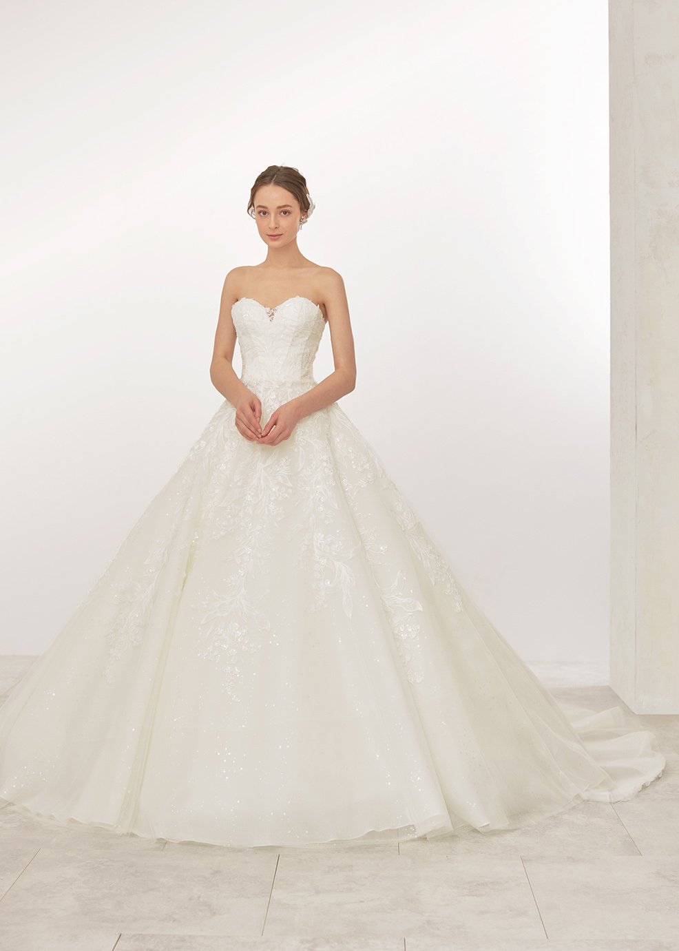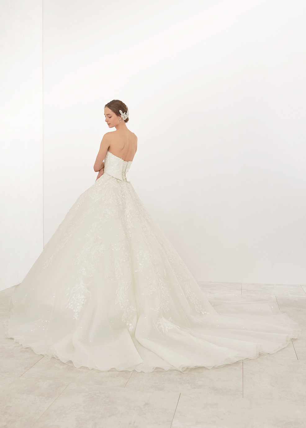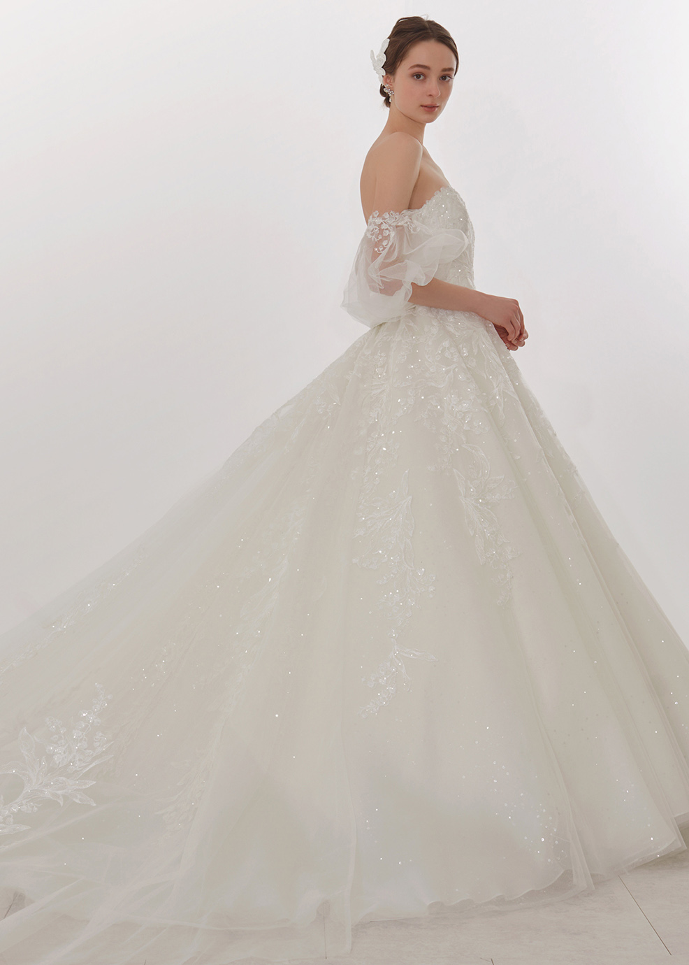可憐なスズラン柄のエンブレースを流れるように配置した特徴的なドレス。レースのスパンコールとラメフィルム加工が輝きを放ちます。レースを際立たせるようなすっきりとした身頃とボリュームのあるフレアースカートのシルエットが洗練された印象を与えます。パフスリーブとトレーンを付けてより一層豪華なドレスに仕上げました。