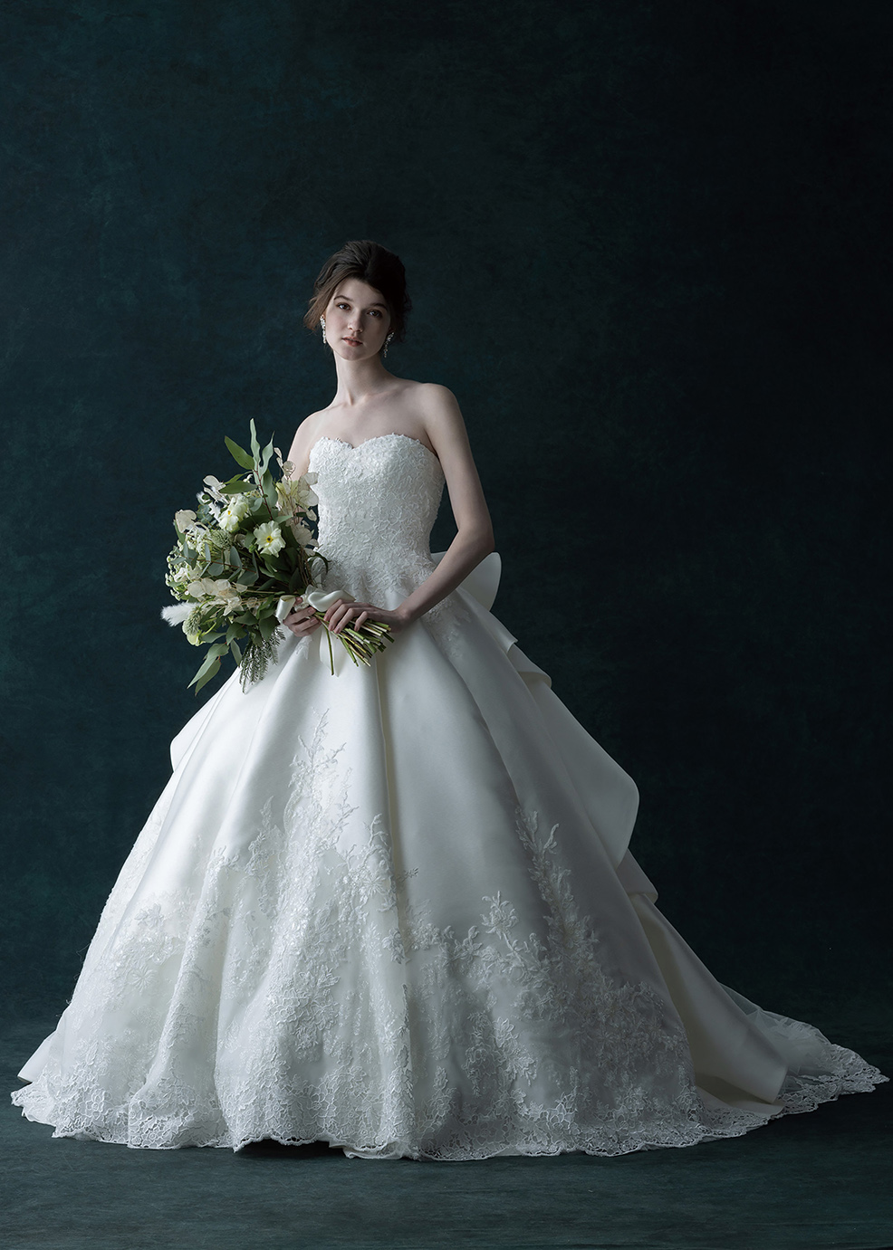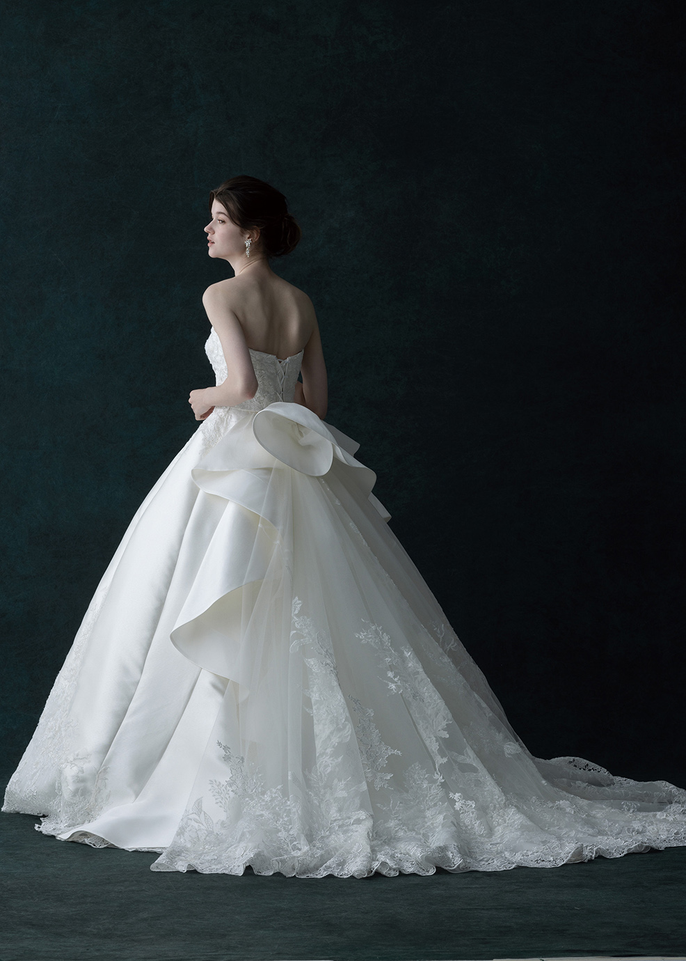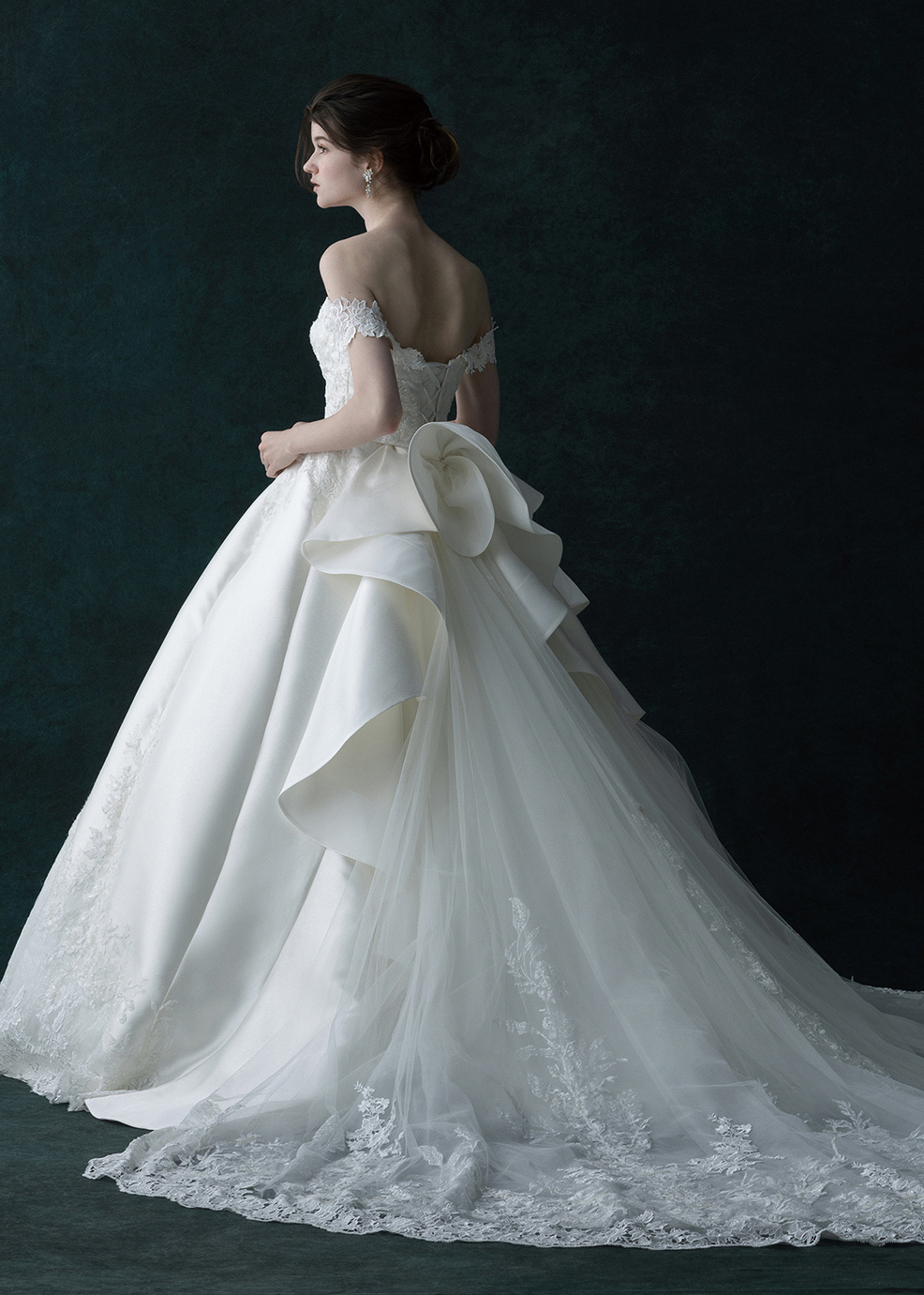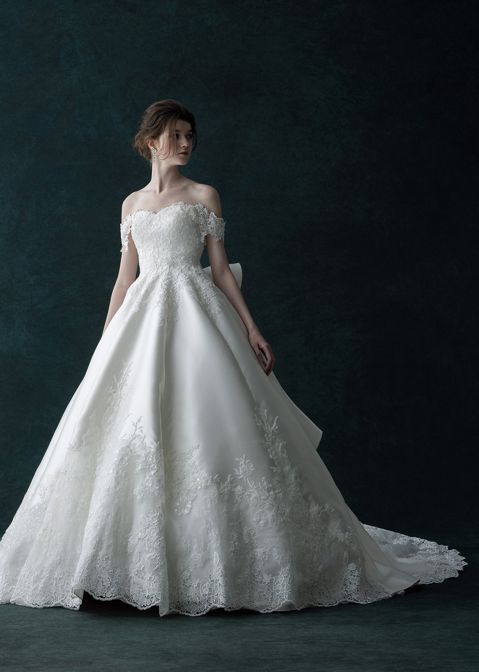 ドレスをキャンパスに見立てて、ケミカルレースとビーズレース・グリッターレースを惜しみない生地使いで華やかに仕上げています。ケミカルのオフショルダーは取り外し式で二の腕をさりげなくカバーします。大胆に流れるボリュームのフリルが優雅な雰囲気です。