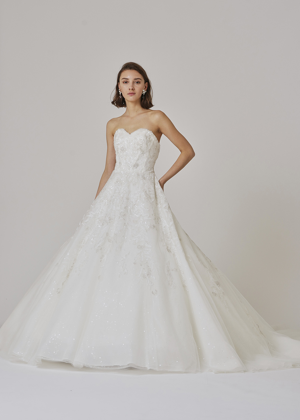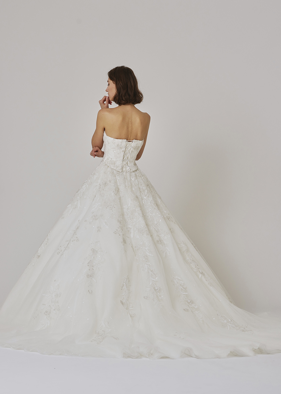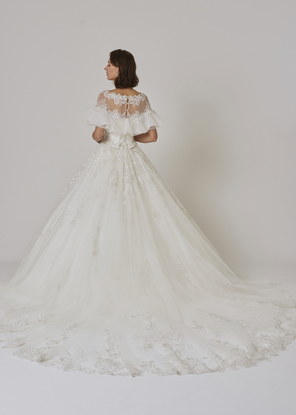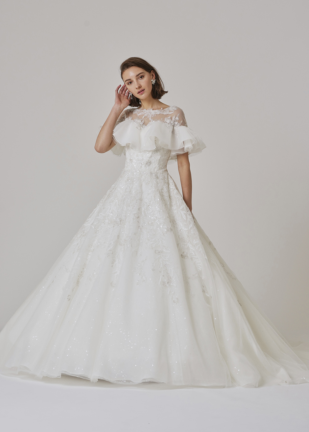 透明感溢れるプリンセスの輝きを表現したドレス。全体に透明スパンコールを散りばめ身頃やスカートにクリスタルのビーズの輝きを加え華やかさを表現。ライトゴールドの刺繍糸を使用したボタニカル風レースで個性を表現します。取り外し式のフリル付きヨークを付けていただくとかわいらしさがアップします。
