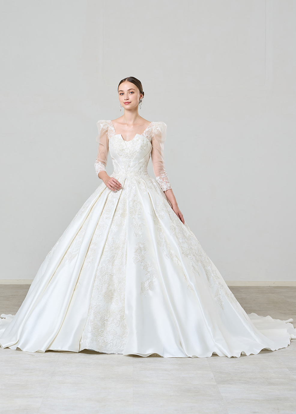 Vカットしたボディラインとタックから広がるボリュームスカートがウエストを細くシャープにみせます。透明感のあるロングスリーブがポイント。