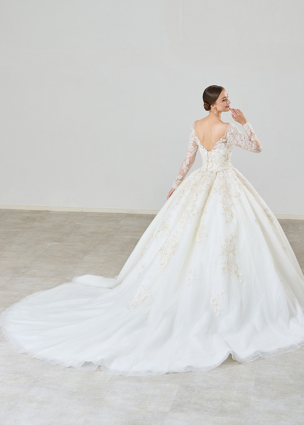 ビックAラインのシルエットが映えるドレスです。ドレス全体に透明なグリッター素材を使用し、トップスや、スカートの上に側にはオリジナルの柄で作られたゴールドとアイボリーのレースが存在感を与えます。ヨークや胸元部分にはビーディング施し。高級感を醸し出します。