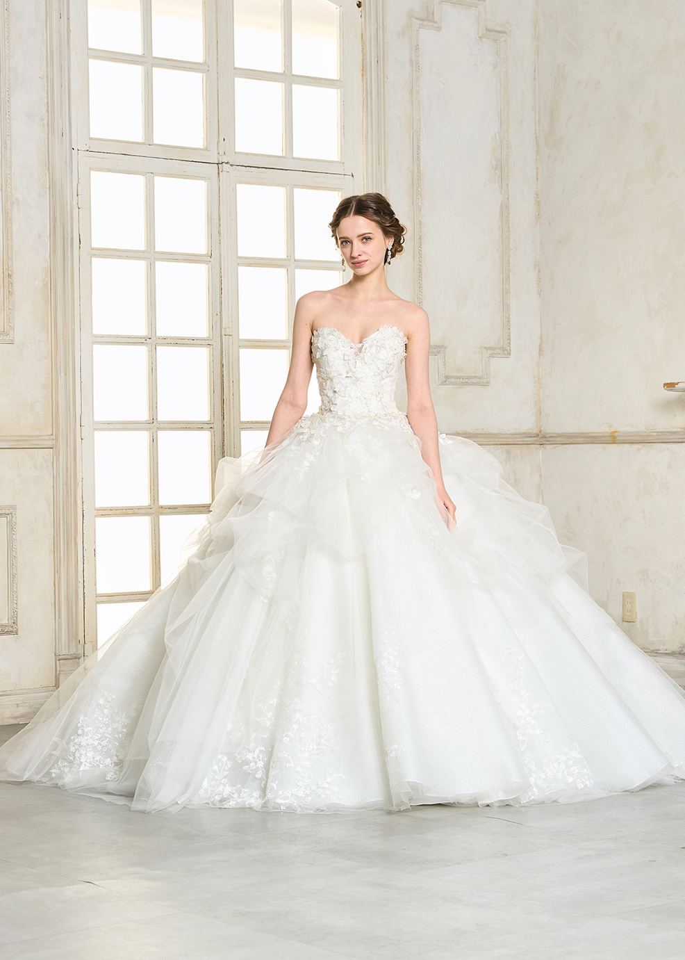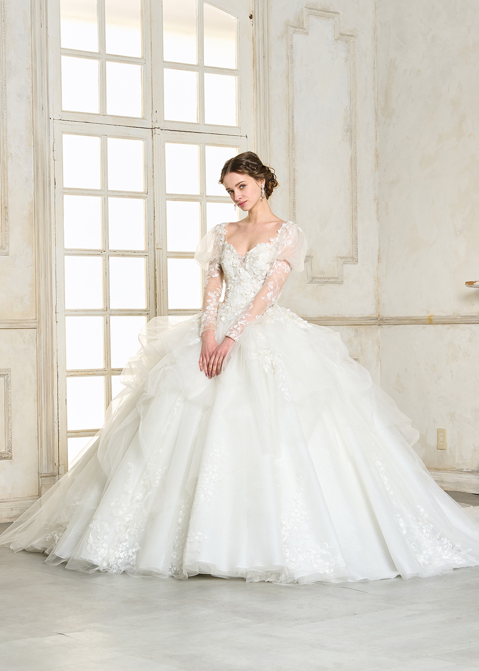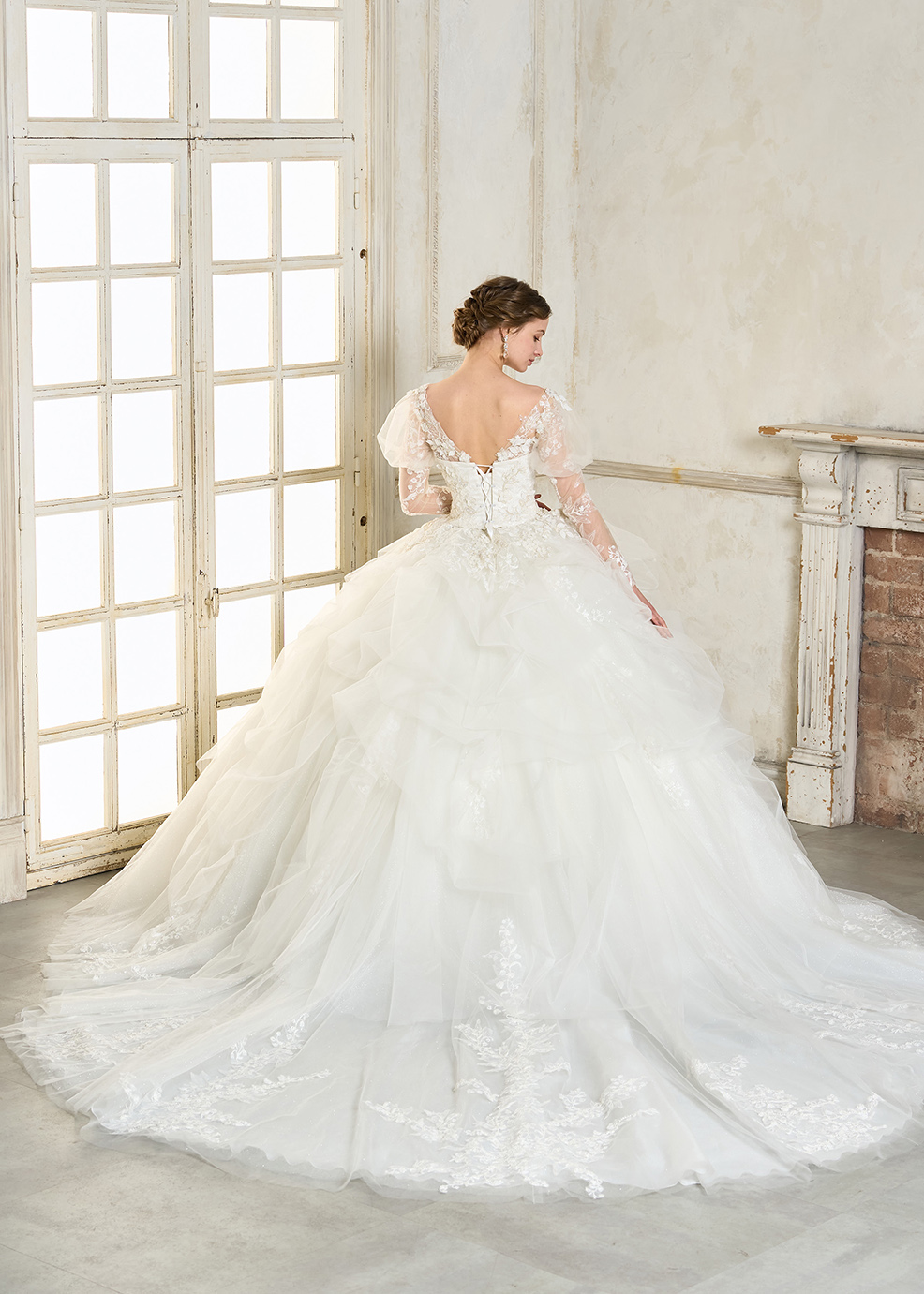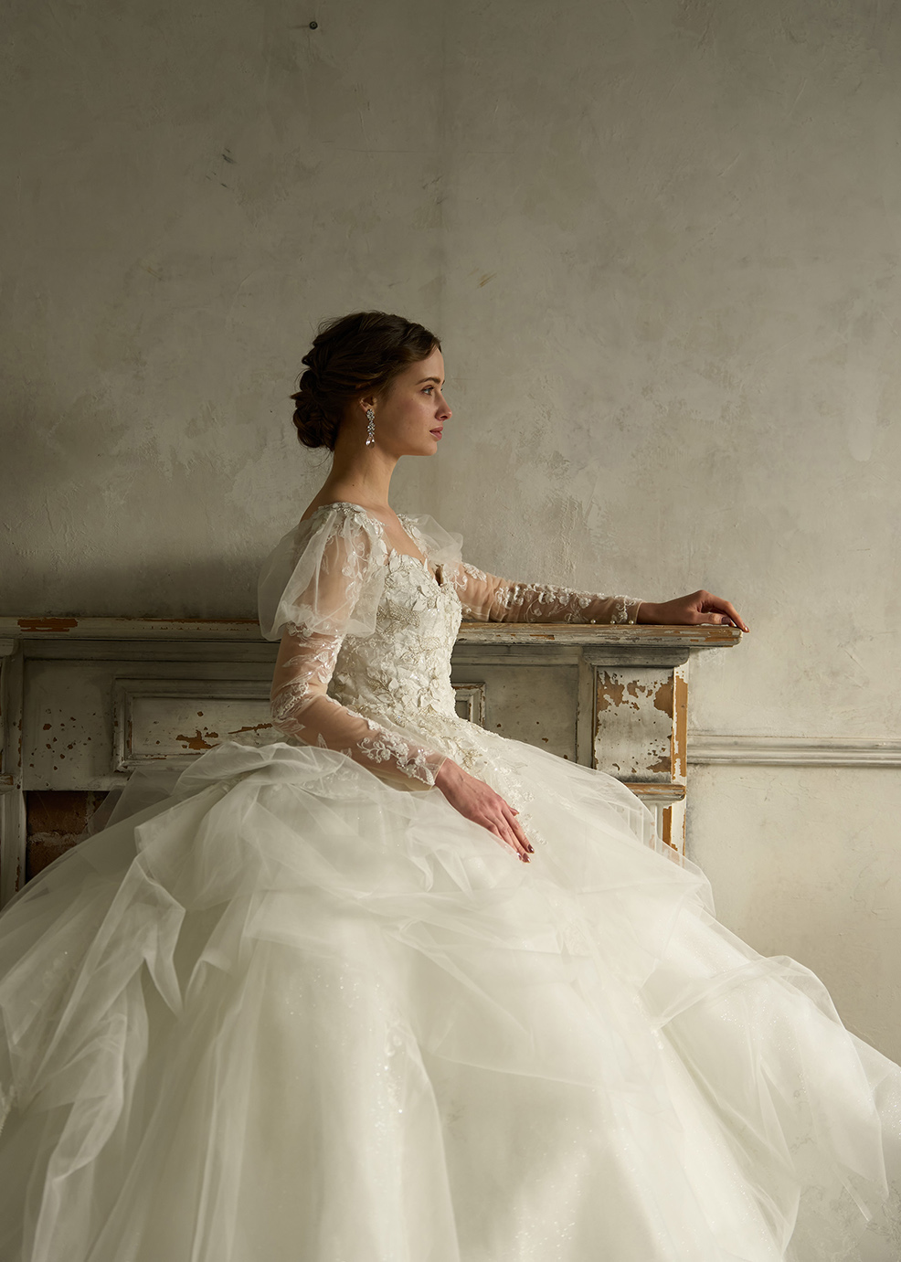 ころんとしたすずらんをイメージさせる ぽわん袖が可愛いジュリエットスリーブとすずらん柄レースの可憐な現代版プリンセスドレス。空気を含んだブラウジングスカートとロングトレーンが圧倒的なボリュームシルエットを作り出します。