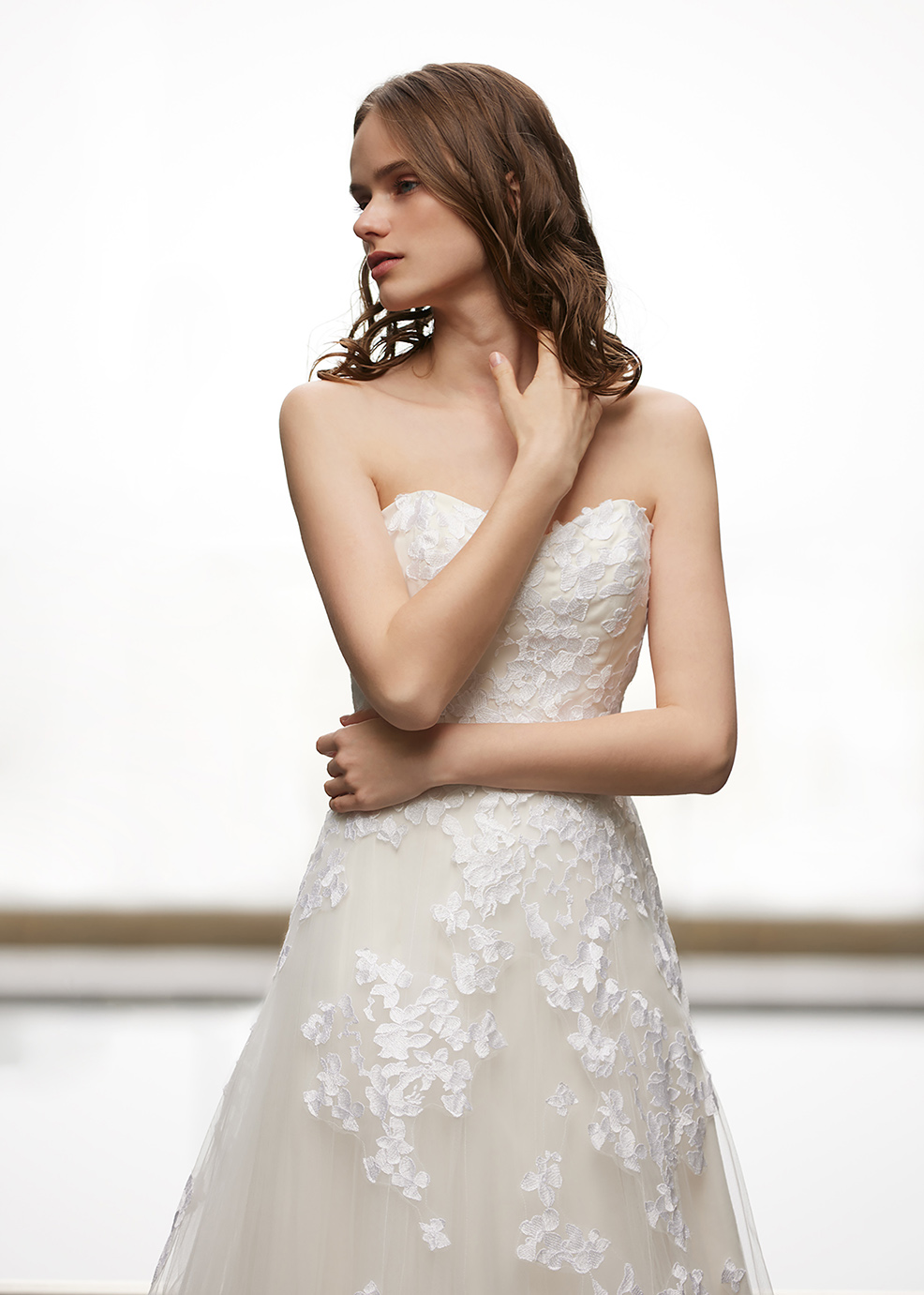 取り外し式ヨークの大胆に開いたネックラインは鎖骨を見せることで華奢に見せ、