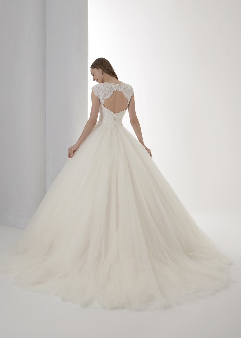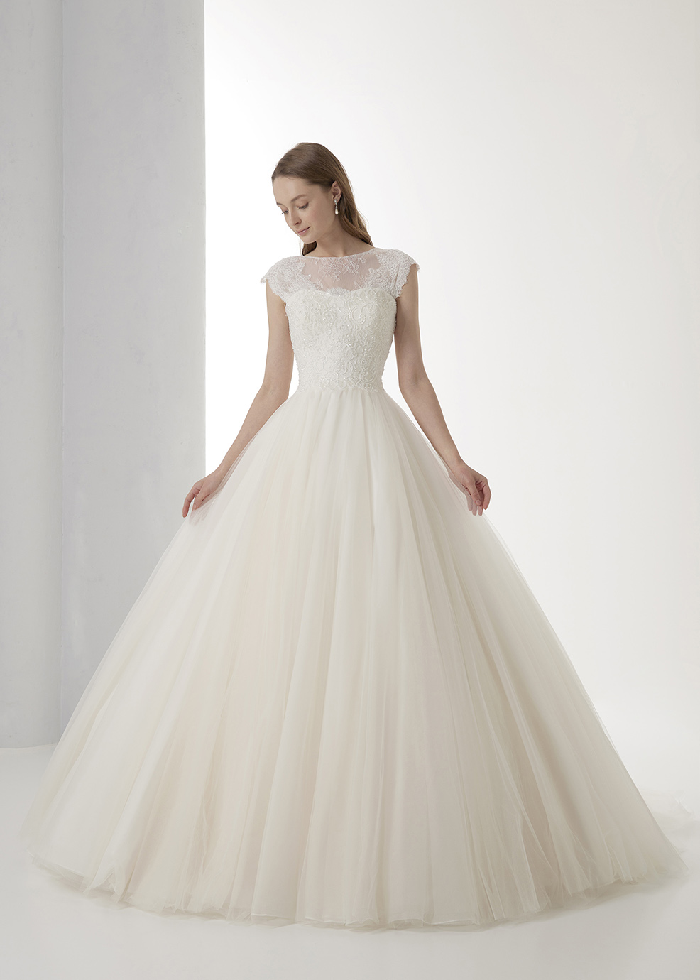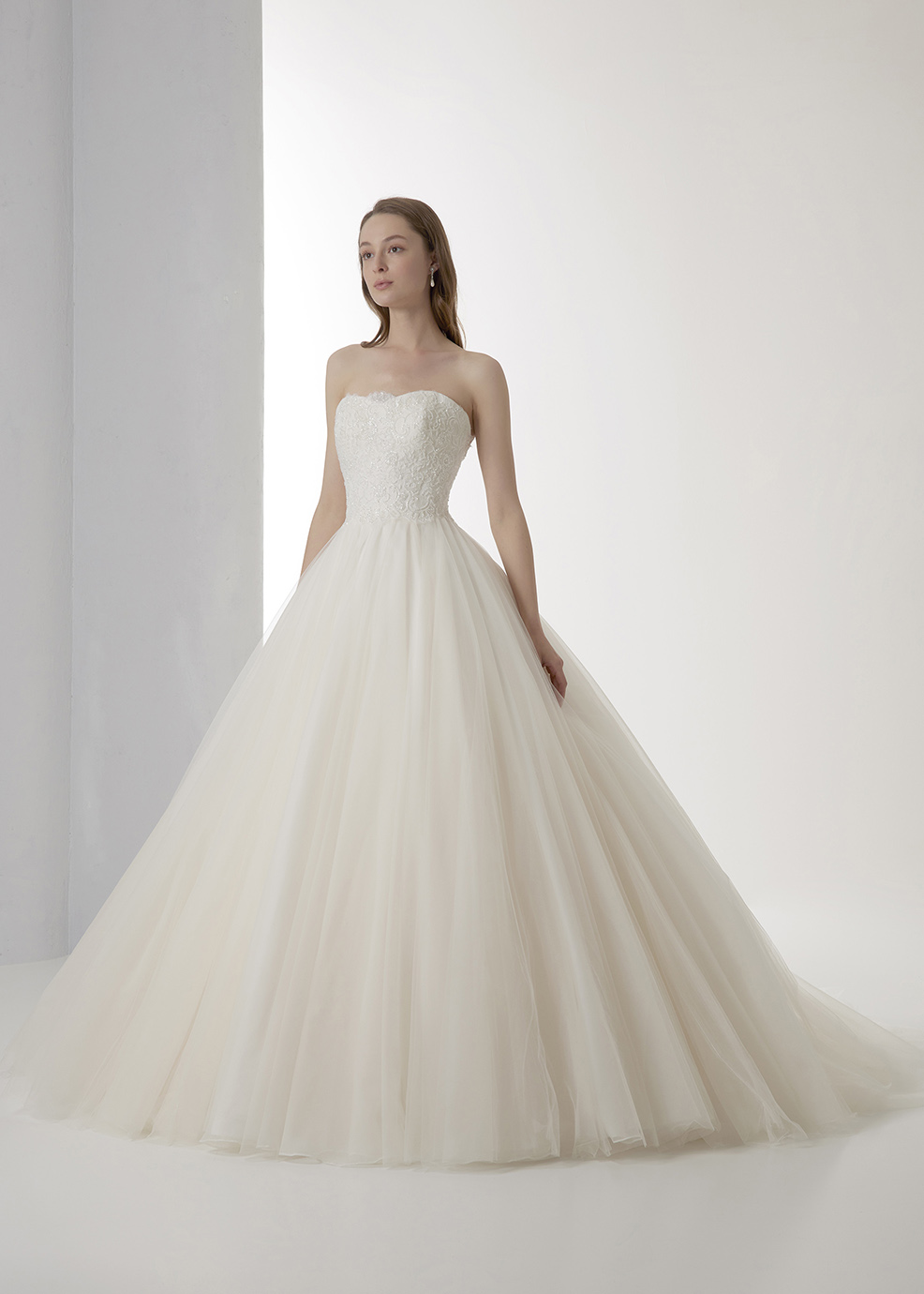 チュールのBIGAライン。チュチュのような軽やかさがありながらも、大人っぽいラインが特長。ビーディングレースはインドの細やかな加工が繊細に上品に輝きます。取り外し式のヨークはちょうど良い透け感でデコルテをカバーし、お顔周りを華やかにみせます。
