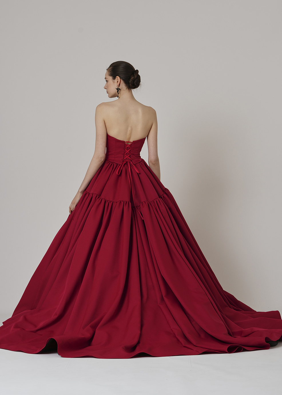 シルエットでみせるモダンなウェディングスタイル。ボリュームの出し方や美しいフレア感を出すために工夫を凝らして、新鮮な印象を作っています。使用素材は、リサイクルポリエステルを50%使用した、サスティナブルな素材です。