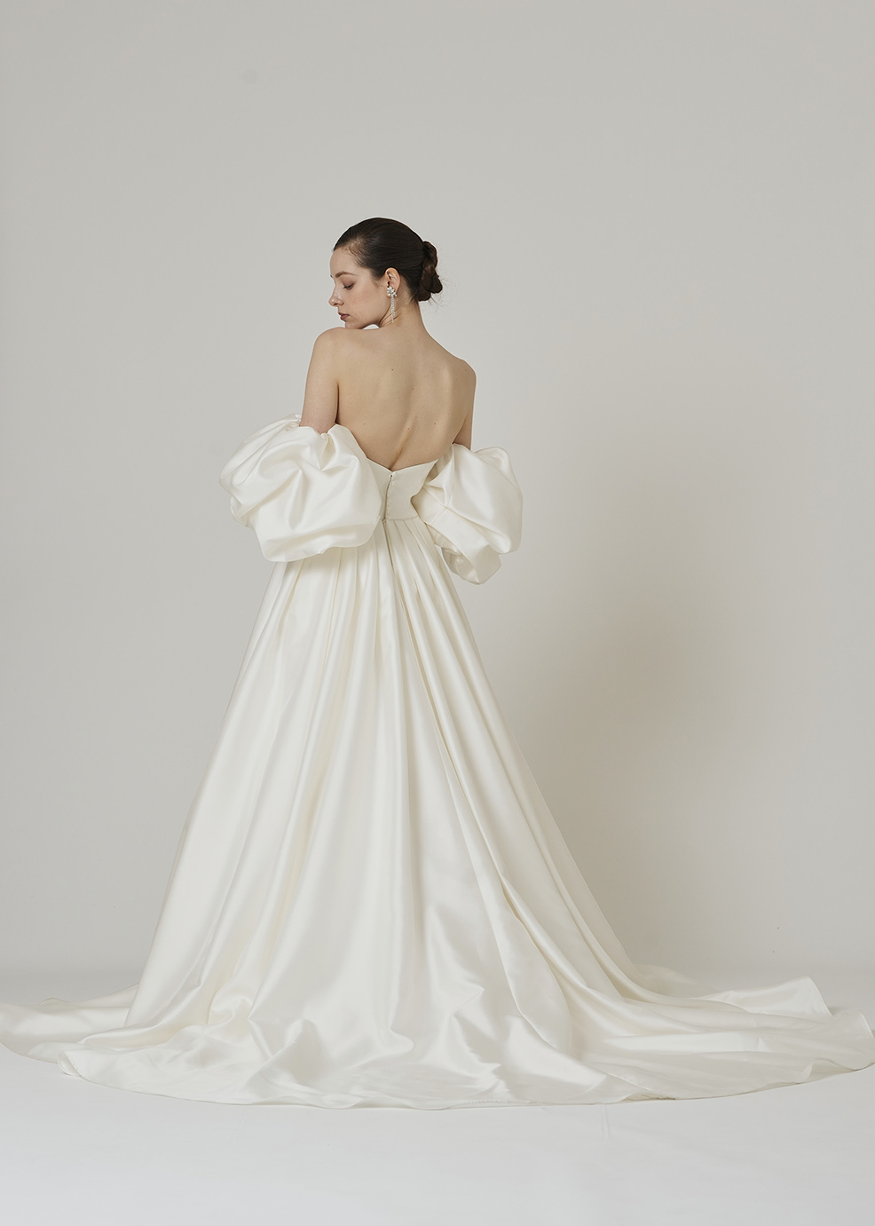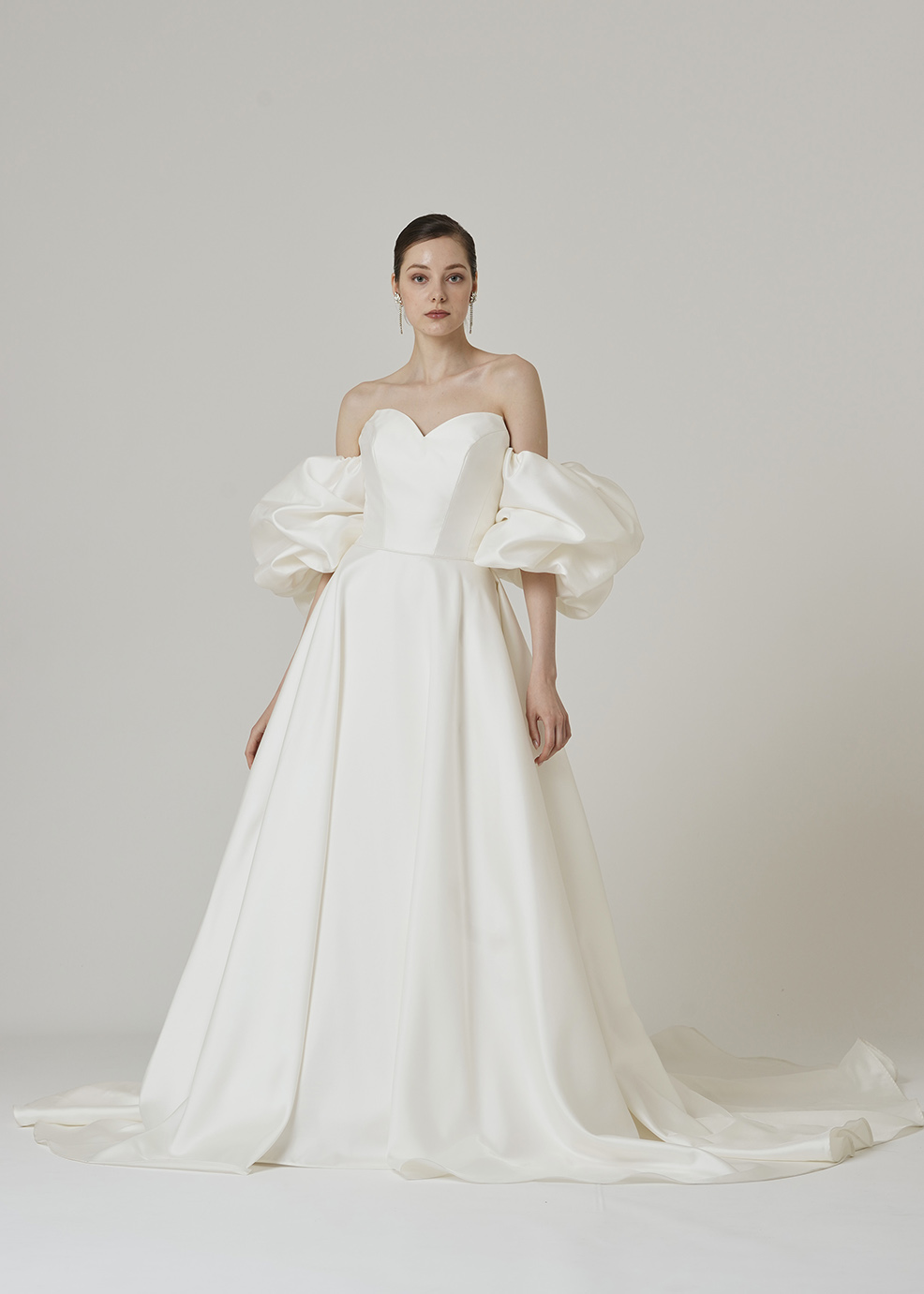 スカートのラインや胸元のカッティングにこだわったラトリエらしいシンプルなドレスです。旬のパフスリーブを大輪の花のような印象に仕上げモード感をプラスします。感度の高い花嫁様におすすめの1着です。