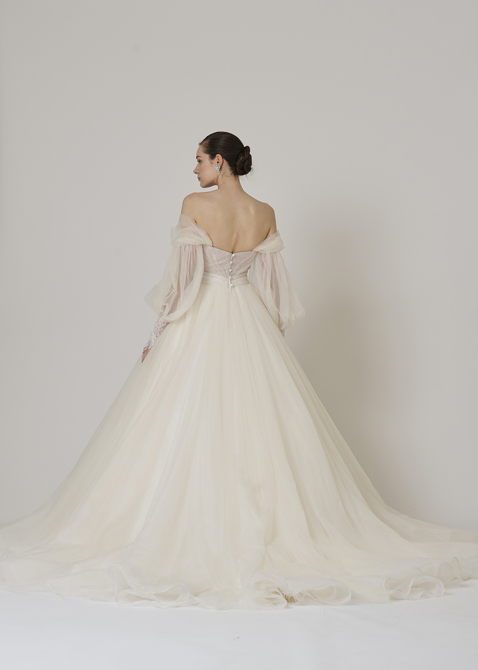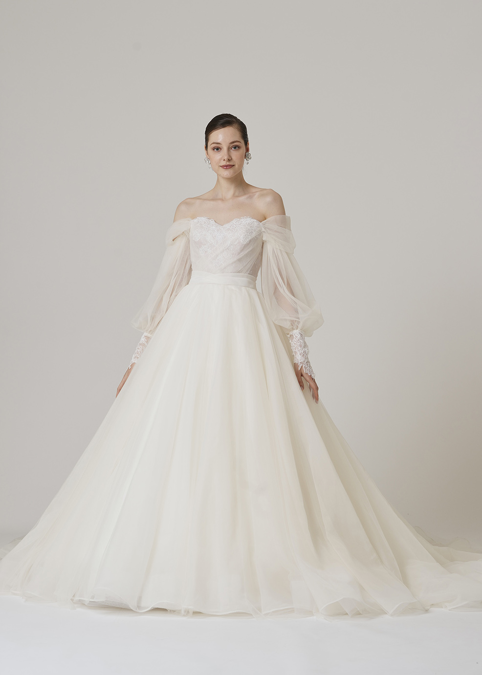 オフショルダーのパフスリーブが印象的な1着。身頃はコードリバーレースとシャンテリーレースを組み合わせた繊細なディテールになっています。たっぷりとしたビッグAラインスカートがXシルエットをつくり、スタイル良く全体のバランスを整えます。パフスリーブを取り外すと、オフショルダースタイルにチェンジします。
