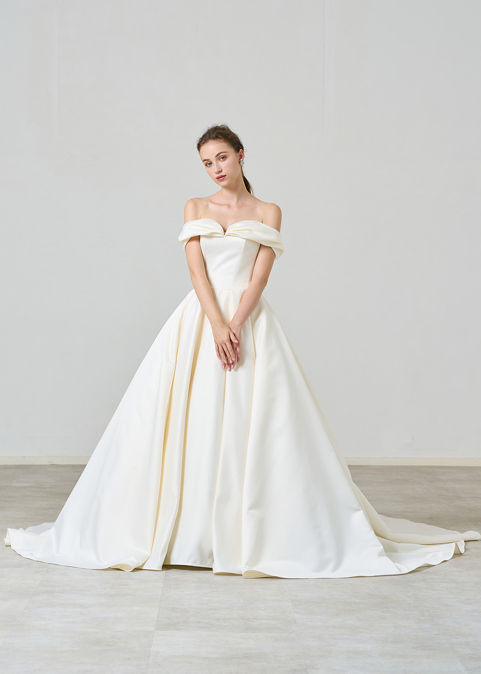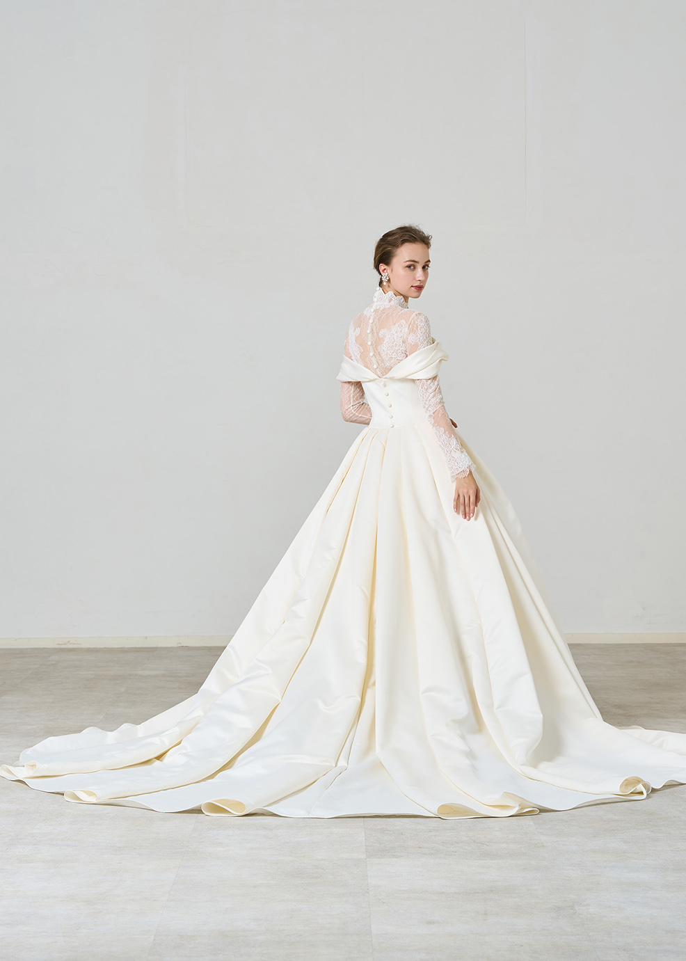 あえて光沢感を抑えた仕上がりで、落ち着きのある印象に仕上げたマルチプルサテン。程よい厚みのあるサテンを使用することでたっぷりなフレアースカートに落ち感を与え美しいシルエットを作り出しています。取り外しのリバーレースのボレロとクチュール感のあるロールカラーがよりエレガントに映し出します。