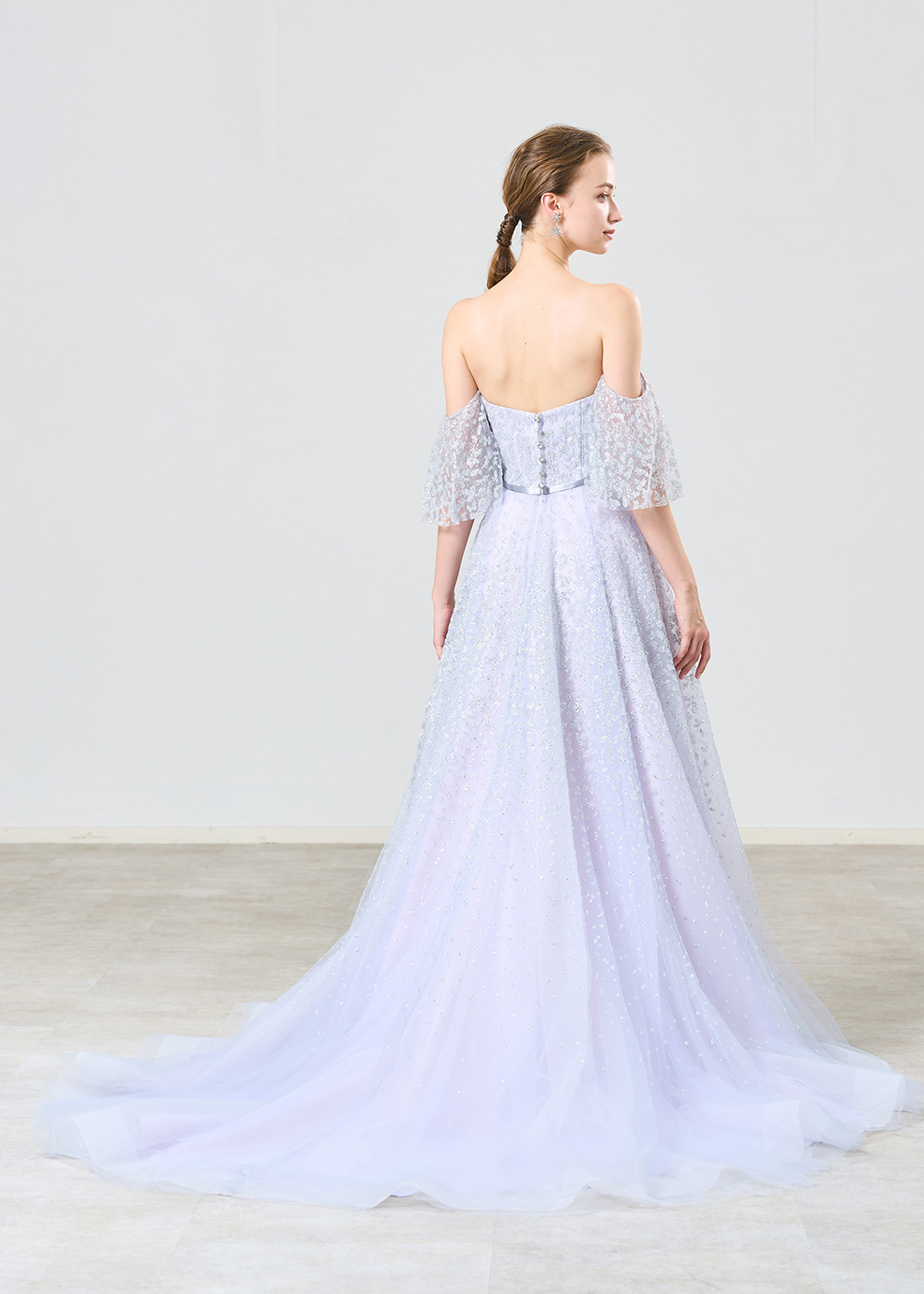 宝石が零れ落ちたような立体的なグリッターが輝くソフトスレンダースタイル。身頃とフレアスリーブにはシルバー糸のリバーレースをレイヤードすることで高級感のある表情を作ります。カラーは生地重ねにこだわった透明感のあるラベンダーベージュ。