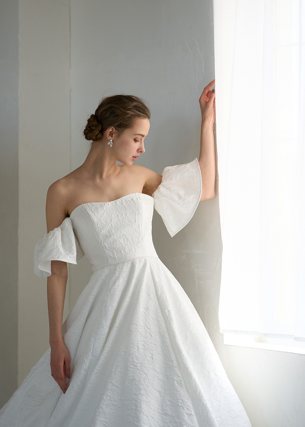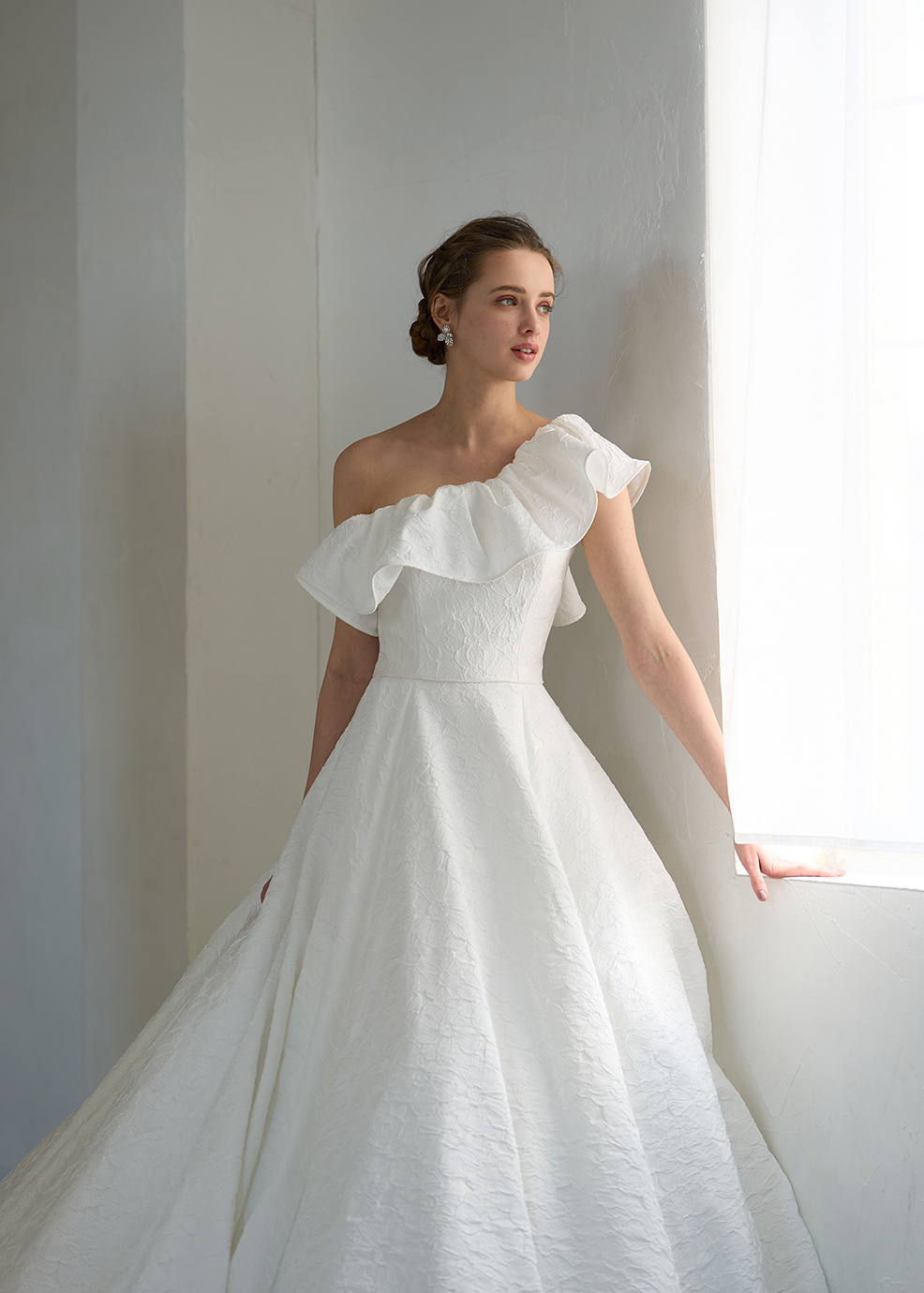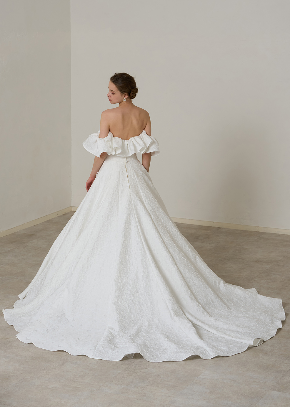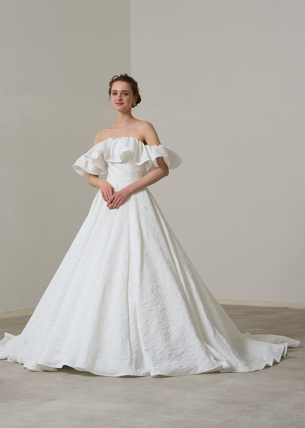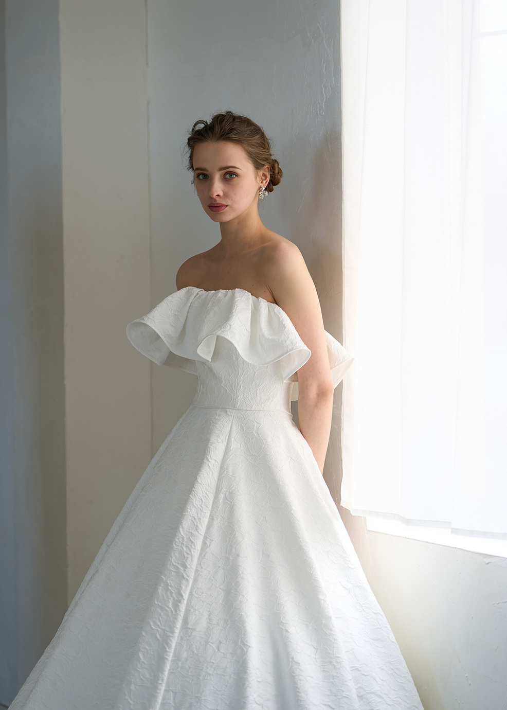 ジャガードの生地感が特徴的な美しいAラインスタイル。 ネックフリル・フリル袖のパーツを組み合わせ華やかな印象に。それぞれ個々に合わせることも可能で、アレンジを楽しんで頂けます。フリルを取り外すとシンプルなビスチェスタイルに。
