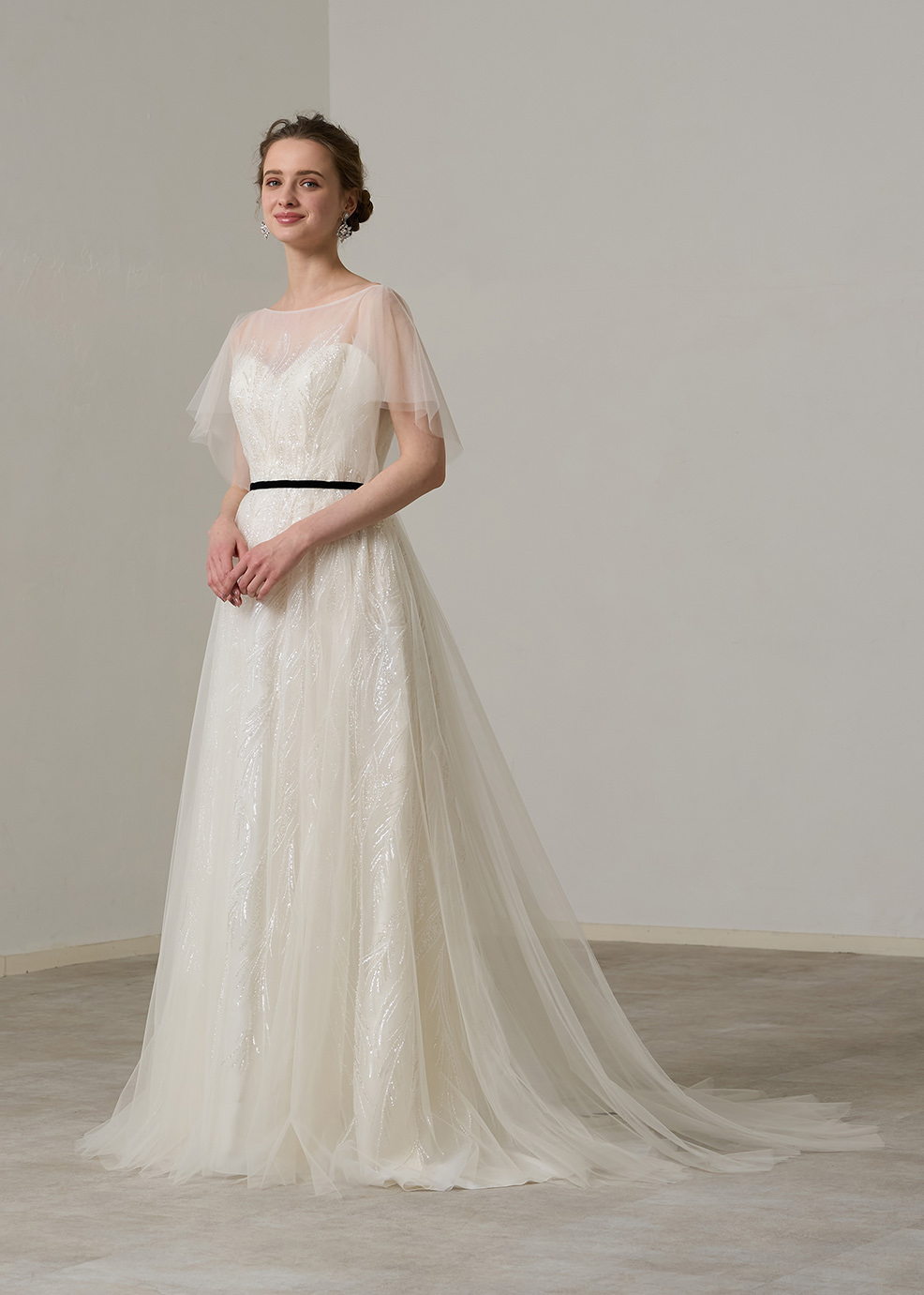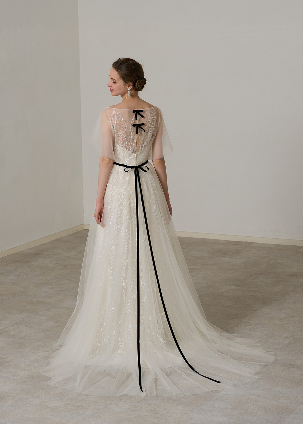 流れるリーフ柄の美しいビーディングが特徴的なスレンダースタイル。透け感のあるヨークからつながるフレアスリーブは、程よく二の腕をカバーします。ブラックのベルベットリボンを差し色に、遊び心のあるデザインに仕上げました。