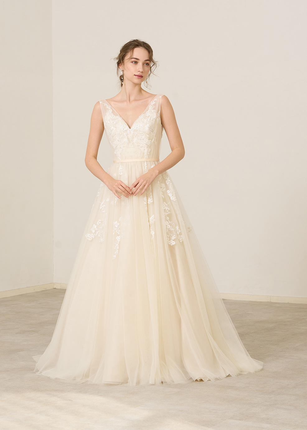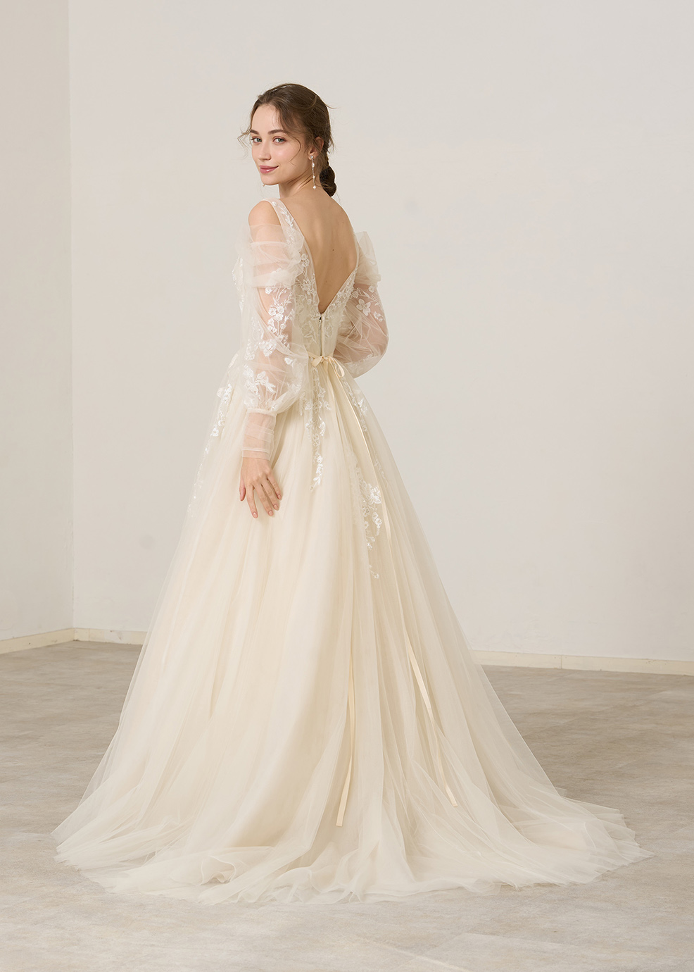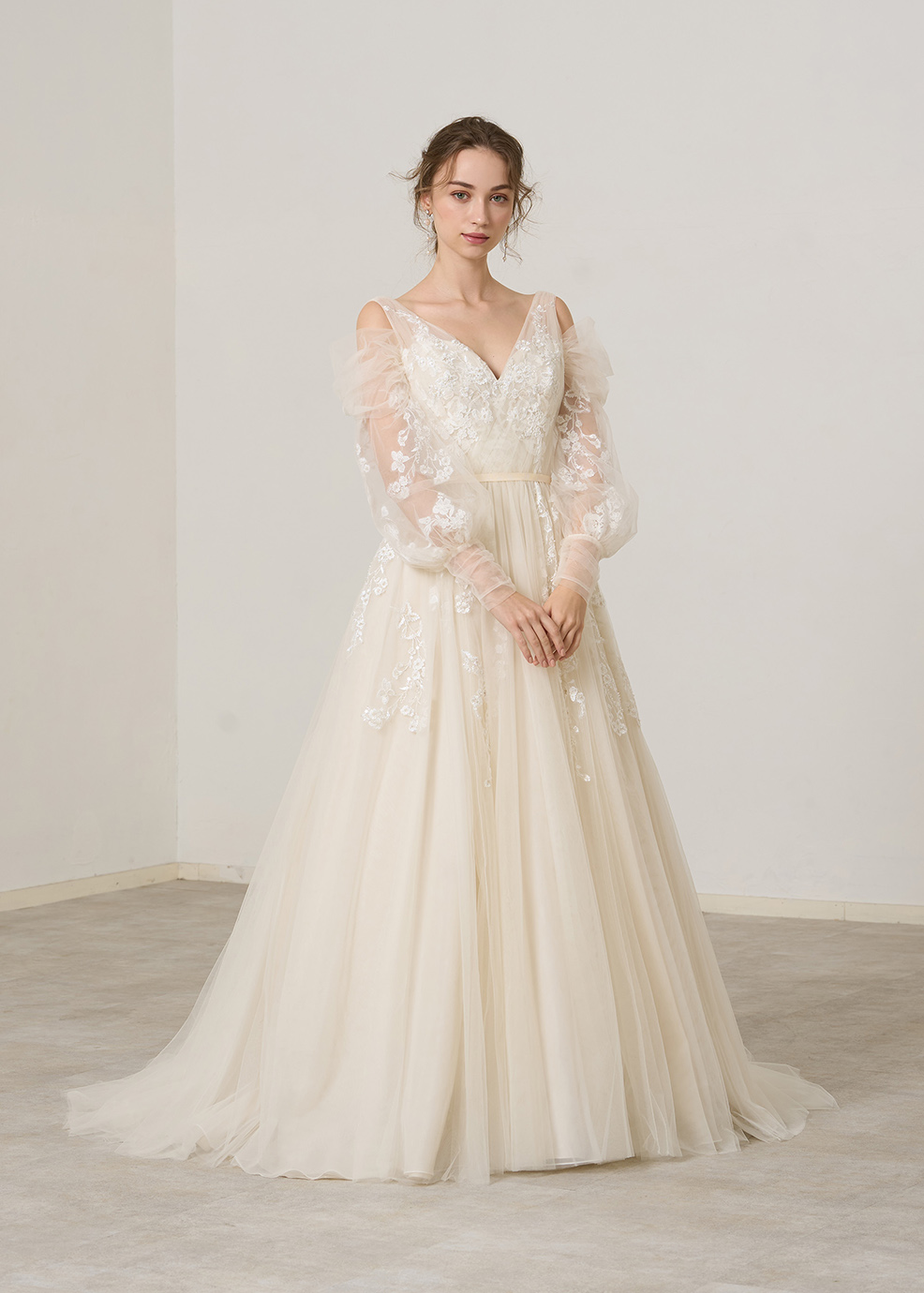 ボタニカルデザインのレースが繊細に幾度となく重なり合い可憐な雰囲気に、ふんわりとしたドレープフリーブが可愛らしいボリュームレスドレス。お袖は取り外し可能な2wayスタイルなので、花嫁様のお好みで変化を楽しむことができます。