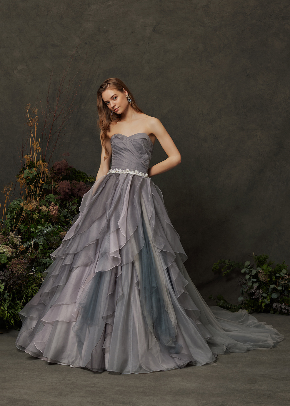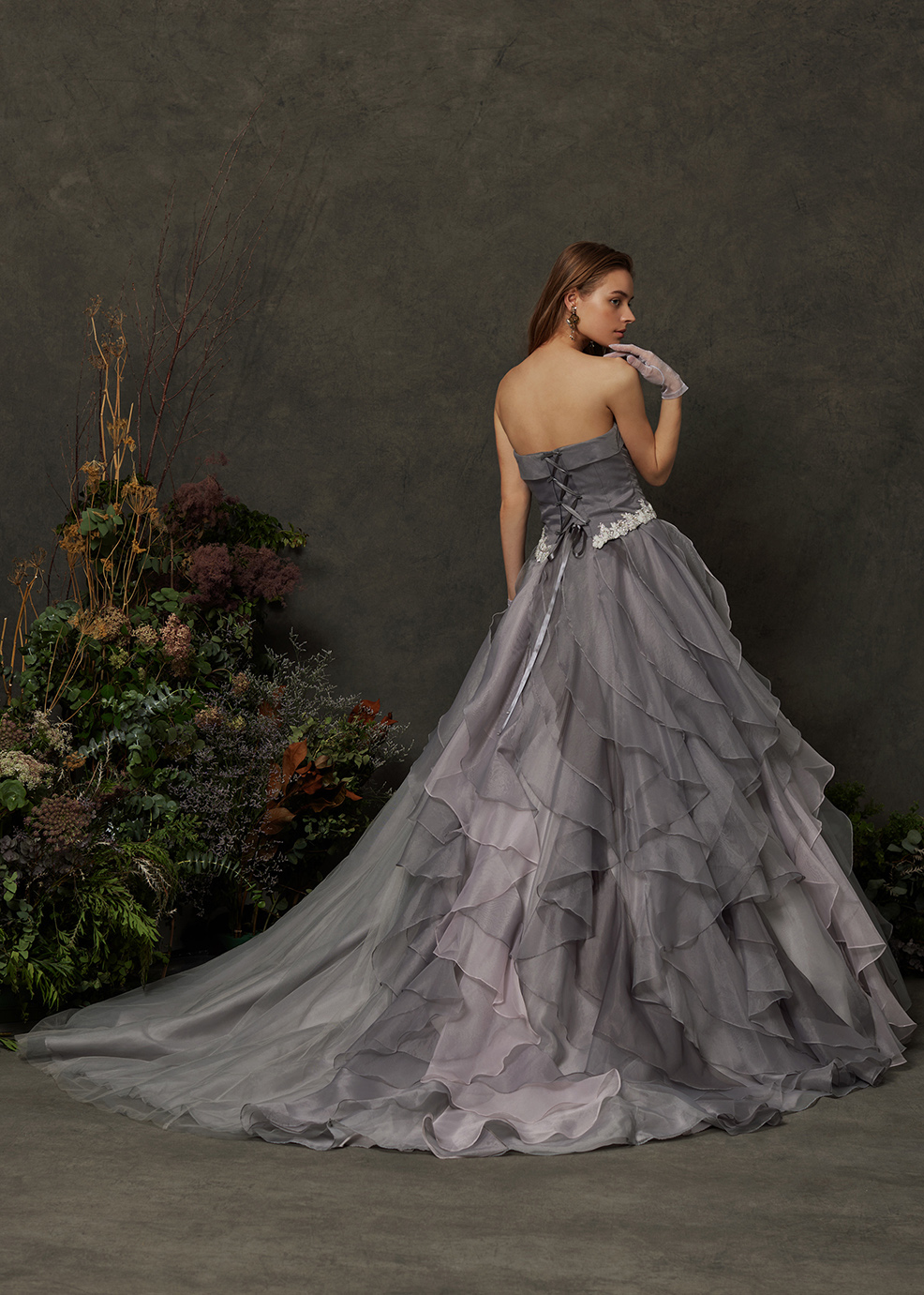 3種類の生地を組み合わせグレーの濃淡で立体的な色構成にしたボリュームドレス。身頃から、裾にむかって大きく広がる縦フリルがより立体的に、そしてシックな印象を与えるドレス。