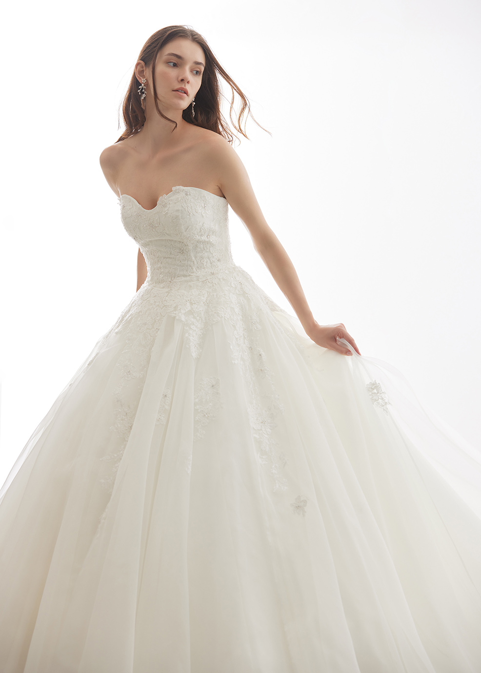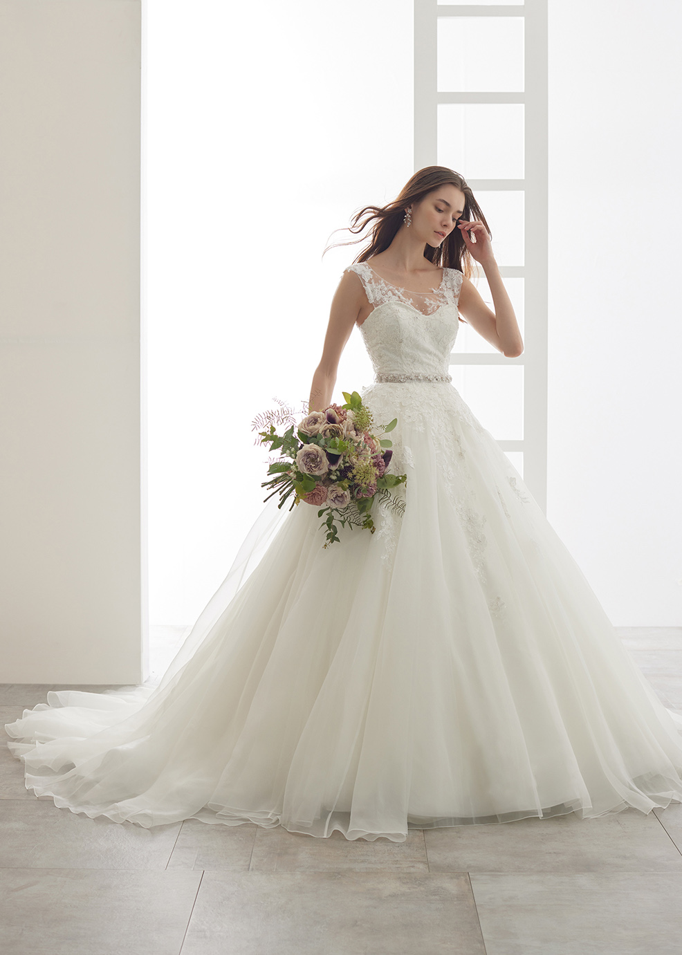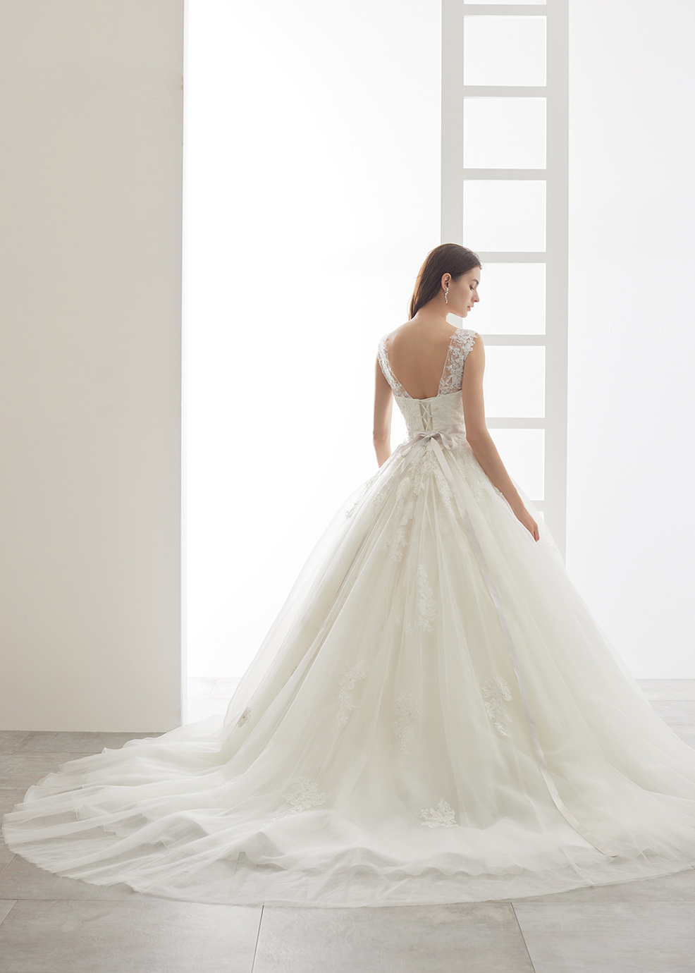 「人気のVネックヨークは取り外し可能!! グラデーションに流れるような大柄レースを贅沢使いしたシルキーエレガンス。」デコルテが綺麗に見える人気のVネック風ヨークは取り外し可能に。あまりないオーガンジーをたっぷり使ったボリュームスカートにグラデーションに流れるような大柄レースが、シルキーな品格ある花嫁様を演出します。取り外しチュールトレーンを付けたレースの重なりに目を奪われるバックスタイルは極上の美しさ。大柄レース全面に散りばめられたスパンコールがキラキラと華やかに輝きます。身頃は一層繊細なビーディング使いで高級感あふれる贅沢ドレス。
