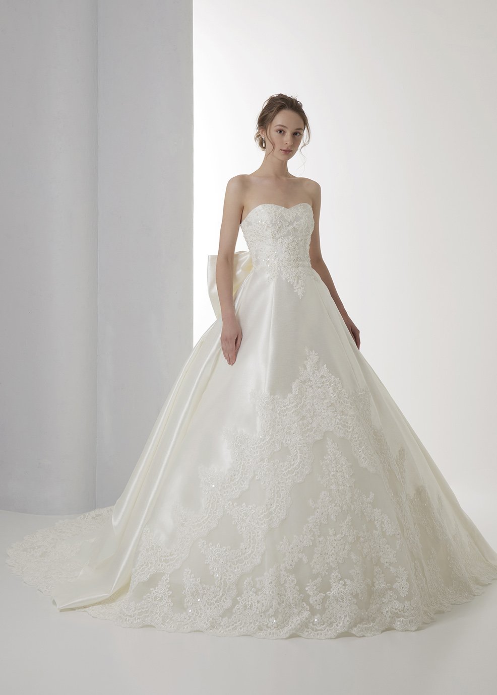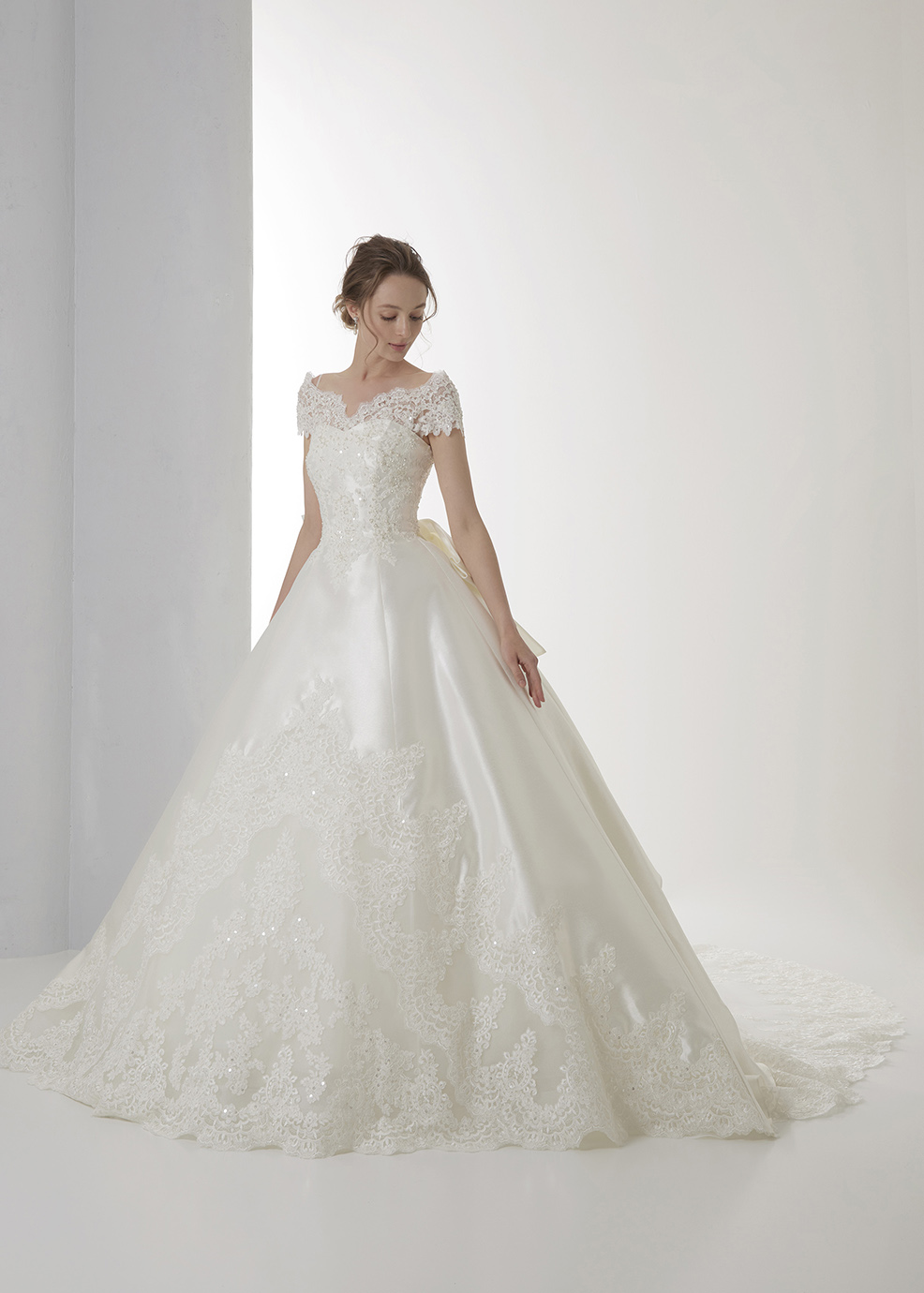 「どんなスタイルの方でもほっそり綺麗に見えるVバランスドレス」幅広めのオフショルダーヨークで気になる二の腕まわりや背中もしっかりカバーできる安心デザイン。お胸回りもしっかりカバーできるように、DEWYシリーズの中でも一番高くビスチェを作ってますのでホールド力抜群です。ヨークのカット、ウエストカット、レースの配置をすべてVカットに切り替えて、視覚効果で着るだけでスタイルがよく見えるバランスにこだわってお作りしました。バックスタイルのビックリボン、トレーンまで贅沢にレースをあしらって飽きのこない万人受けしていただけるデザインです。