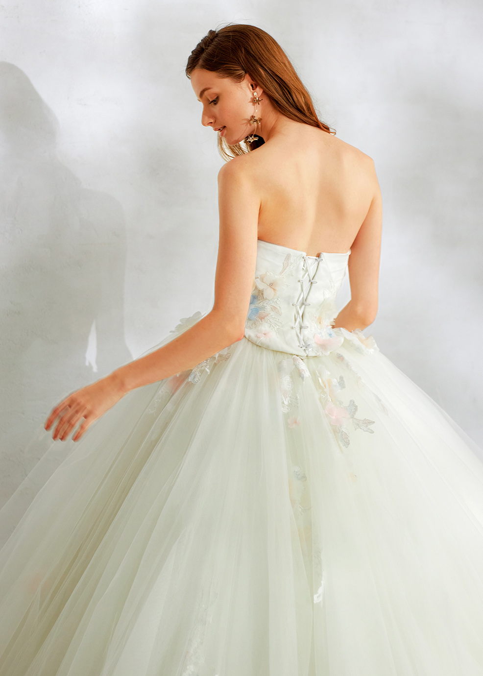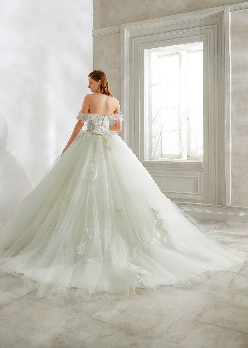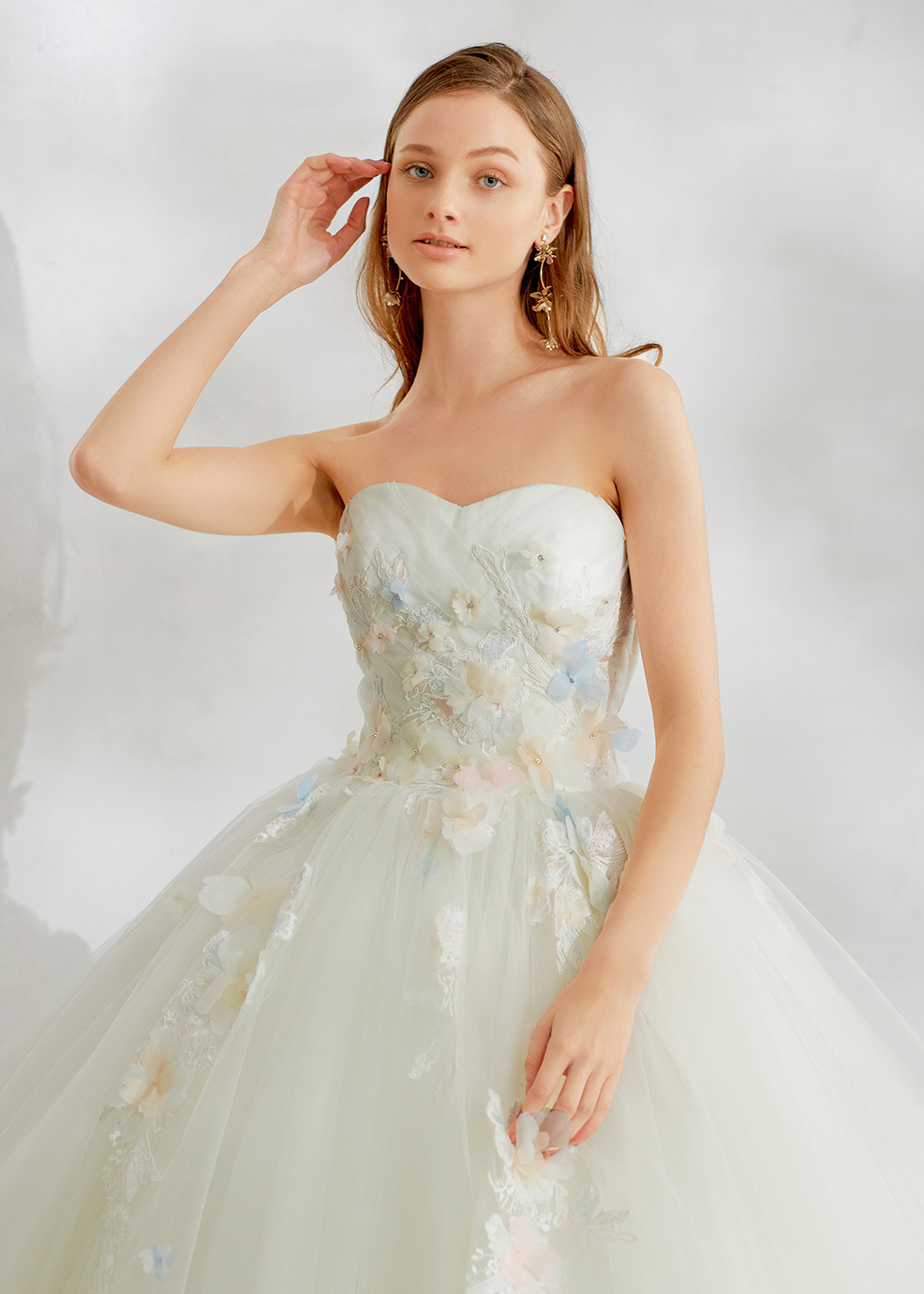 淡いカラーパレットのような立体フラワーレースを散りばめたロマンティックムード溢れる一着。フラワーレース付きのお袖は取り外し可能でシンプルに着用も可能な2WAY仕様。ビックボリュームの大人プリンセスドレス。