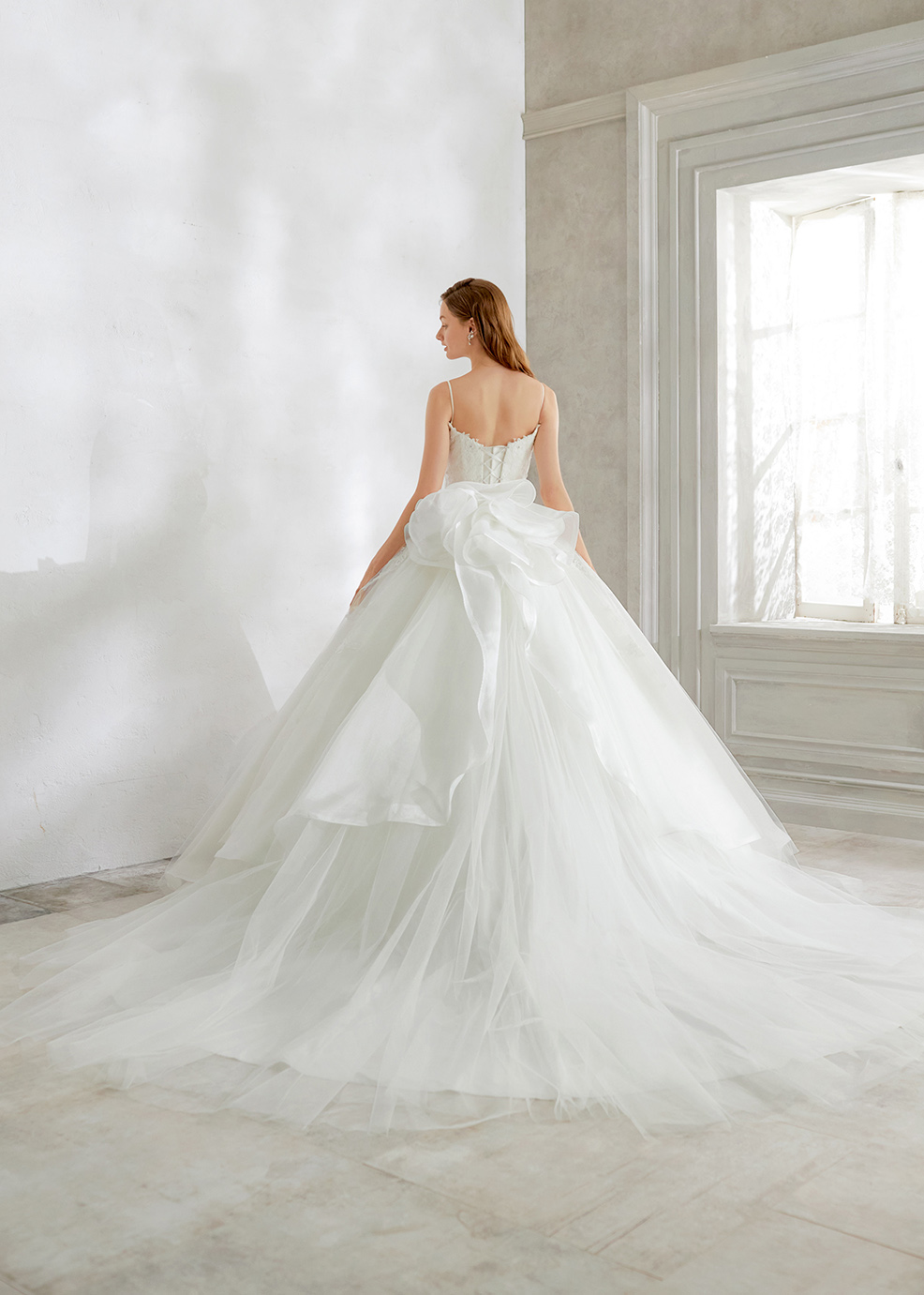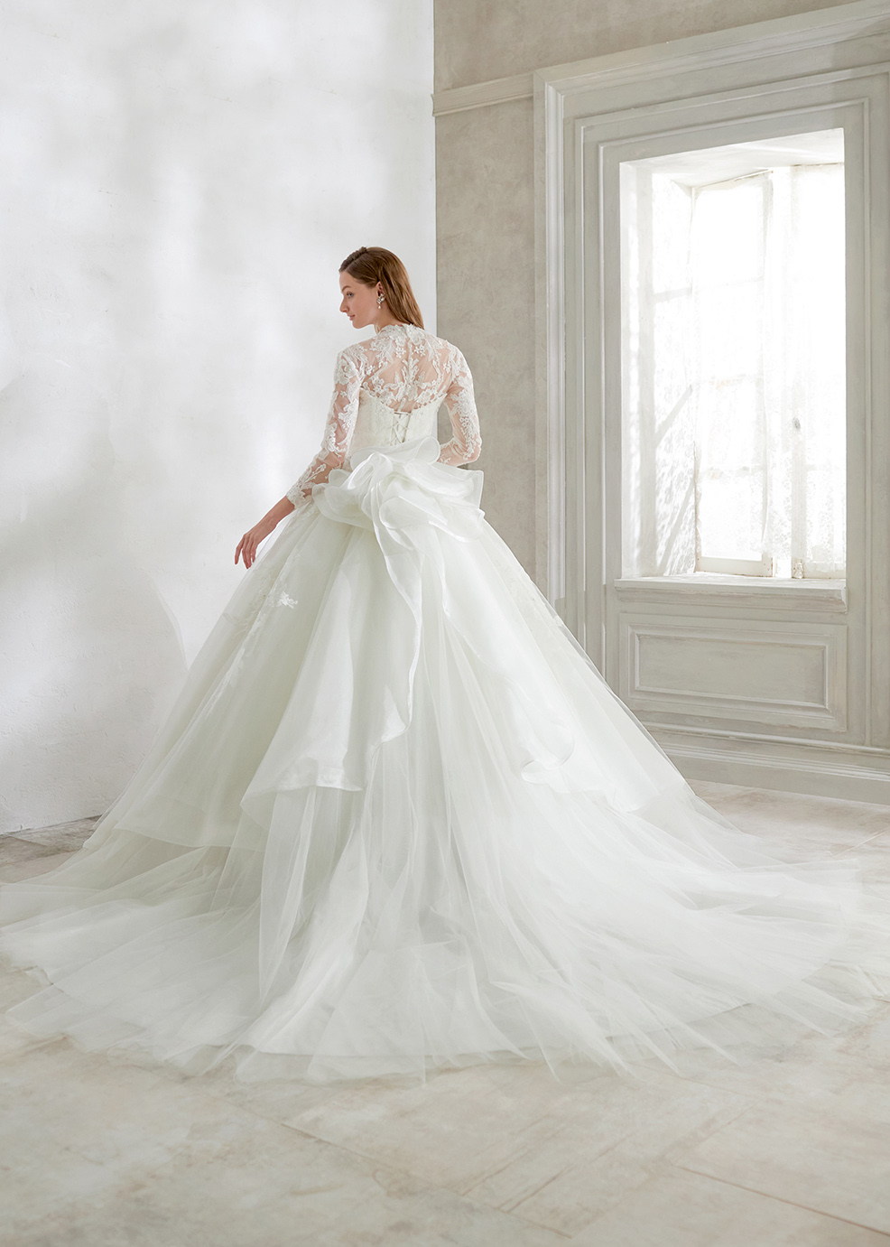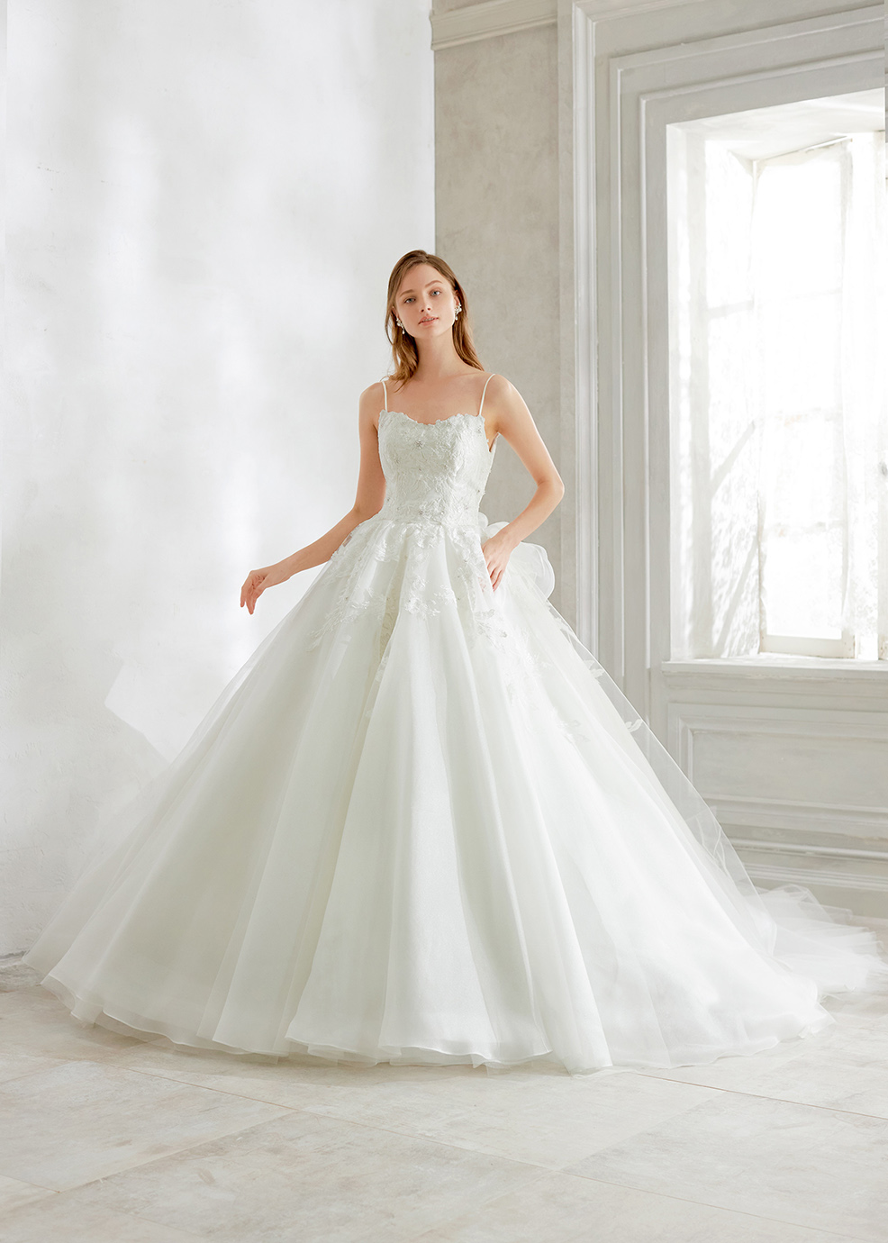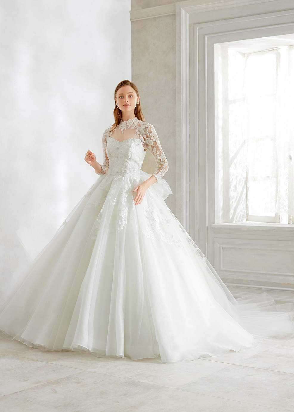 シルキーなサテンオーガンジーにチュールをふんわりかけたウエストから広がるAラインシルエット。繊細な大柄の刺繍レースが遠目からでも映える一着。取り外しのスパゲッティストラップと透け感の綺麗な長袖ボレロの2WAY仕様。ボレロは手首が見える長さに仕立てた抜け感のあるデザイン。 大輪の花が咲いたようなバックスタイルはゲストの視線を奪う一着。