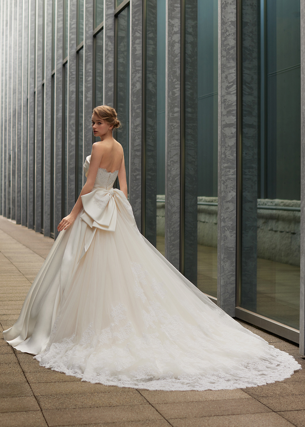 振り返ると、たっぷりと贅沢に配置したレースが流れ、