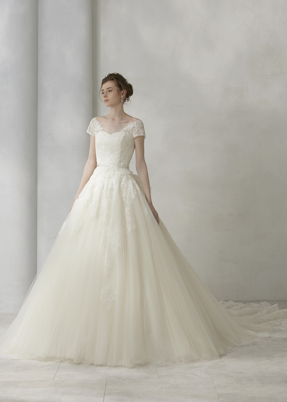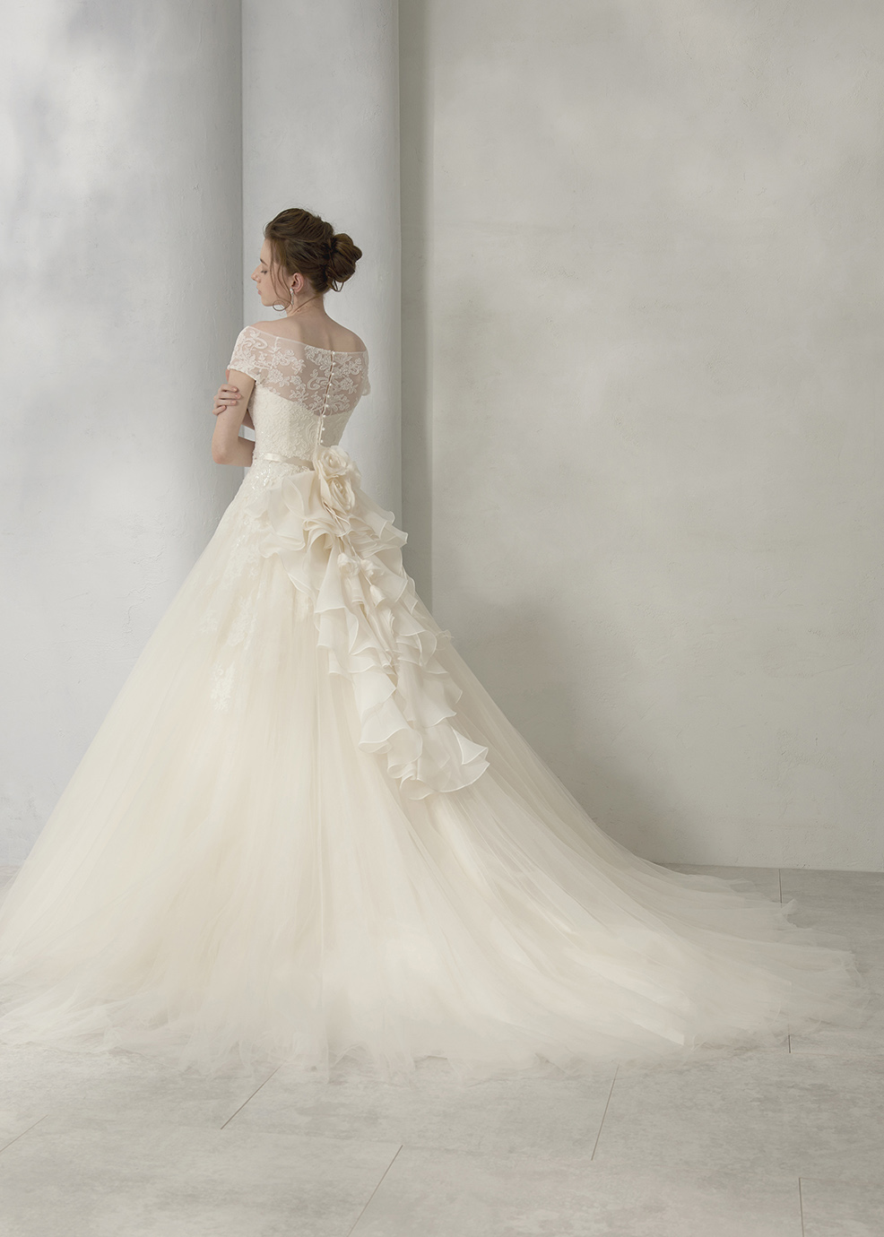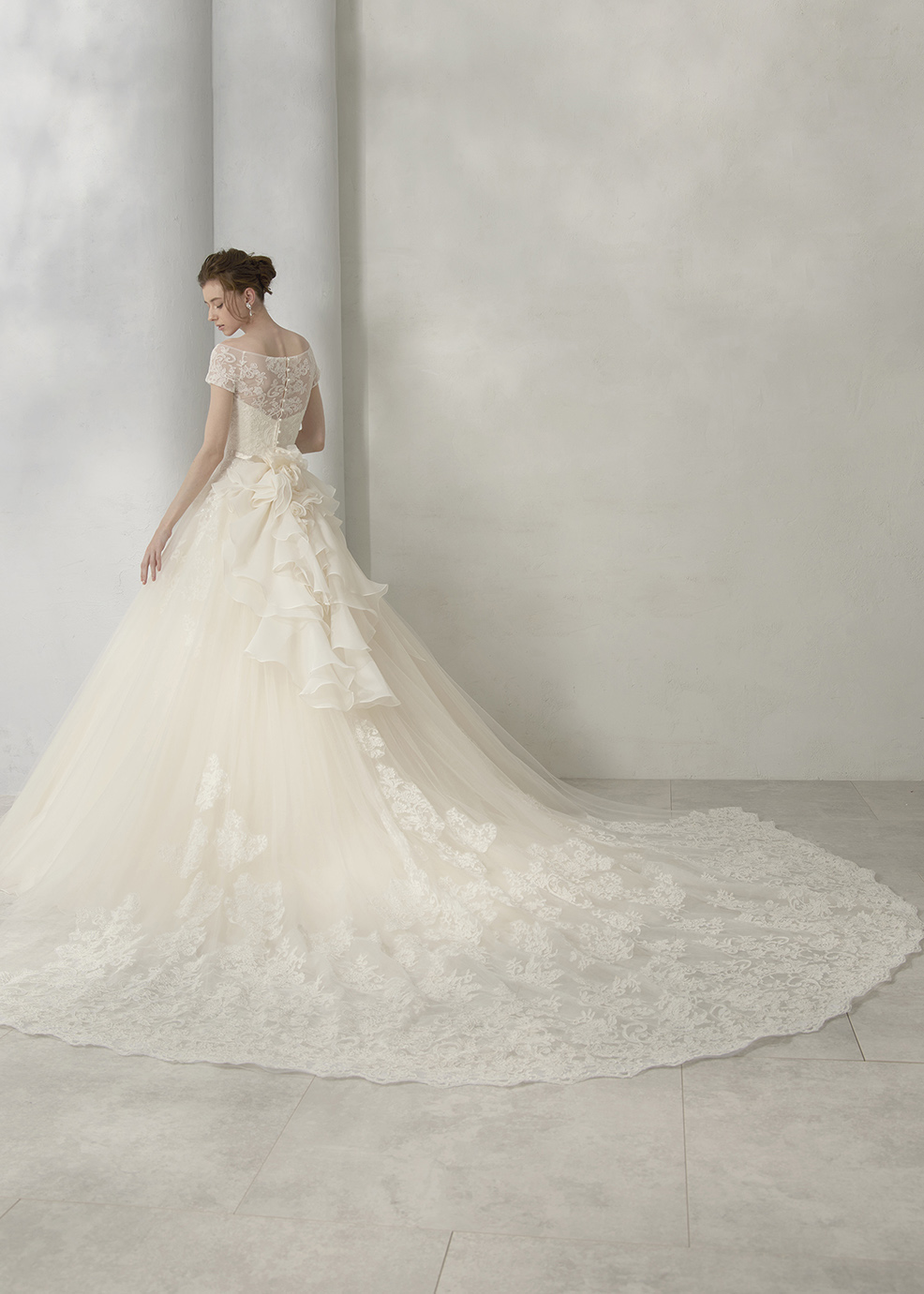 スッキリとしたAラインのチュールスカートに、レースがたっぷりと流れ、高級感のある軽やかスタイル。身頃はデコルテをきれいに包み込むオフショルダーでネックラインをすっきりと見せ、レースの乗せ方を工夫して軽やかな印象に。バックはラッフルが揺れ動くロマンティックなモチーフと、レースたっぷりのロングトレーンで贅沢感たっぷりな1着。