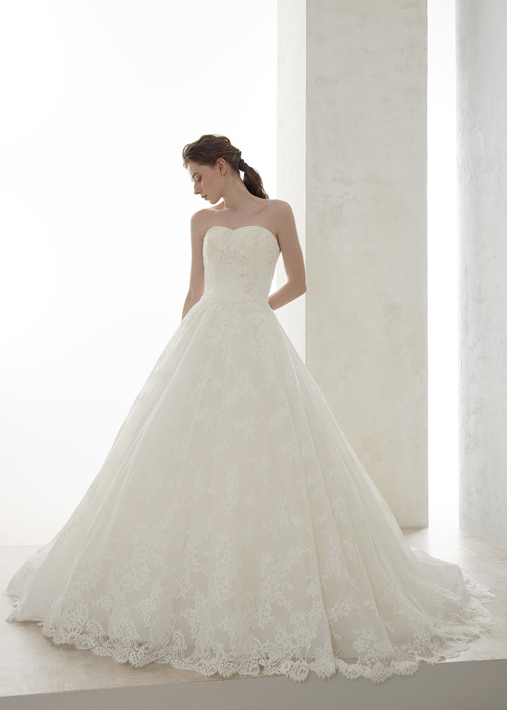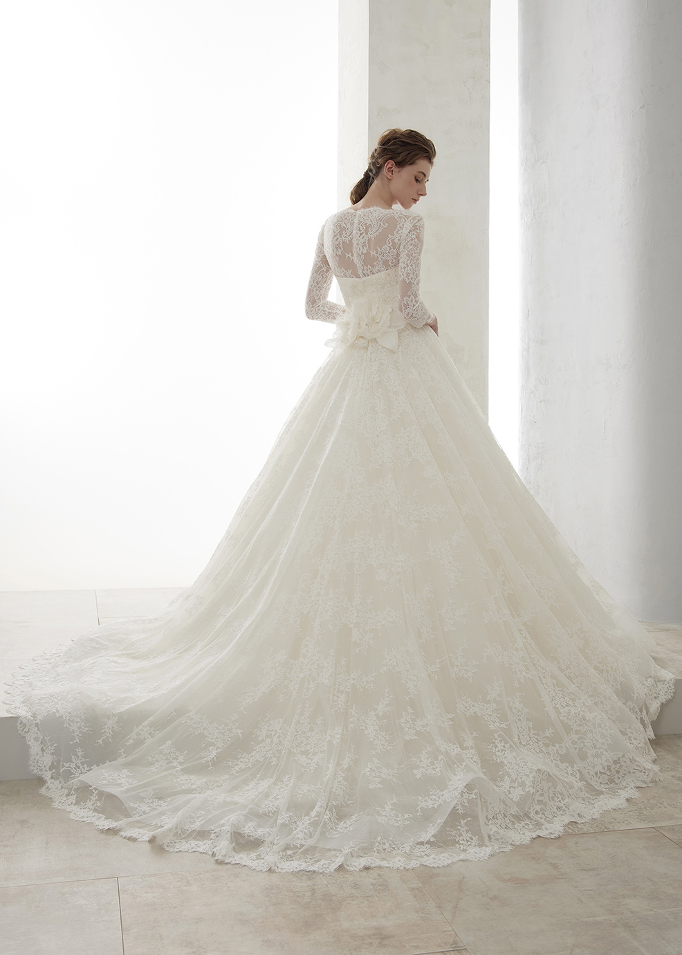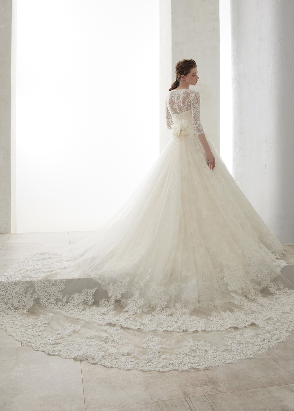 レースのスカートはフレアが波打つようにたっぷりと蹴回しをとり、さらに下に重ねたチュールでボリュームを出したデザイン。クチュールライクなパターンの丁寧な作り込みにより、豪華なシルエットを作り出しています。存在感のある大ぶりなコサージュも華やかにドレスを引き立せます。