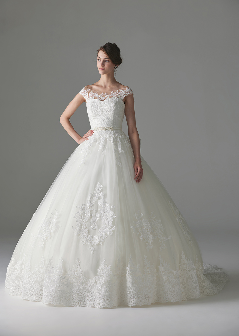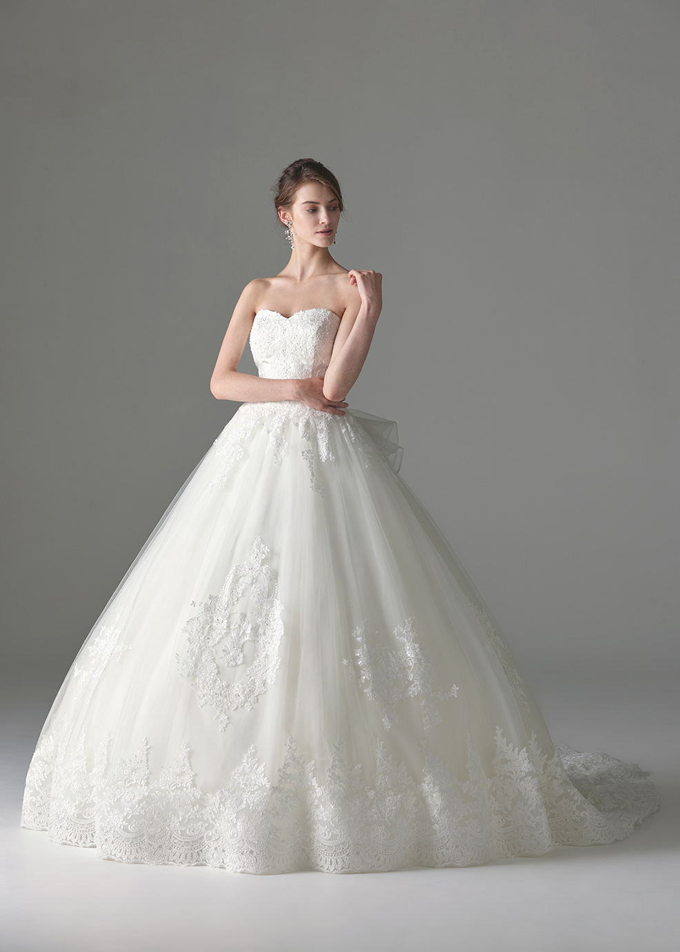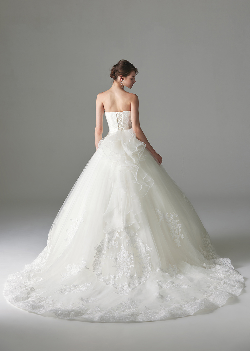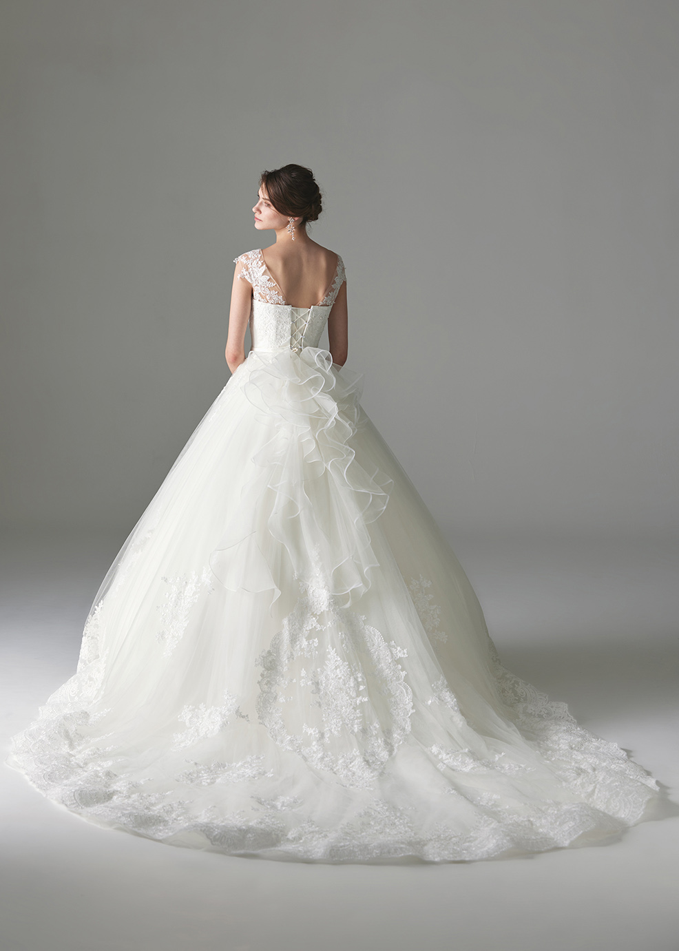 チュールのボリュームラインに幅の広いコードレースを合わせた華やかでエレガントな印象のロングトレーンドレスです。