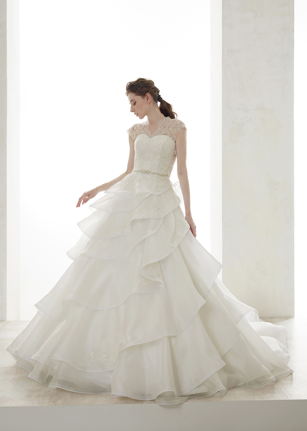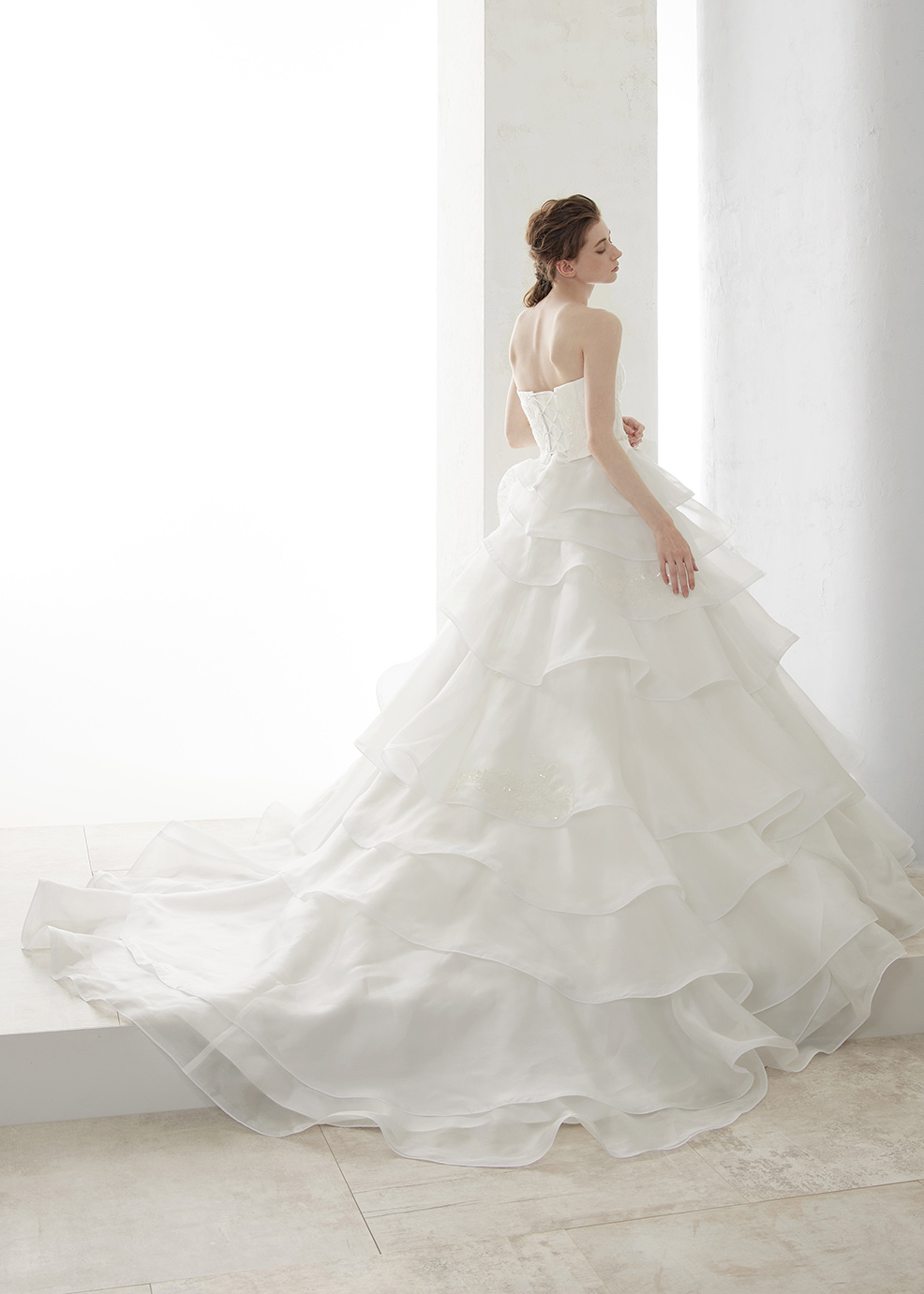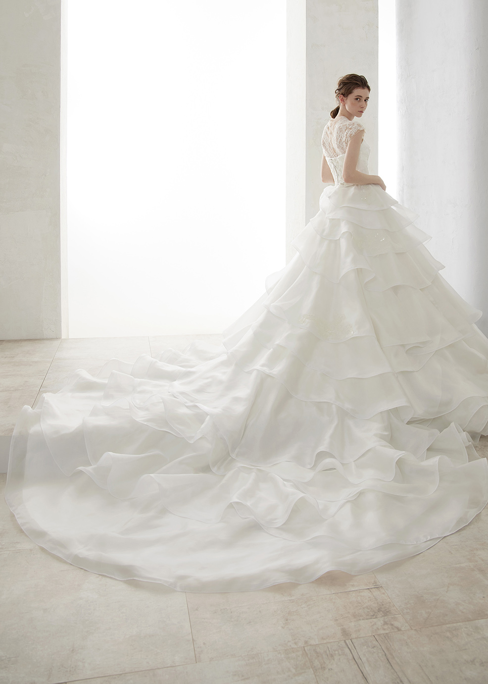 ティアードフリルの豪華なトレーンが特徴のドレスです。身頃は取り外し可能のスタイルで、ビスチェでも楽しめます。身頃のレースは大柄のコード刺繍がポイントになる1着です。大ぶりのフリルはどこにもないスタイルで花嫁を印象的に演出します。もちろんトレーンの長さも調節可能です。