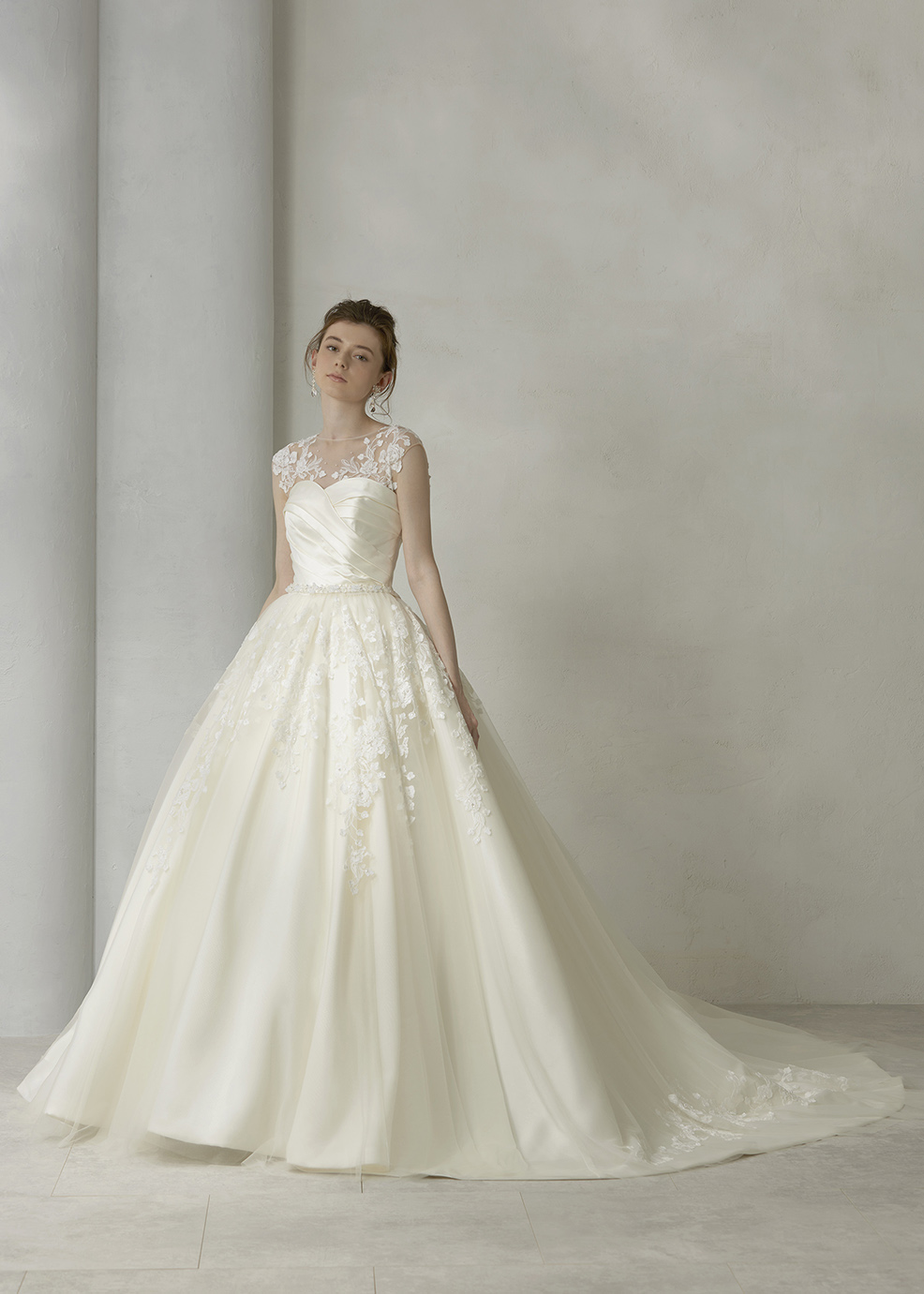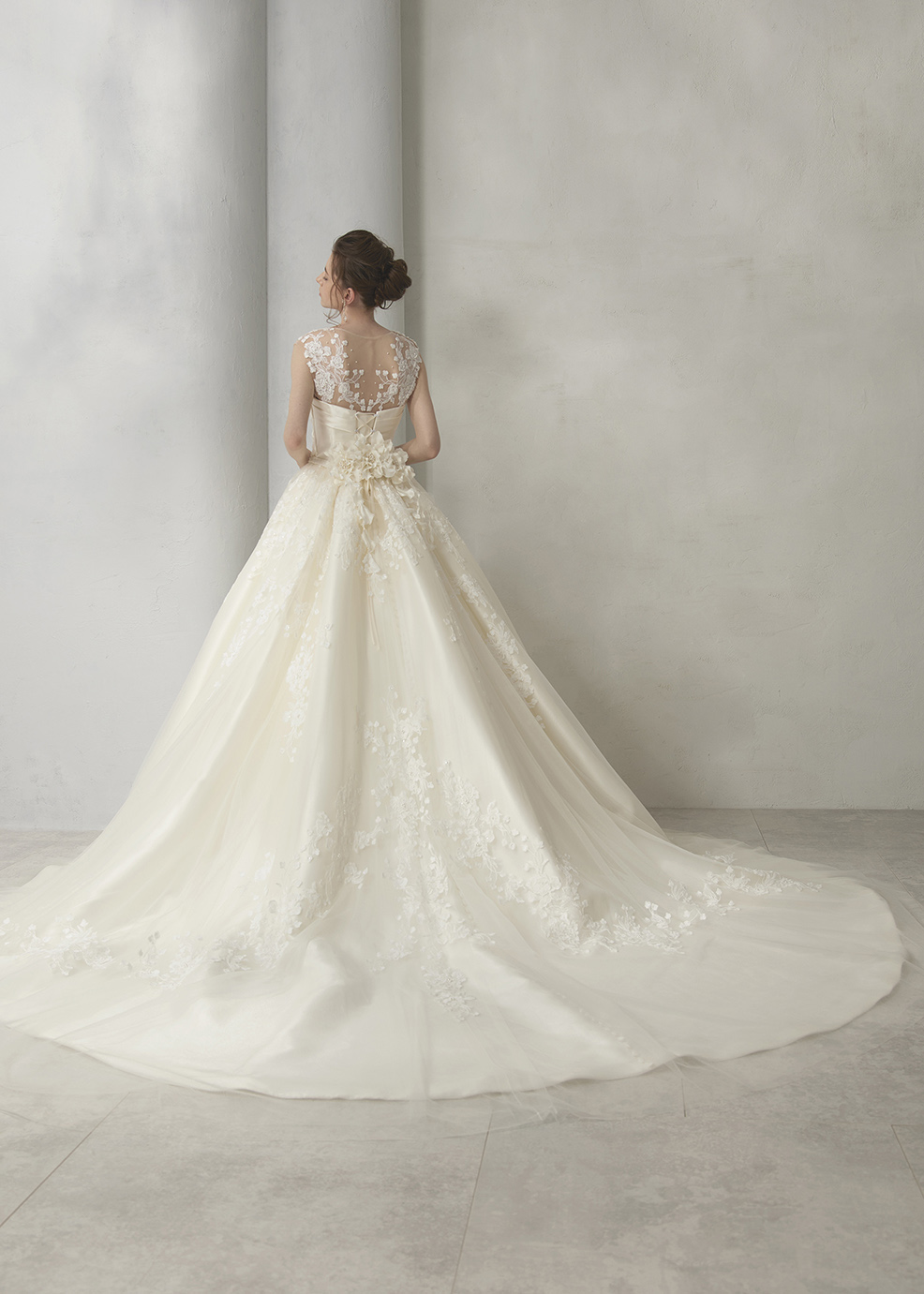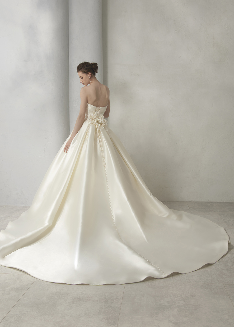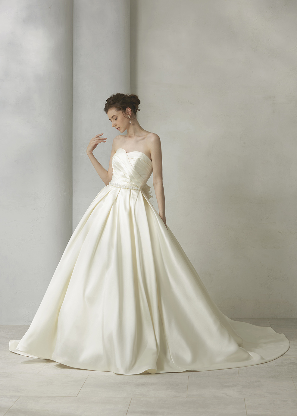 タックドレープで動きをつけたコンパクトな身頃と軽やかなミカドのフレアースカートがスタイリッシュなドレス。後ろスカートのくるみ釦やビジューを合わせたベルトがシンプルな中にも華やかさをプラスしています。フラワーレースモチーフを散らしたチュールのオーバースカートを合わせると軽やかでロマンティックにスタイルチェンジができます。