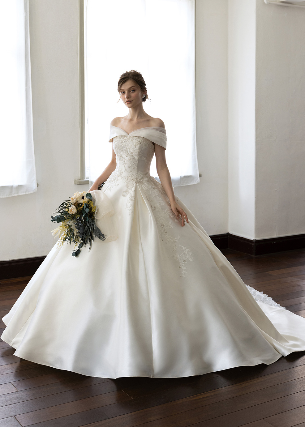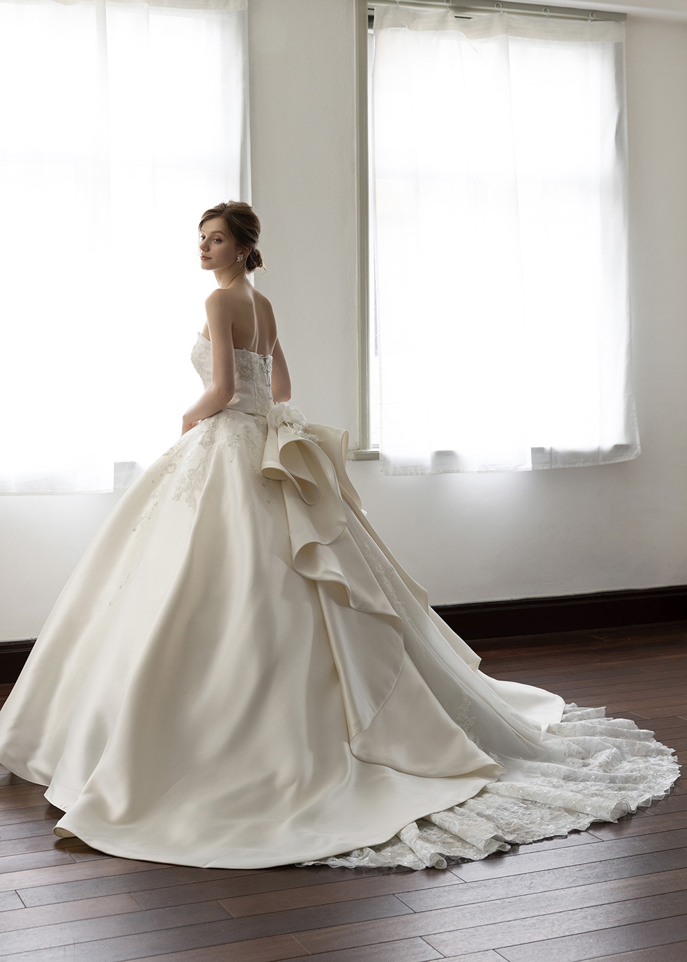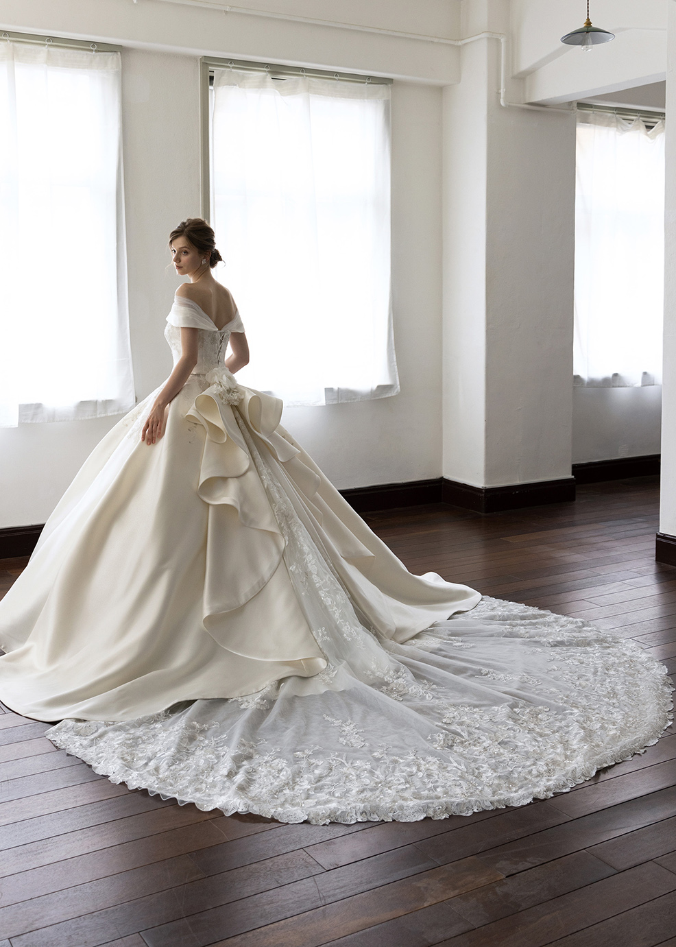 王道ながらもレースの柄や配置にこだわり新しさを感じられるドレス。レースは線画で描いたような繊細な花柄。流れやメリハリを意識し、何処から見ても表情豊かです。オフショルダーのヨークはロールカラー風のお袖にチュールが重なっているデザインで今まであまりなかったような新しさを取り入れました。バックデザインは大きなカスケード状になっていて、ホワイトブーケをイメージした造花が付いています。トレーンは式の際、花嫁様が通った瞬間に花々が芽吹き咲いてくようなイメージでレース配置をしました。レースに銀糸が混ざっているのでより柄の陰影が美しく見えると思います。