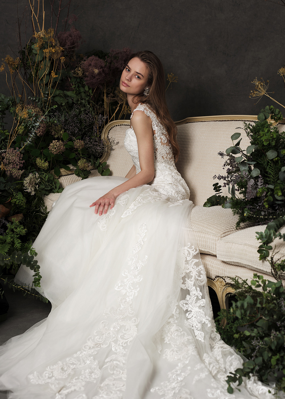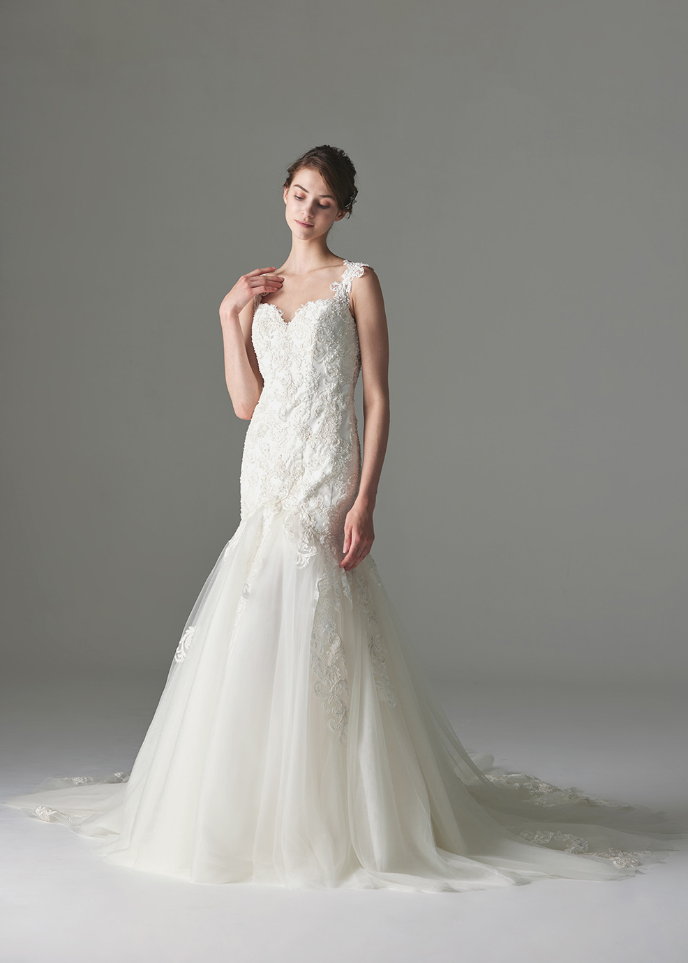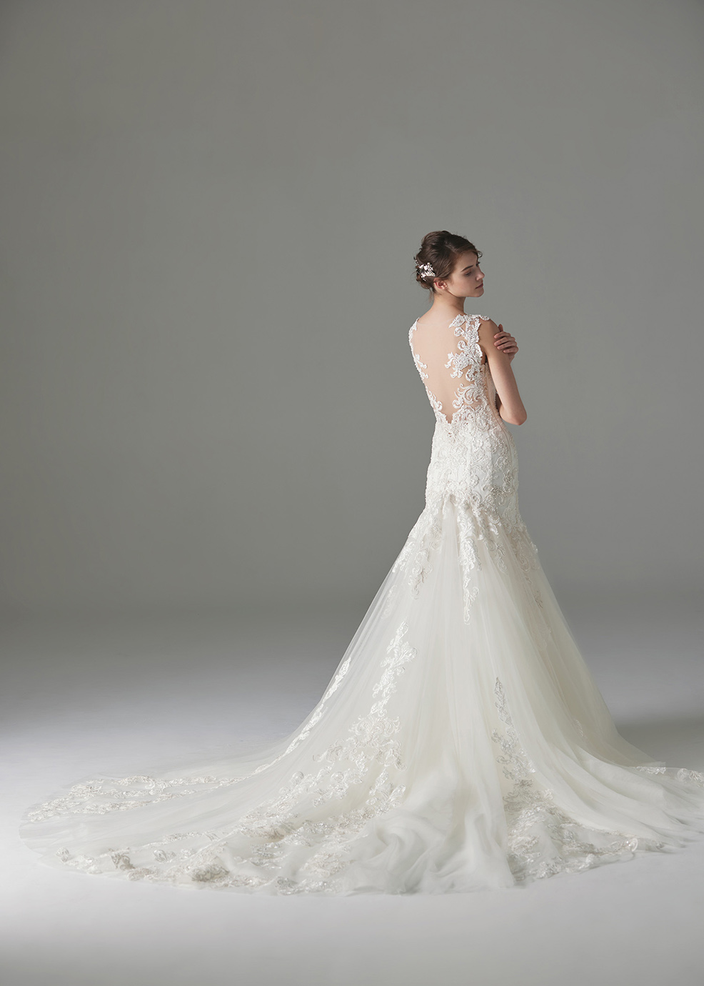 ネックラインや背中を美しく見せる大胆な攻めのマーメイドスタイル。クラシカルなコードレースがボディラインを纏い、セクシーでいて上品な印象に。ボリュームのあるチュールスカートにロングトレーンの裾から立ち上がるレース等、体のラインに沿う身頃との対比でスタイルをよく見せ、後ろ姿を豪華に演出します。
