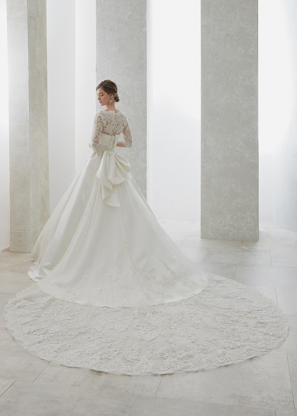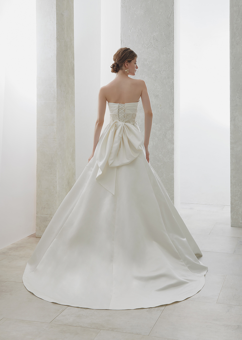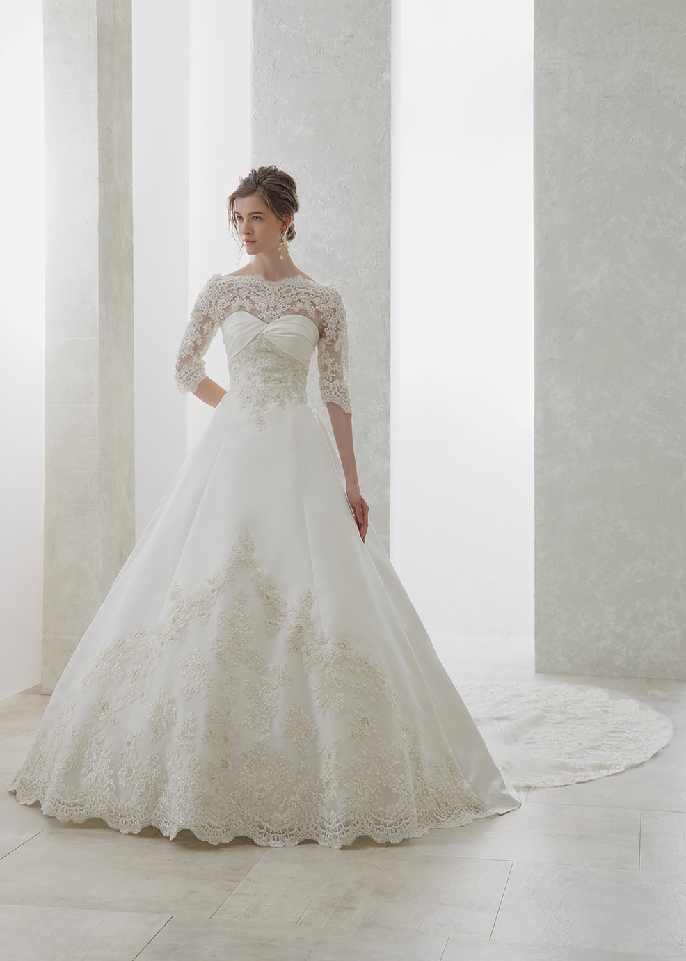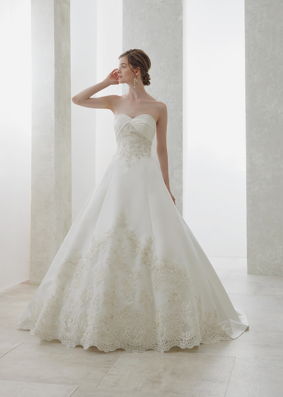 淡いアイボリーとゴールドのレースが陰影を作りシンプルなAラインのスカートに華やぎを与えます。ドレープ仕立てのベアトップデザインは七分丈のオフショルダーヨークを合わせるとは全く違った表情で2WAYを楽しむ事が出来、気になる二の腕をさりげなくカバーします。