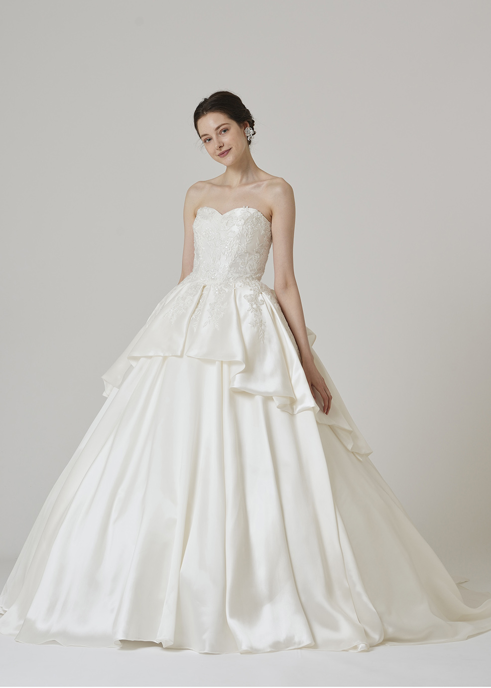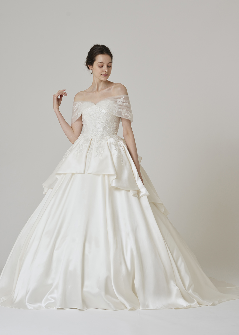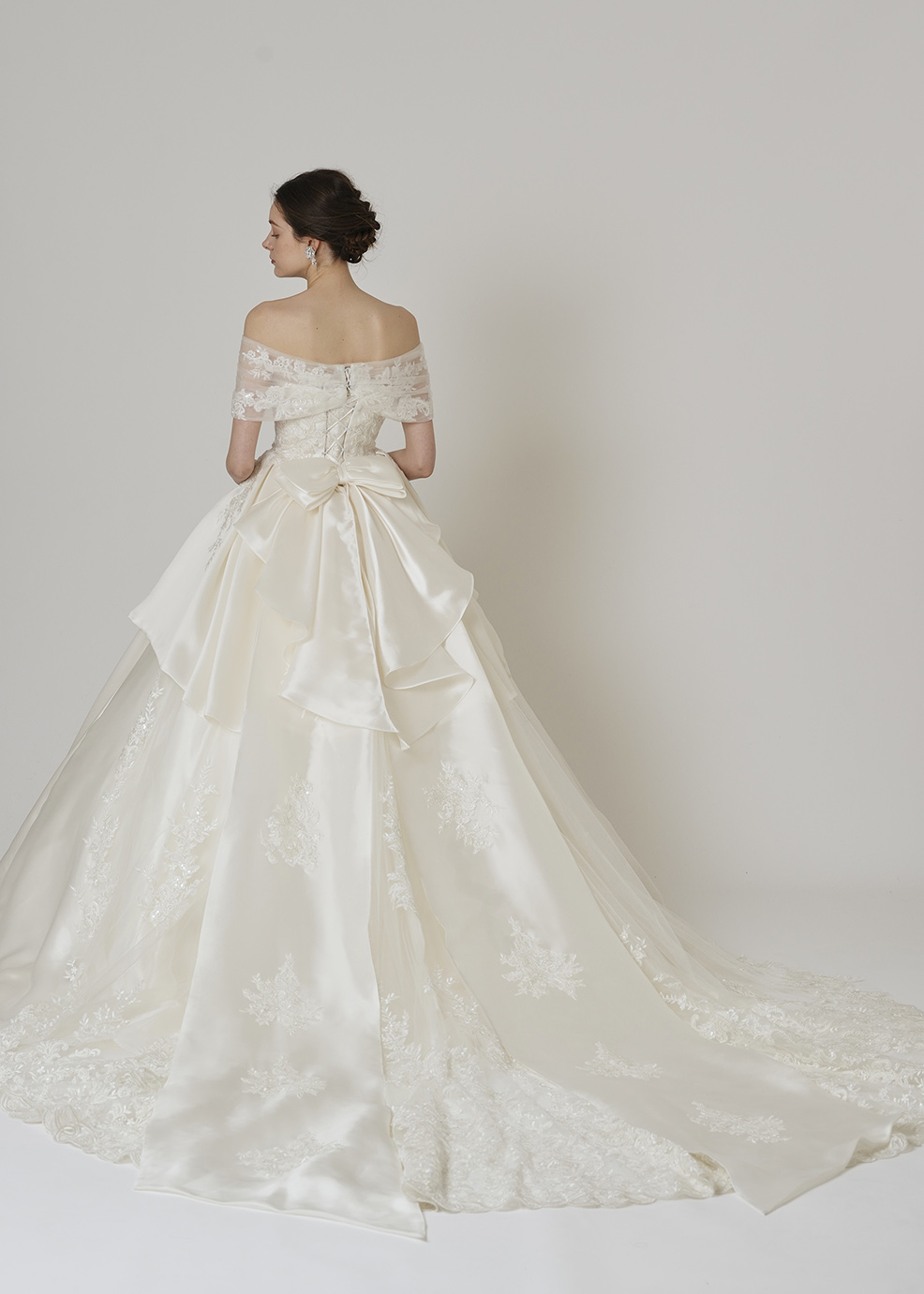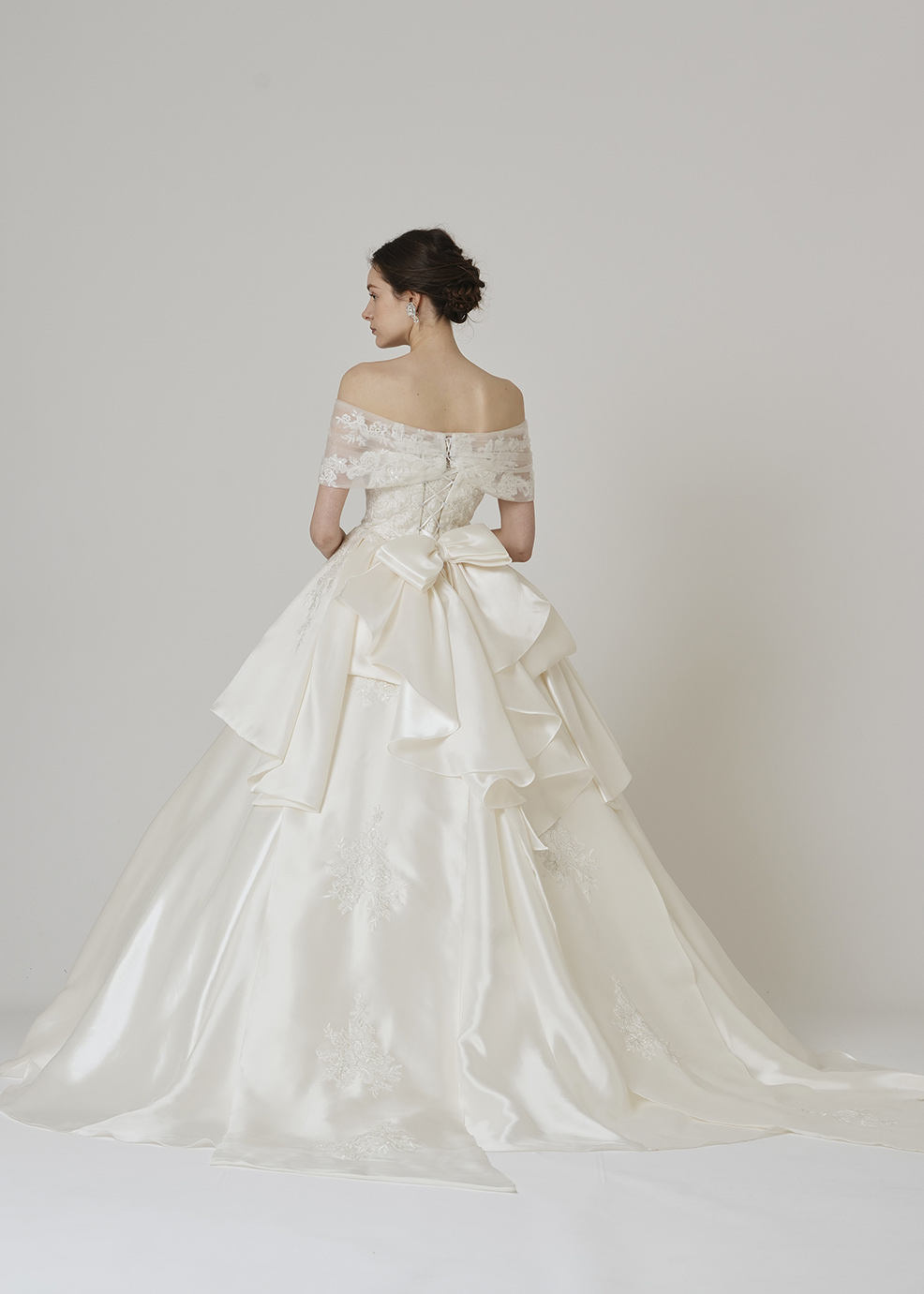 ペプラムデザインが新しいドレス。インパクトのあるバックリボンから広がる、贅沢にレースをあしらったトレーンが豪華な印象を与えてくれます。トレーンとオフショルダーは取り外し可能、リボンの長さは調節ができ様々な着こなしが出来ます。