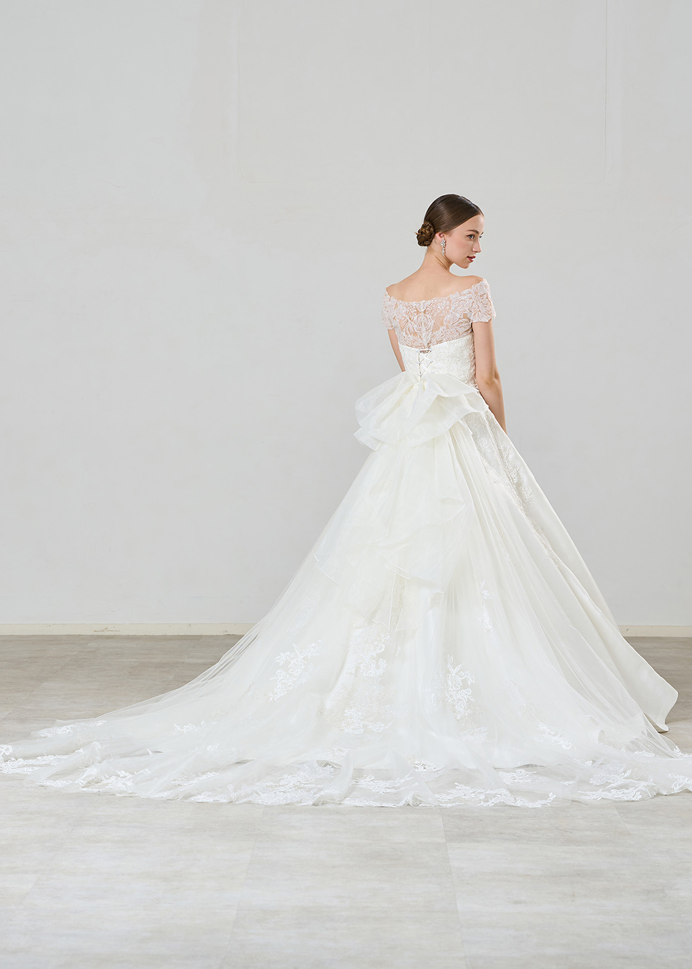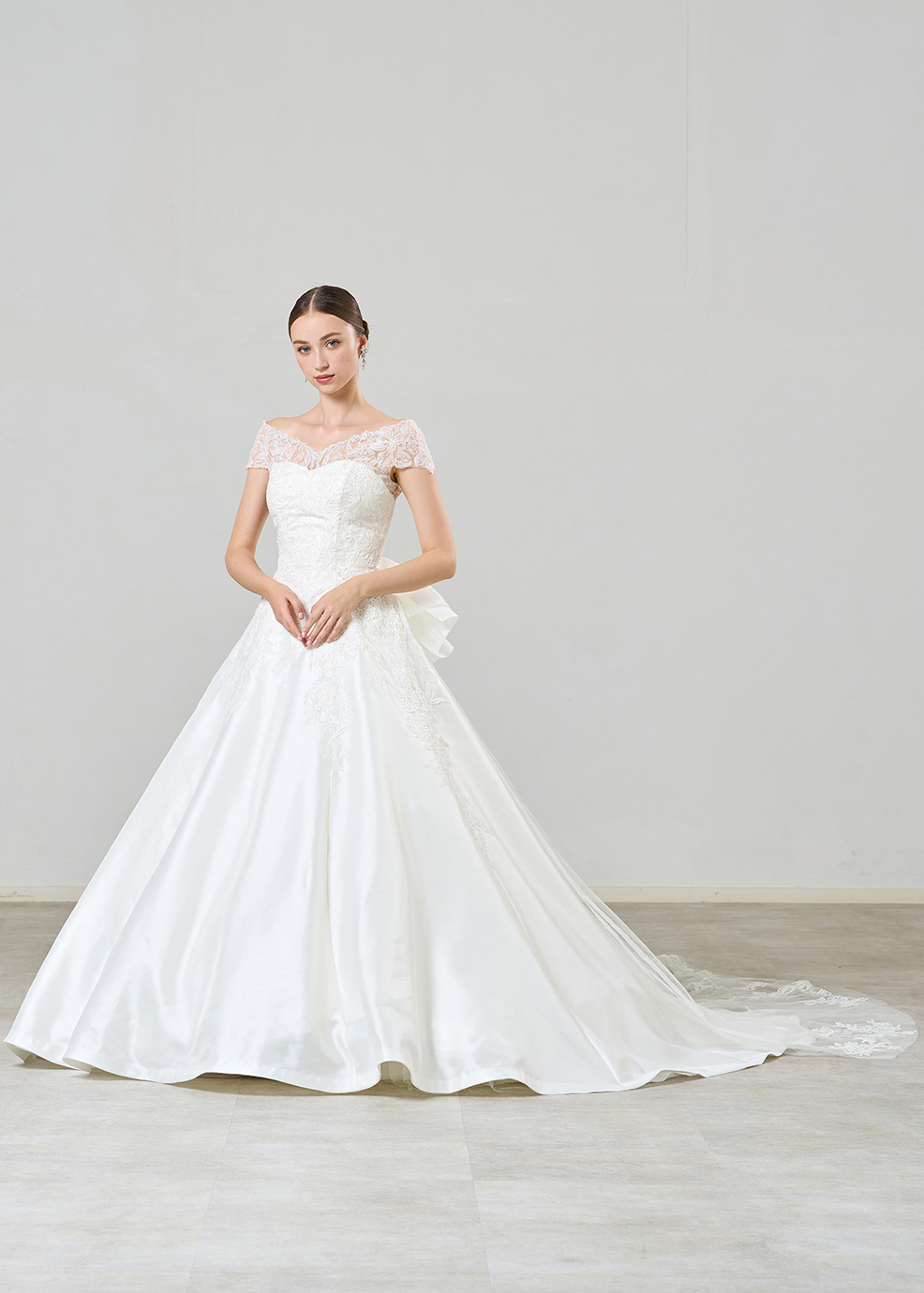 透明感ときらめきあふれるグリッターレースと繊細な柄のコードレースをあしらった王道ドレス。