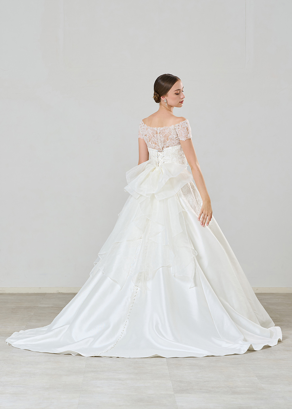 バックリボンはオーガンジーのふんわりしたシルエットが、ドレスに柔らかさと可愛らしい印象を与えてくれます。