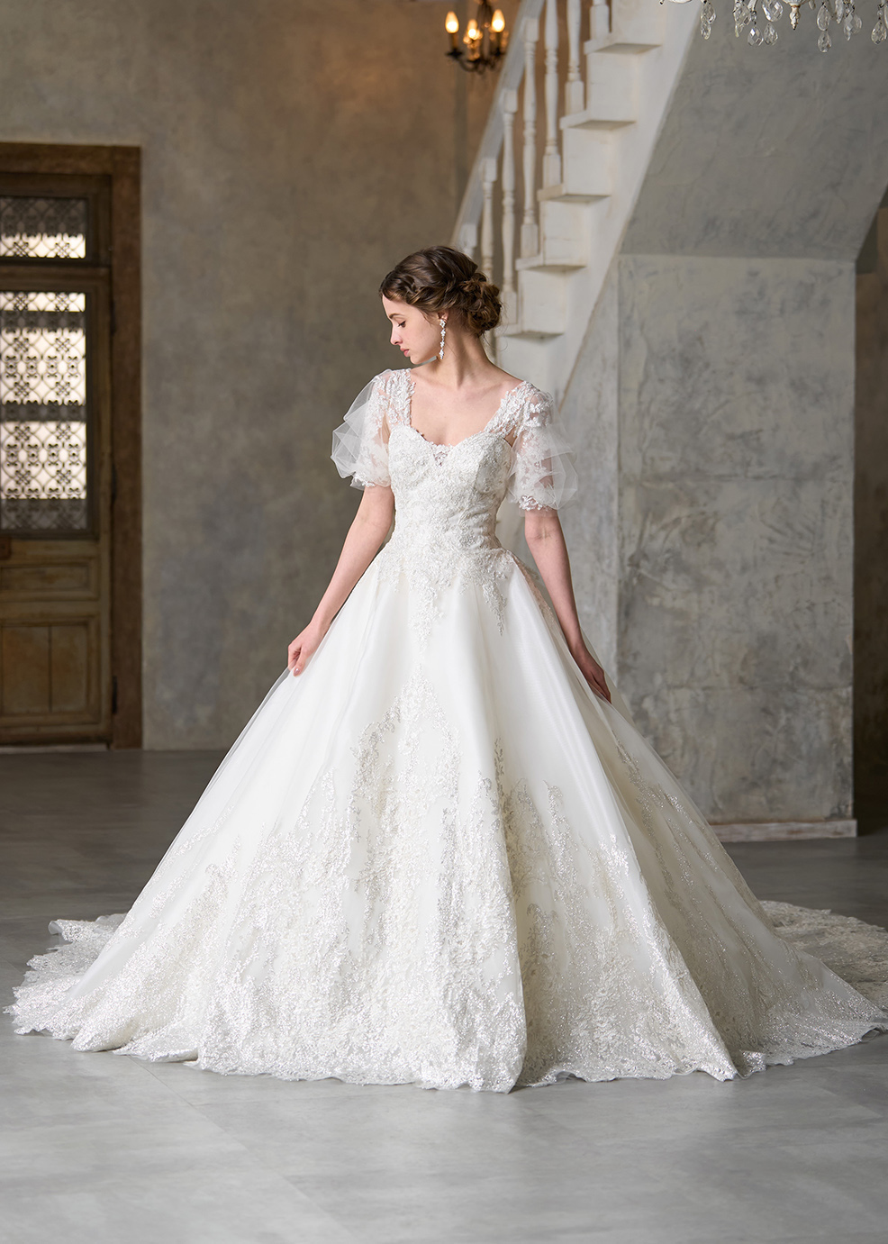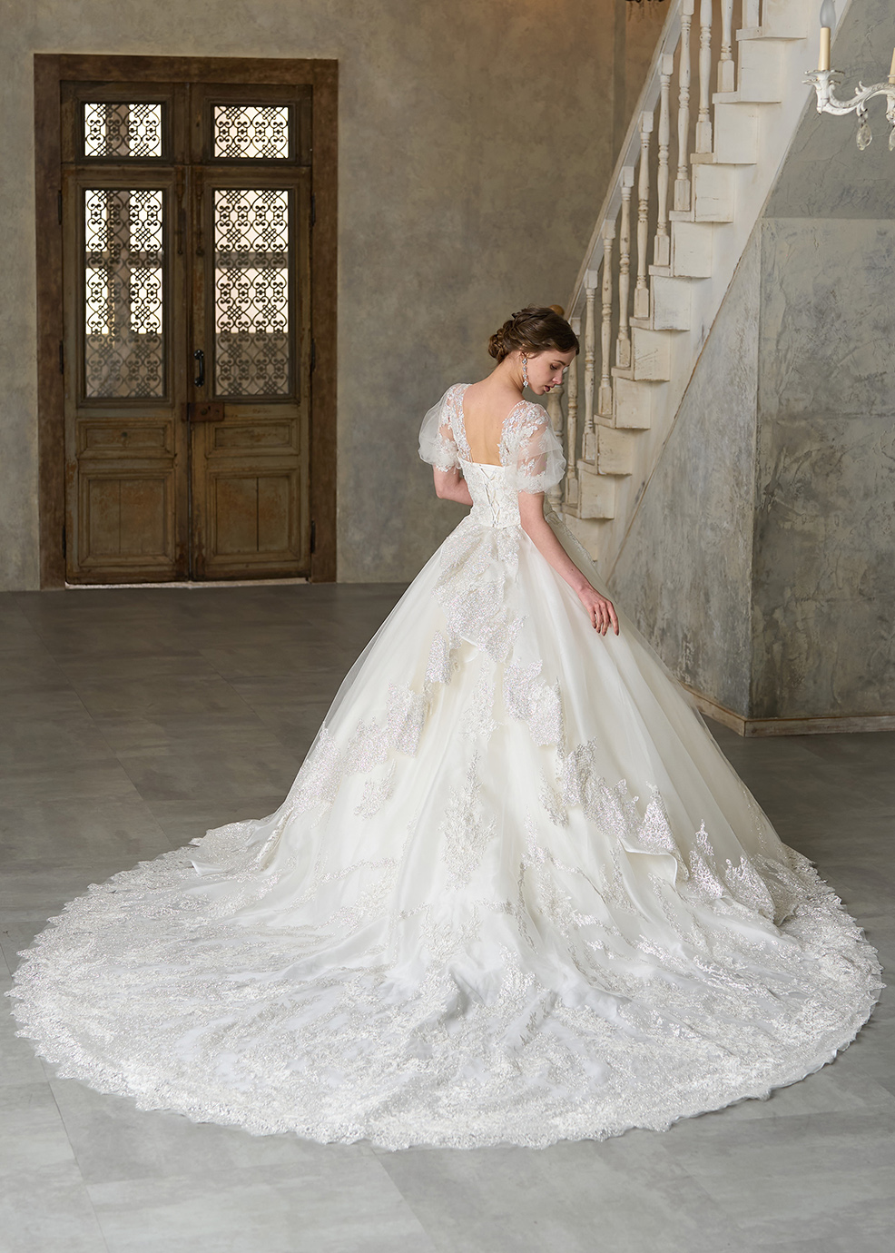 旬のブラウジングスリーブとグリッターレースの軽やかキラキラ王道ドレス。ブラウジングスリーブが上品に気になる二の腕をカバー。グリッターとレースを合わせて複雑な柄を作りキラキラで豪華な印象に仕上げました。